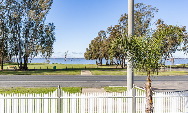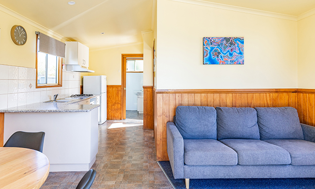Soak up views over Lake Mulwala while relaxing on the veranda of this two bedroom cabin. One queen and two single bunks. Featuring air-conditioning; kitchen including small stovetop and convection oven, microwave and fridge; bathroom; lounge and dining area for 4; TV; covered veranda with outdoor setting.