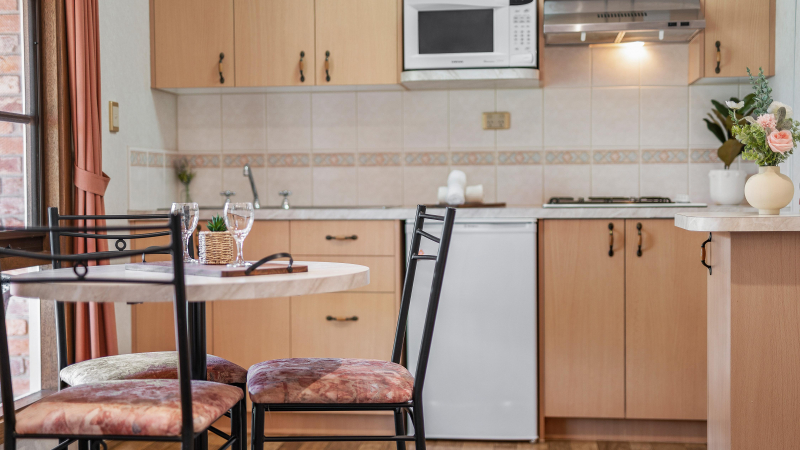 Our Riverfront Studio Units, are designed for couples. They consist of a queen bed, ensuite, self contained kitchen, dining, lounge seating with TV & DVD. All linen and towels supplied.