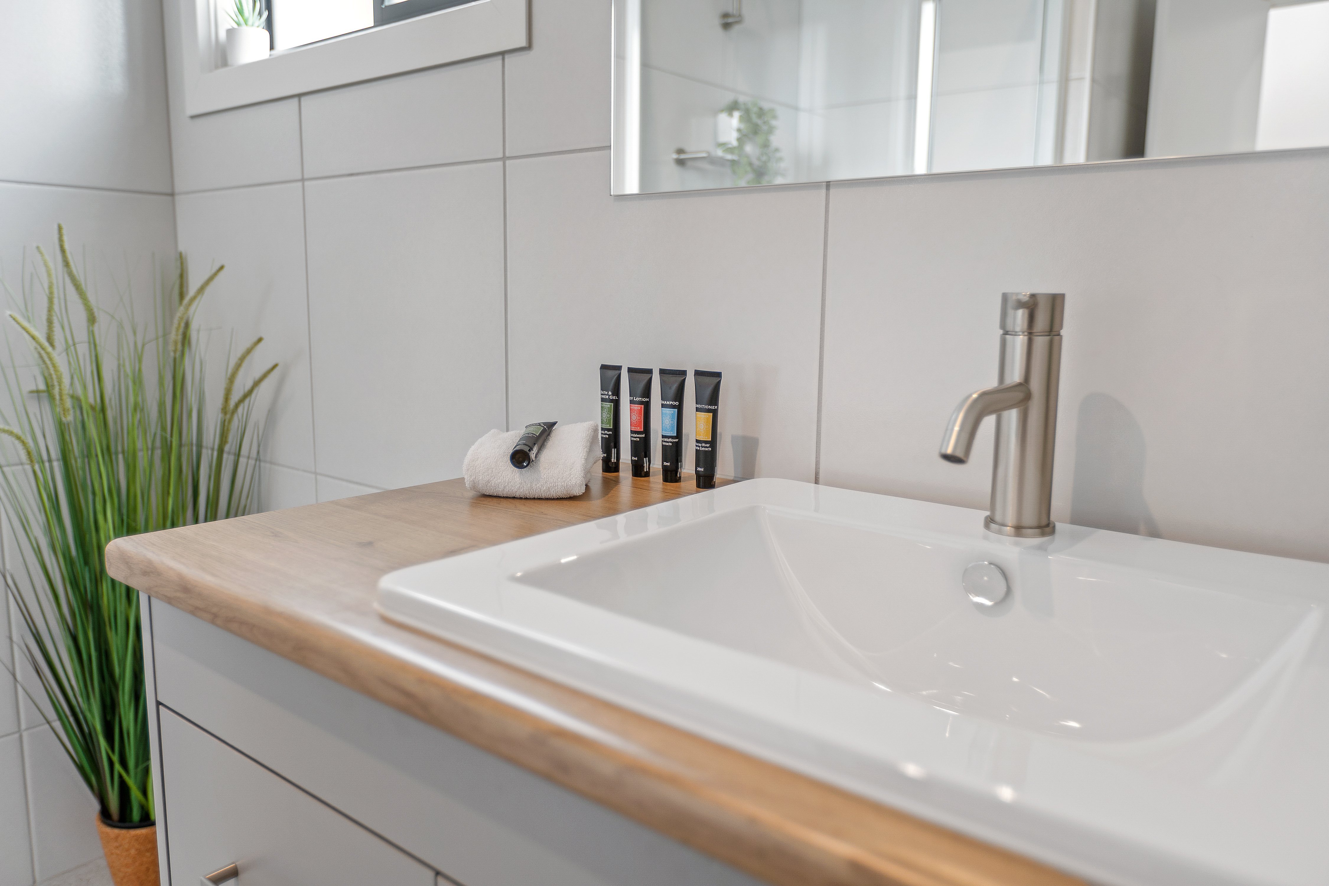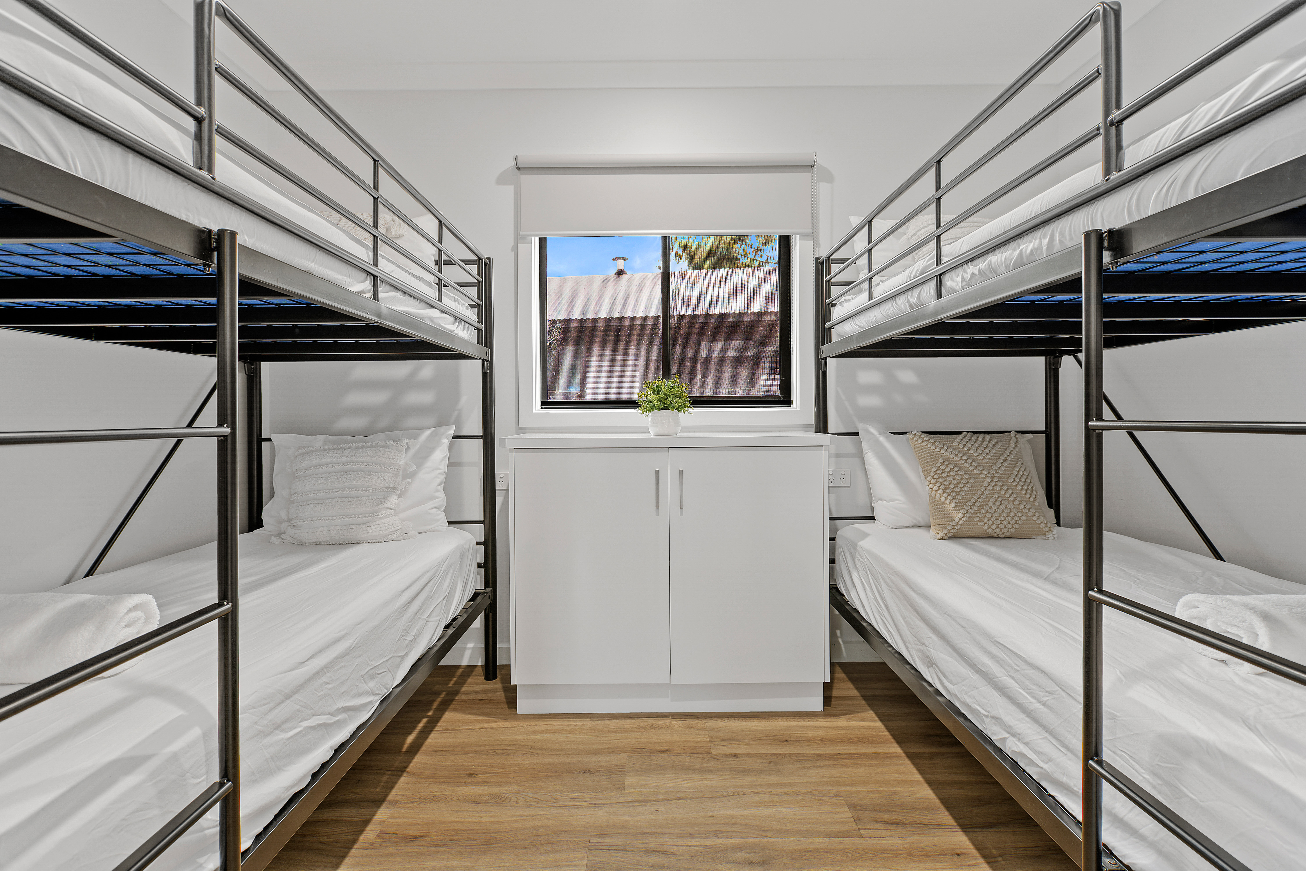 They are fully self-contained with two bathrooms. The master bedroom has a king bed with ensuite and the second bedroom has a queen bed, the third bedroom has a double bunk with a trundle bed. The living/dining/kitchen area is very large boasting full kitchen and laundry area.