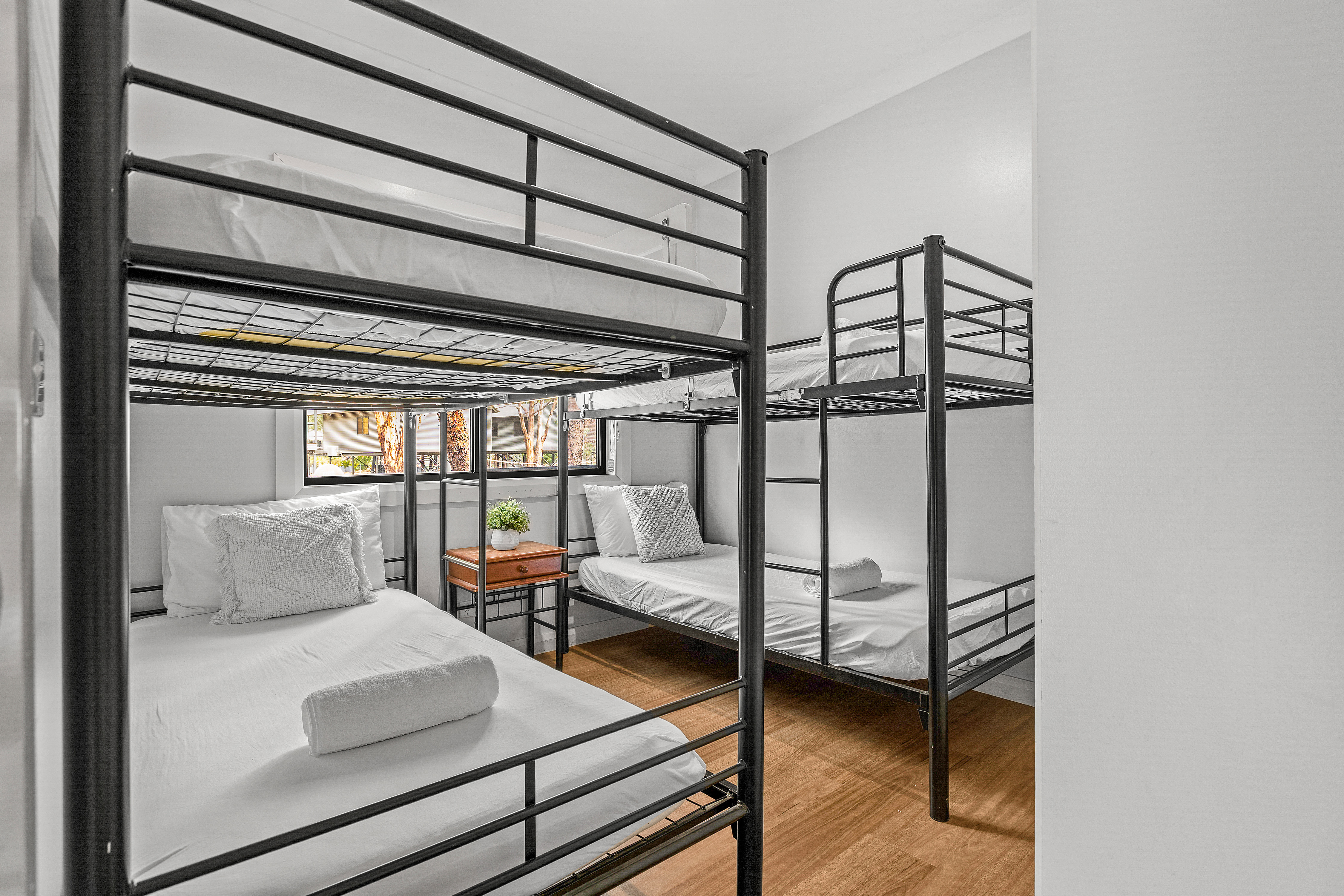 All two bedroom villas can accommodate up to six guests with a queen bed in the main bedroom and two sets of bunks in the second bedroom (this bedroom will not fit a port a cot but main bedroom will).