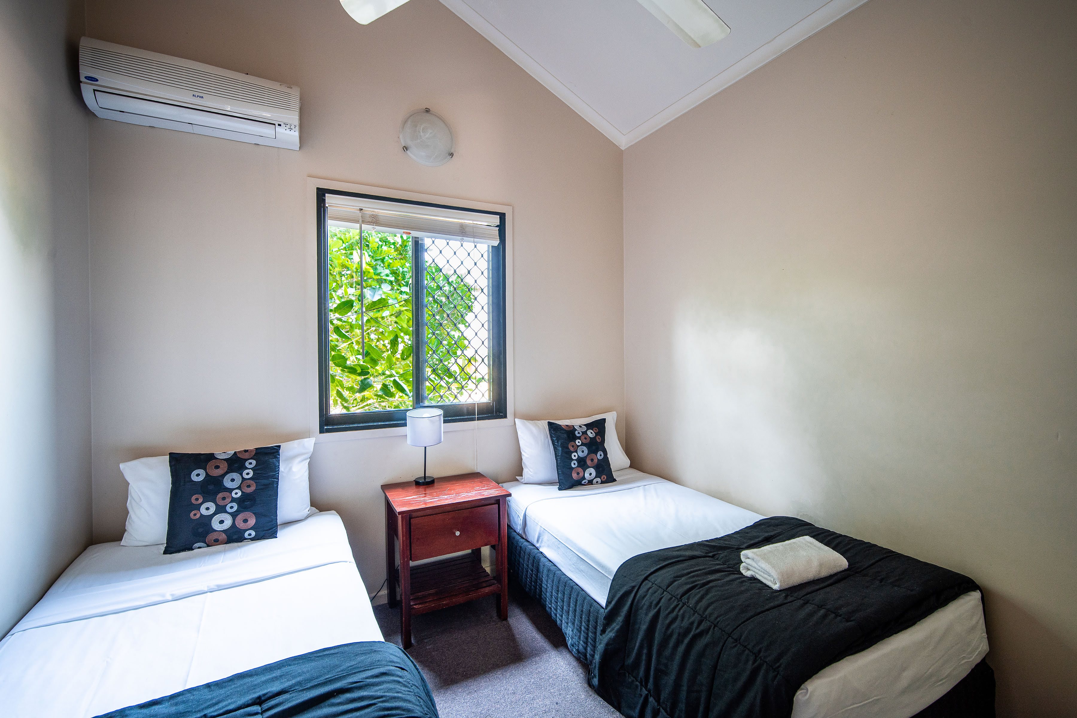 The main bedroom will have either a king-sized bed that can be split into two singles or a Queen bed. This is based on availability so please be sure to list your preference when booking. The two single beds in the second bedroom can also be made into a king-sized bed if required. We provide all your linen and towels and when you stay longer than seven days, your room will be serviced. Our Villas all have modern bathrooms and complimentary toiletries are provided for your convenience. Each Villa has its own timber patio overlooking the beautifully landscaped gardens. A perfect place for you to relax and unwind.