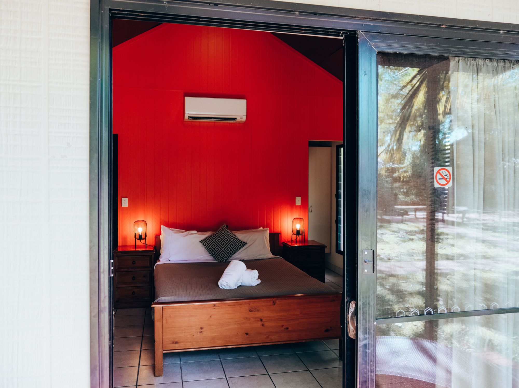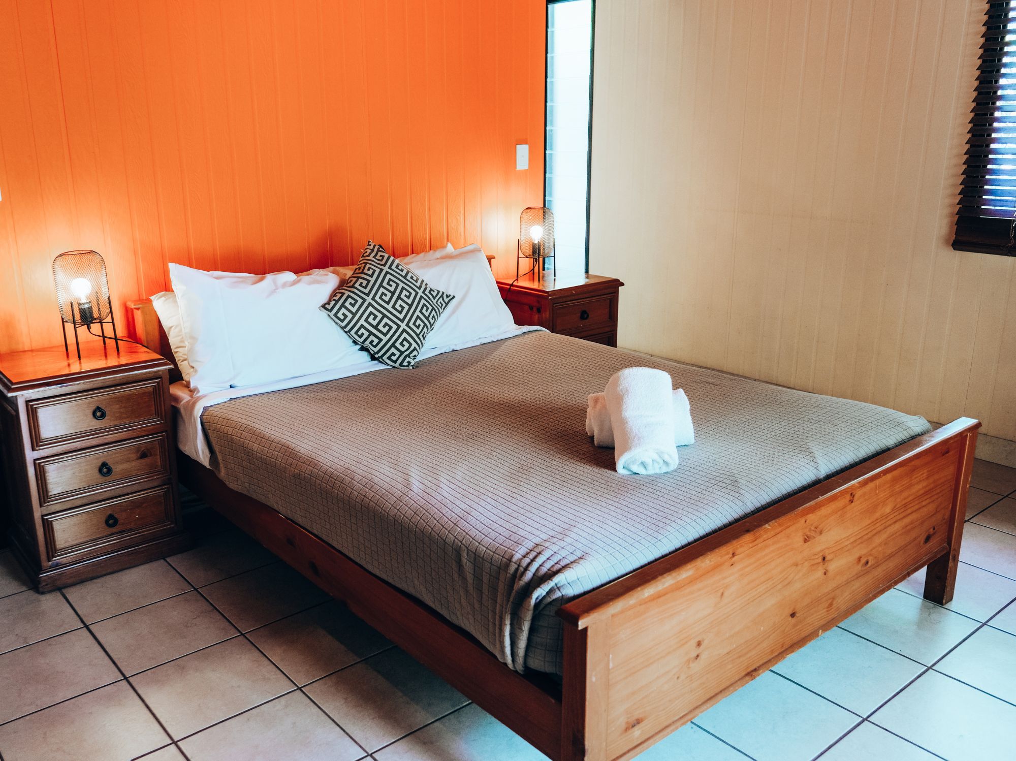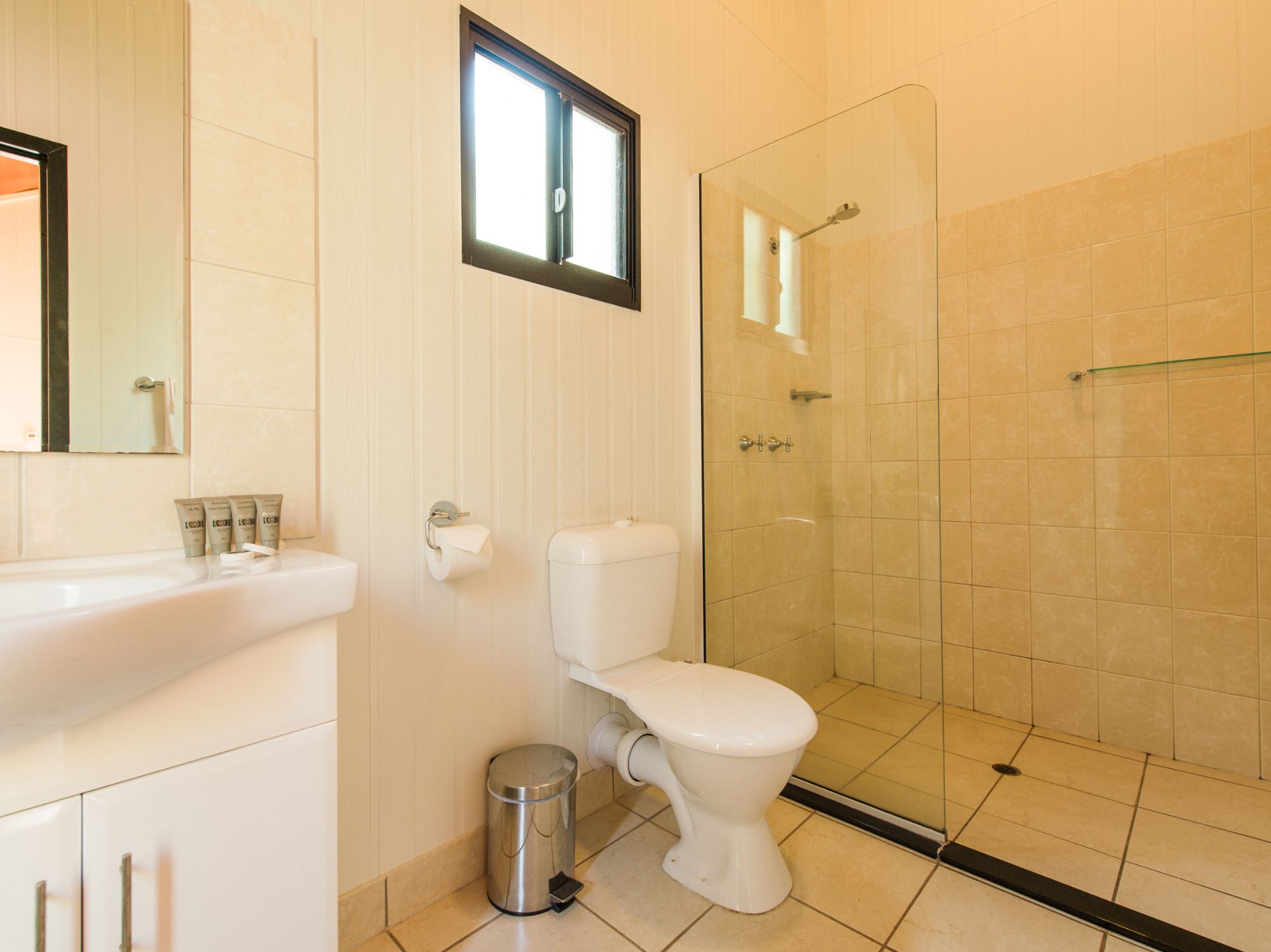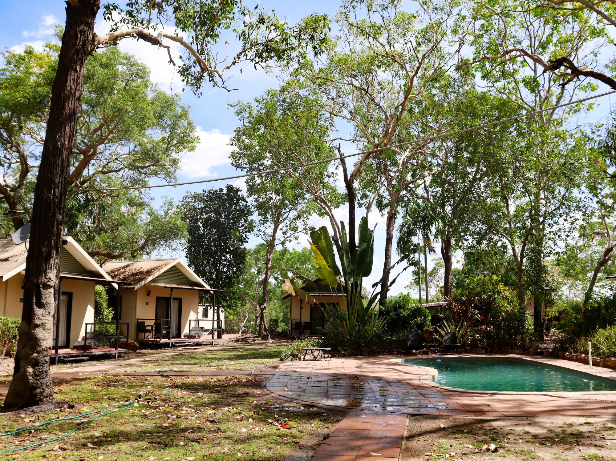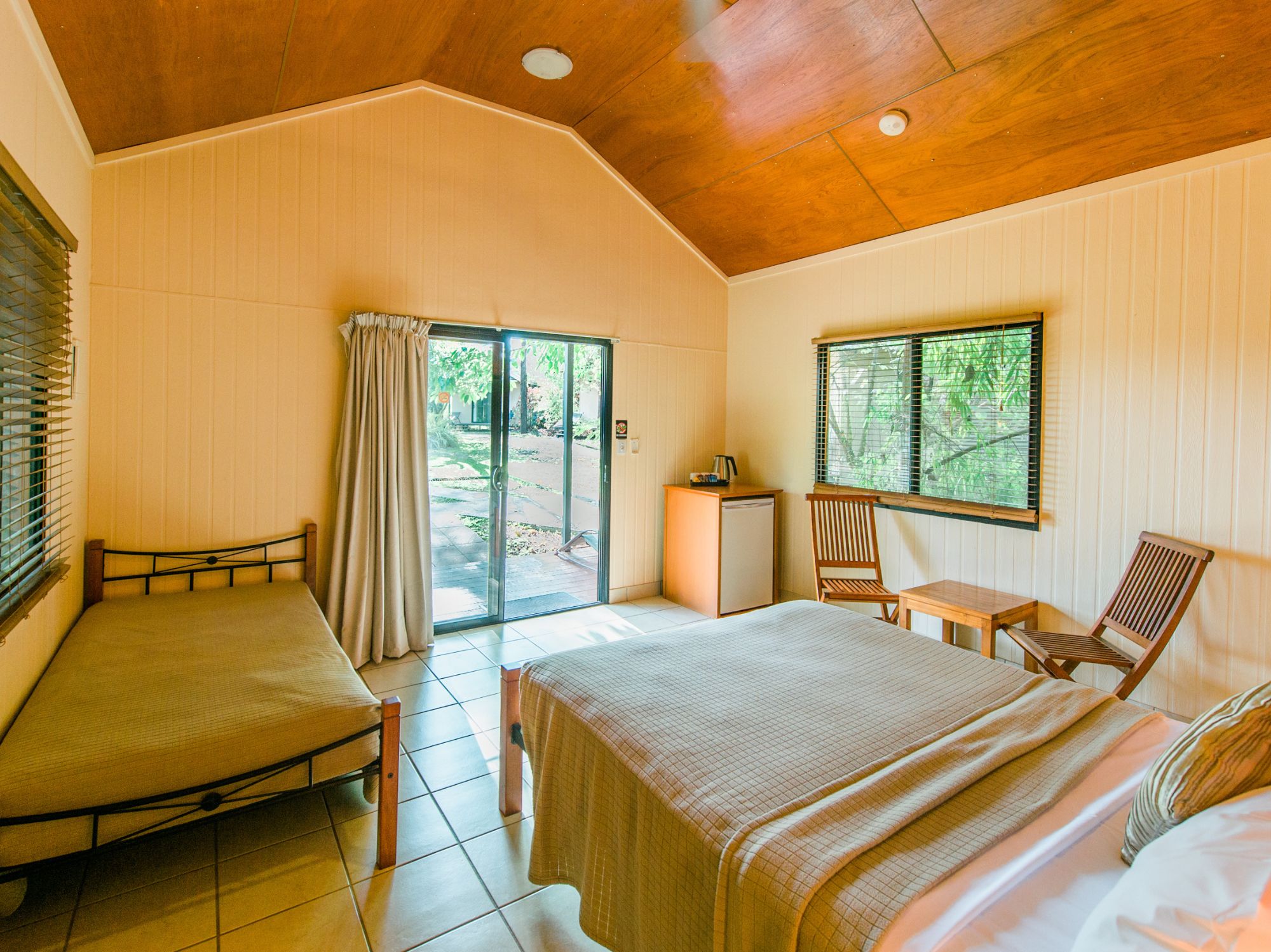 The poolside bungalows feature cathedral ceilings are fully tiled throughout and have large ensuites. They are modern cool comfortable and clean. All have a queen-sized bed. They are equipped with wardrobes, a bar fridge, tea and coffee-making facilities, ceiling fan and air-conditioning and all have a balcony overlooking the secluded pool area.