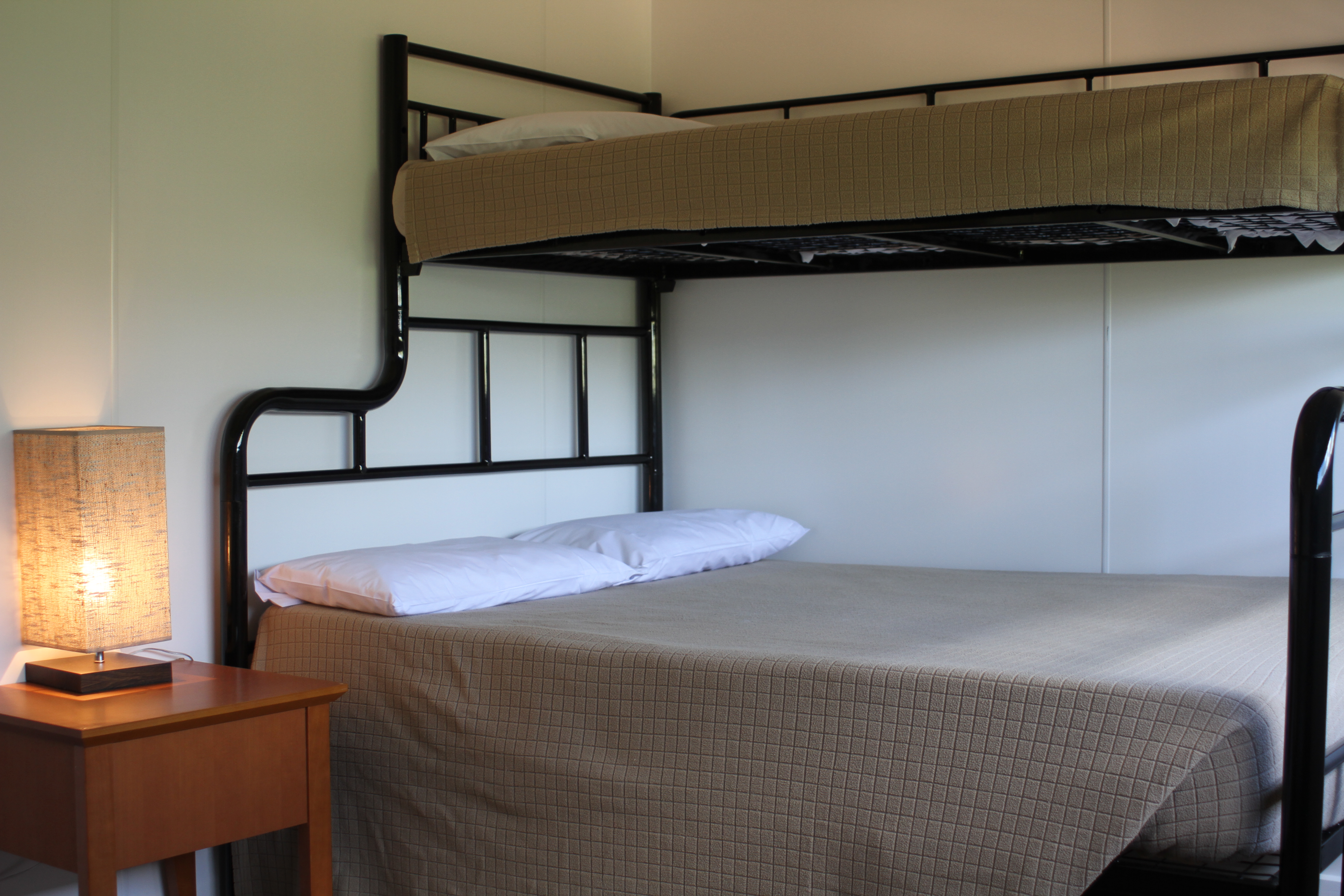 The two-bedroom bush bungalow has a queen-size bed and an additional room with one single bed and a tri-bunk, comfortably sleeping six people. It is equipped with a larger fridge, and a car space behind it and is close to the camper’s kitchen.
