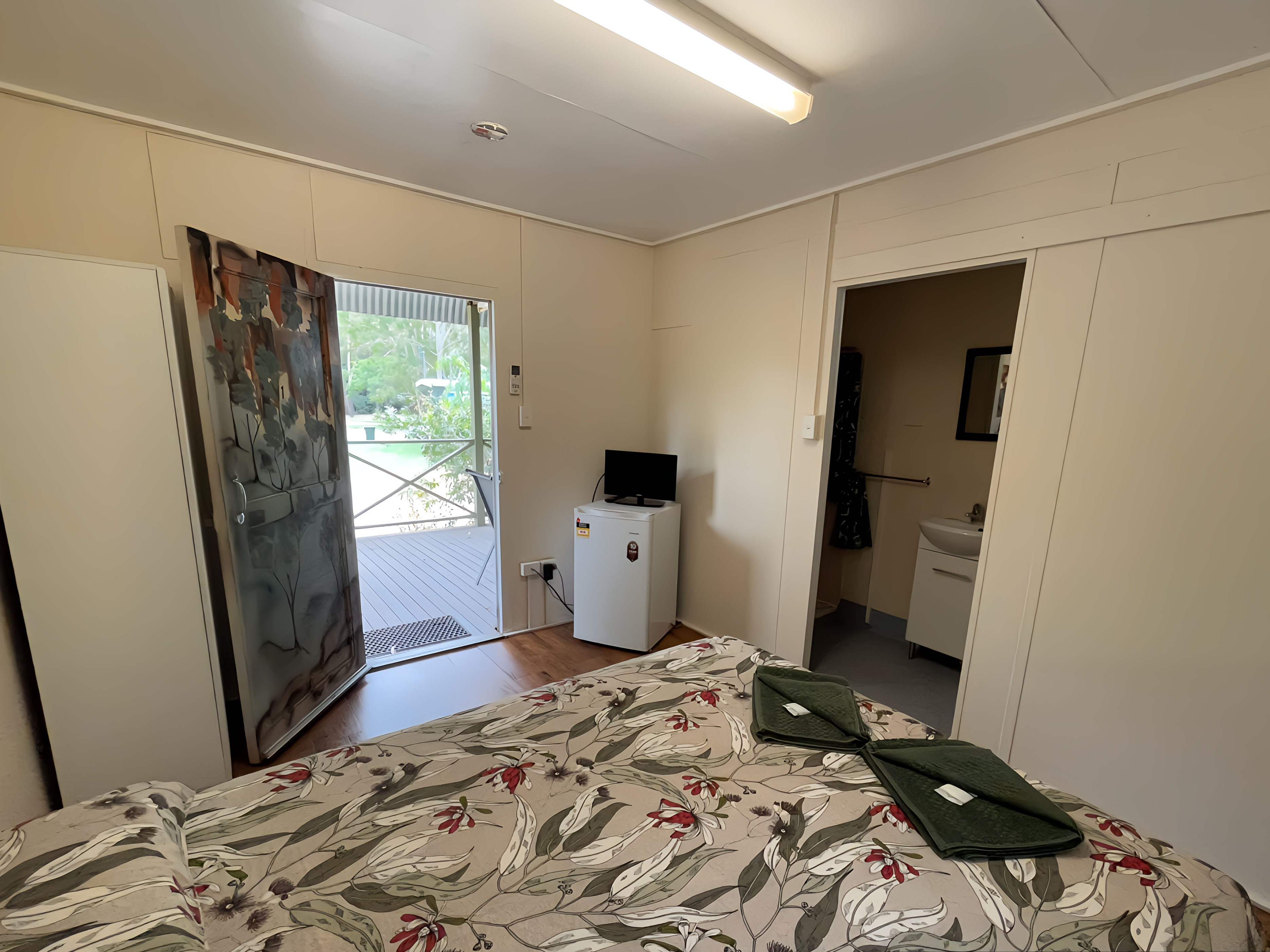 Welcome to our One Bedroom Cabin at Cania Gorge Tourist Retreat! These cabins offer the perfect retreat for couples or solo travelers seeking comfort and relaxation. Each cabin features a spacious bedroom with a comfortable queen bed, ensuring a restful night's sleep. You'll also find an ensuite bathroom with a shower and toilet for your convenience. Stay comfortable year-round with the air conditioning, and unwind in the cozy cabin while enjoying the television. The cabin is equipped with tea/coffee facilities and a bar fridge, allowing you to enjoy your favorite hot beverages and keep refreshments chilled. Step out onto the large veranda, complete with a table and chairs, and soak in the serene surroundings. Experience a tranquil and rejuvenating stay in our One Bedroom Cabins at Cania Gorge.