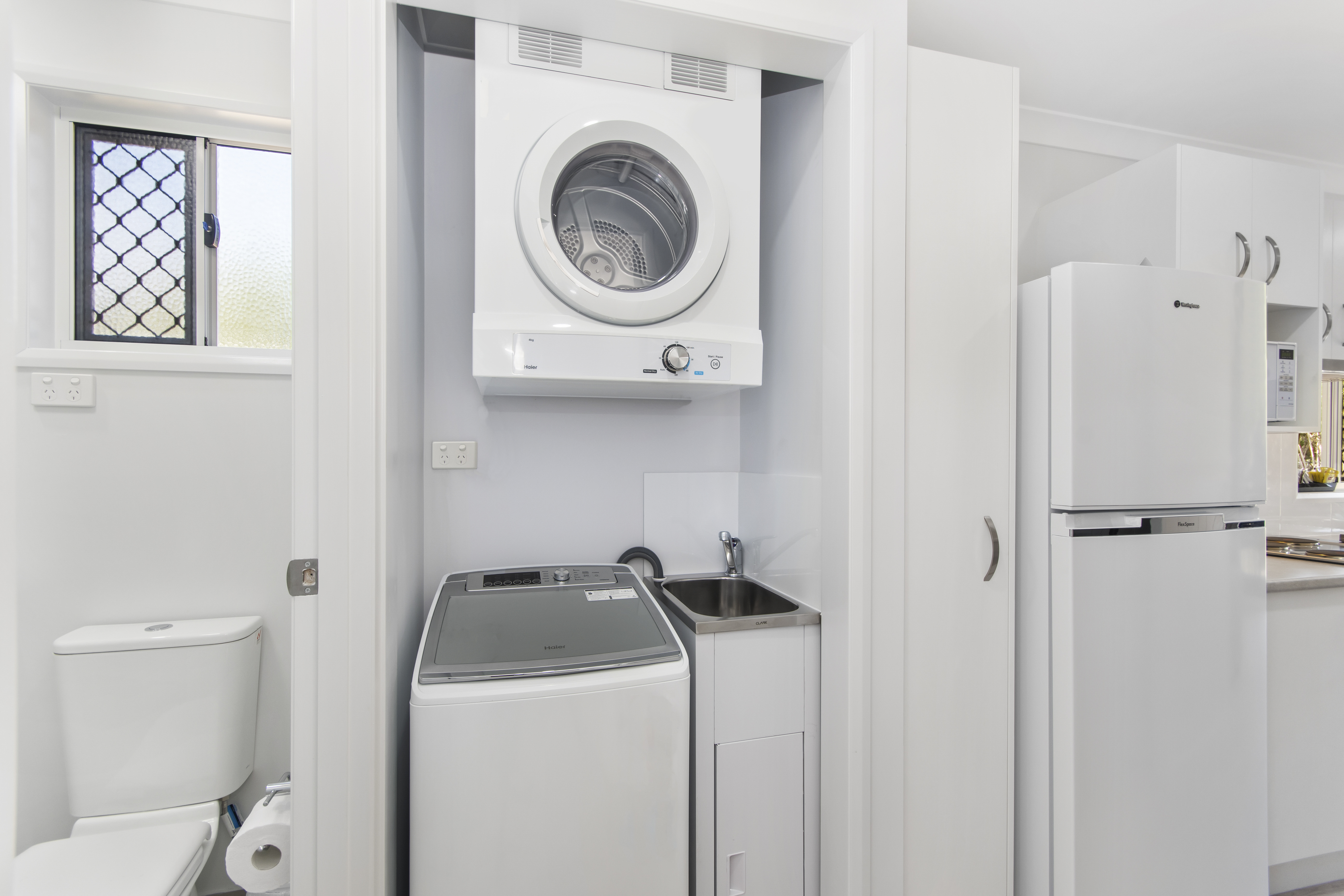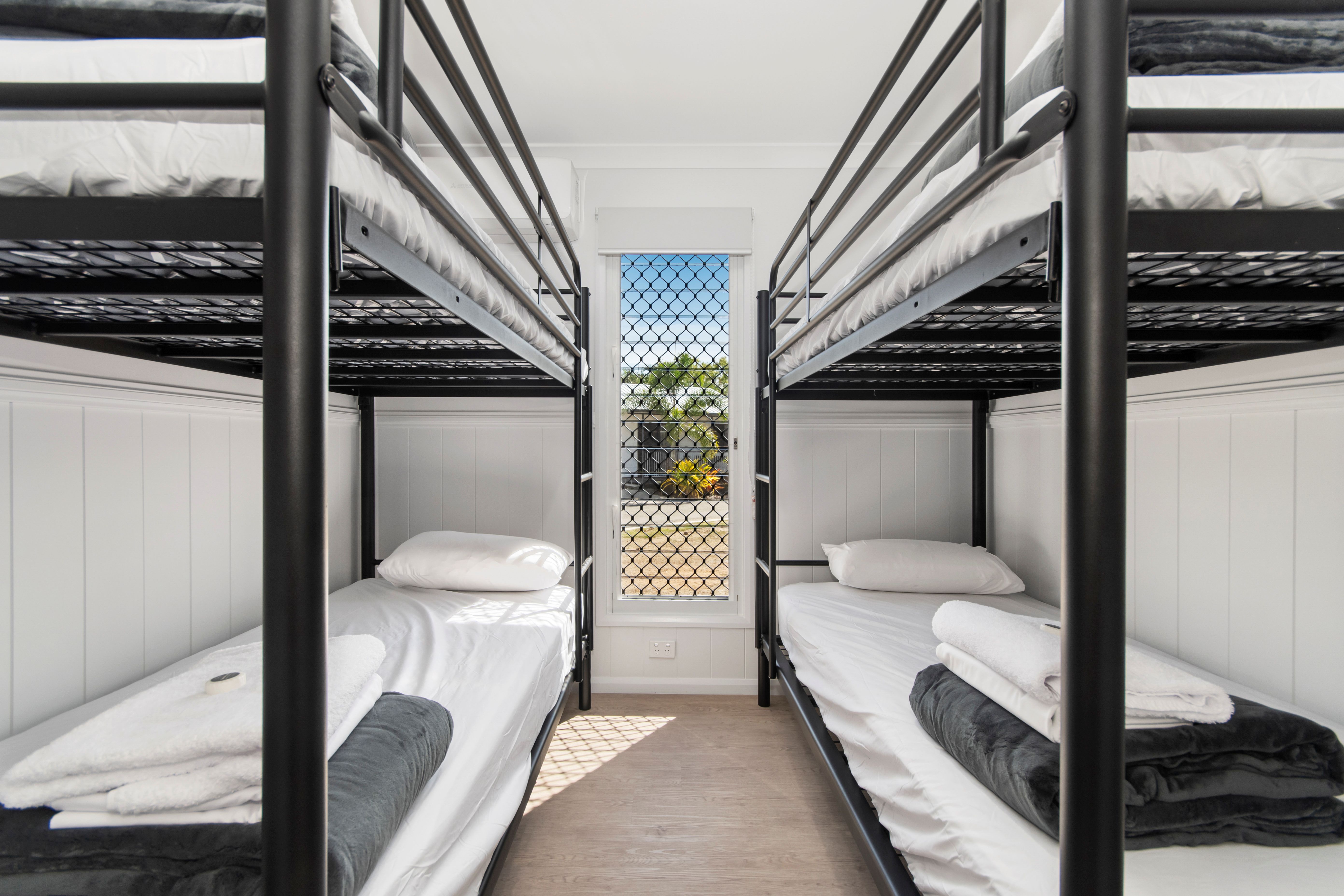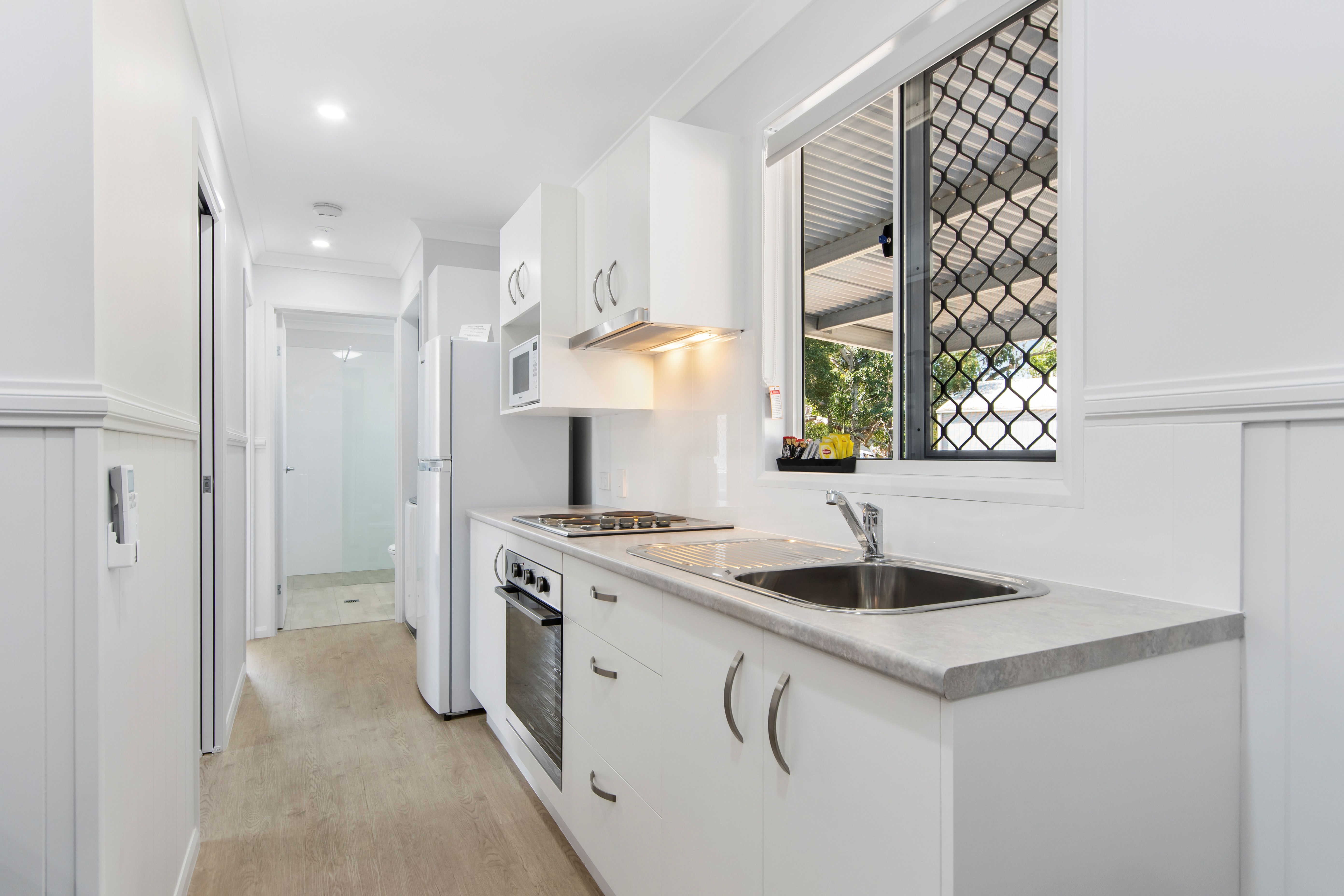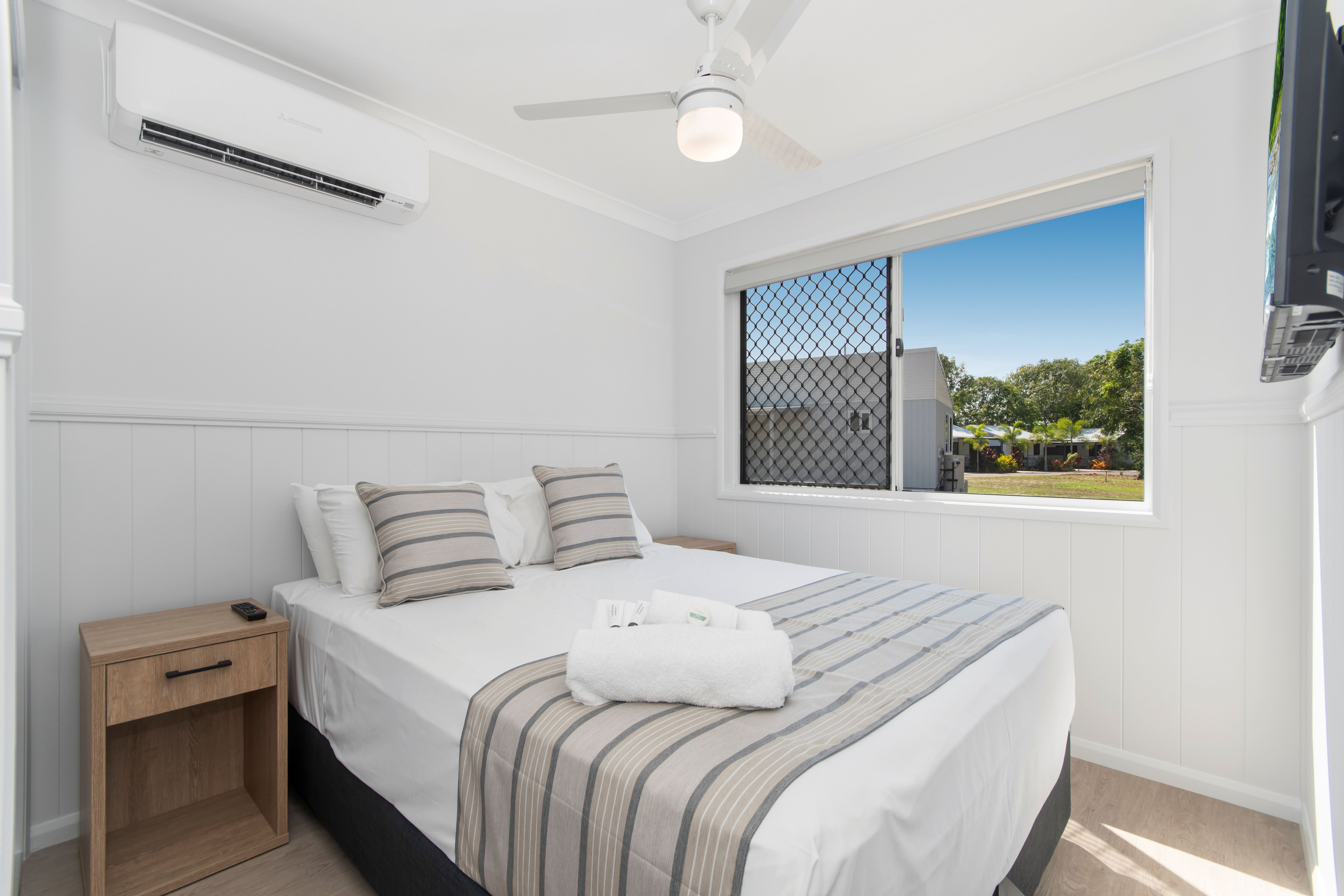 Our 2 Bedroom Deluxe Villas sleep up to six guests with a queen bed in the main bedroom and 2 bunks in the second bedroom, as well as a bathroom, modern living area, kitchen, internal laundry, and private deck. Imagery is indicative only – design may vary.