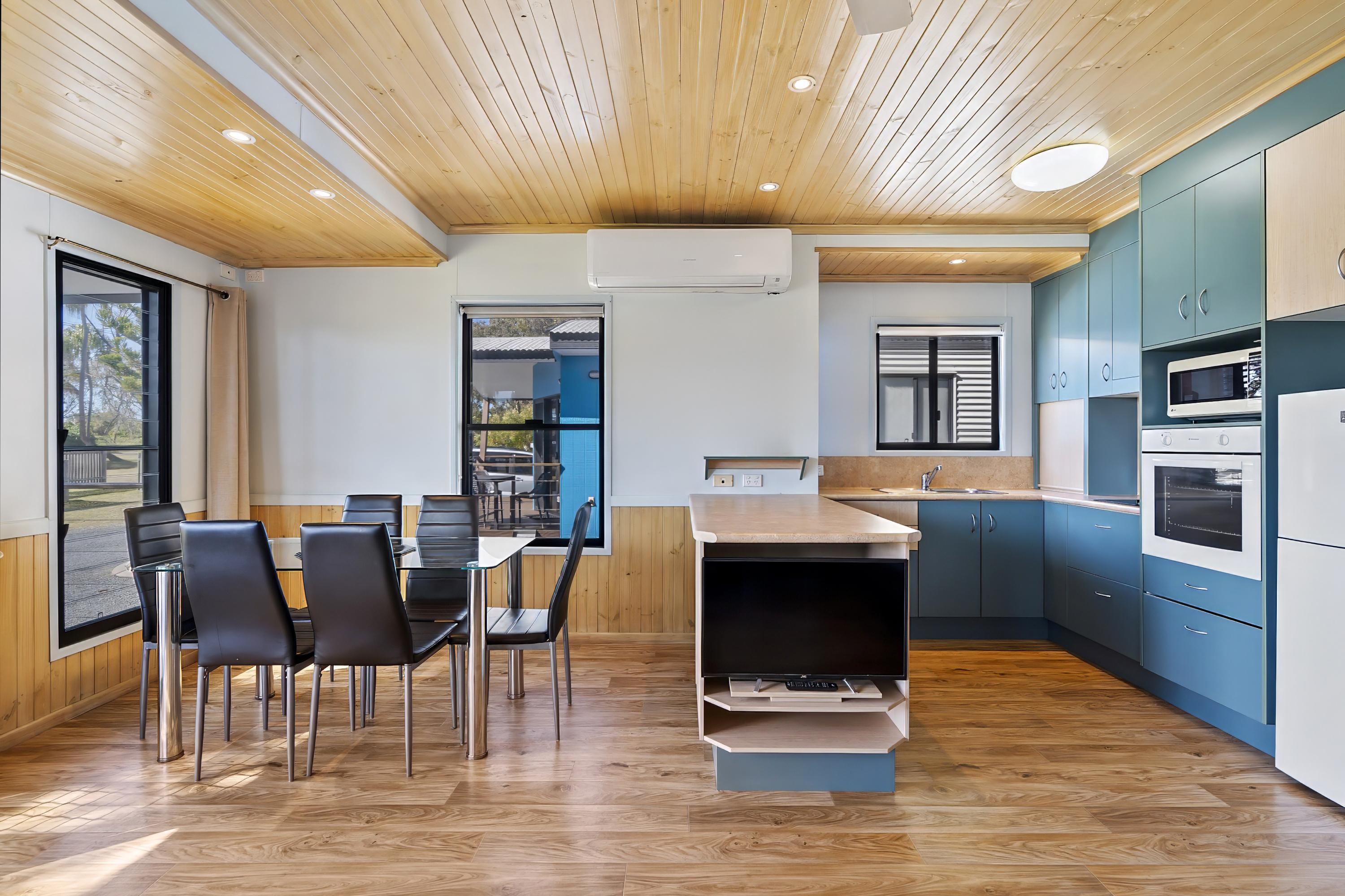 Our 2 Bedroom Family Cabin sleeps up to six guests, with a queen bed in the main bedroom and 2 bunks in the second bedroom. With a large bathroom and separate toilet, a large kitchen, a living area and a private deck, this cabin has everything you need for a memorable family stay.
