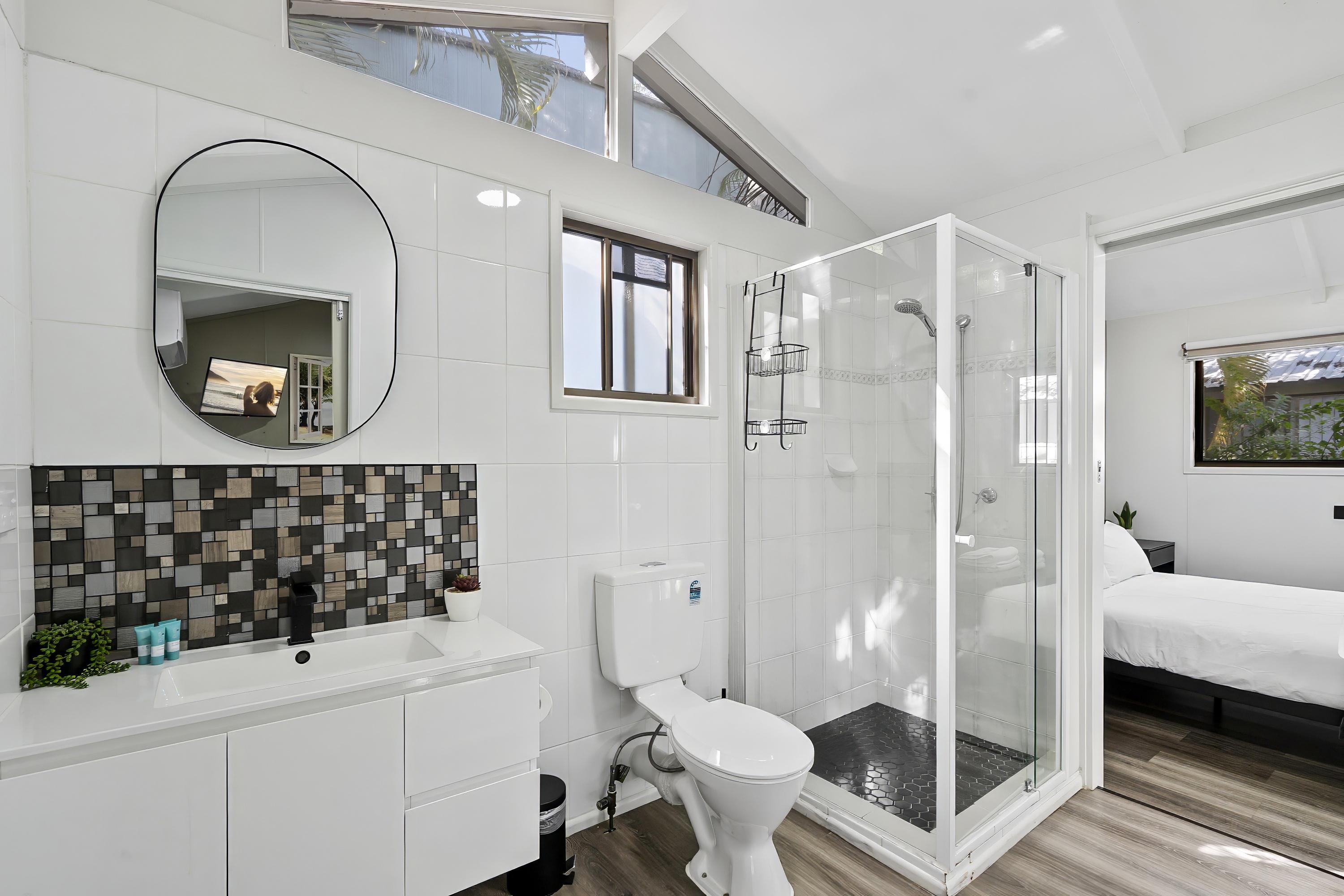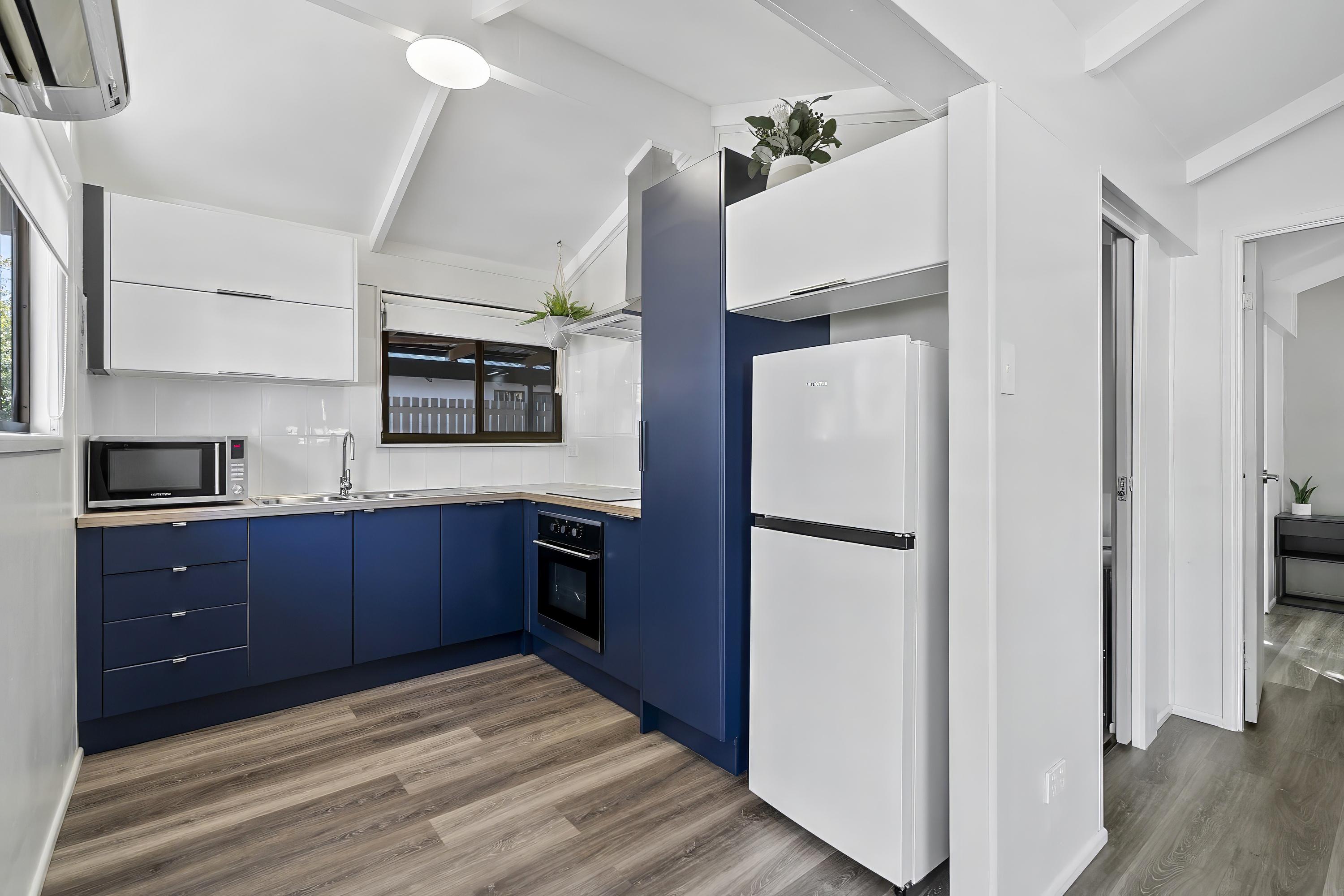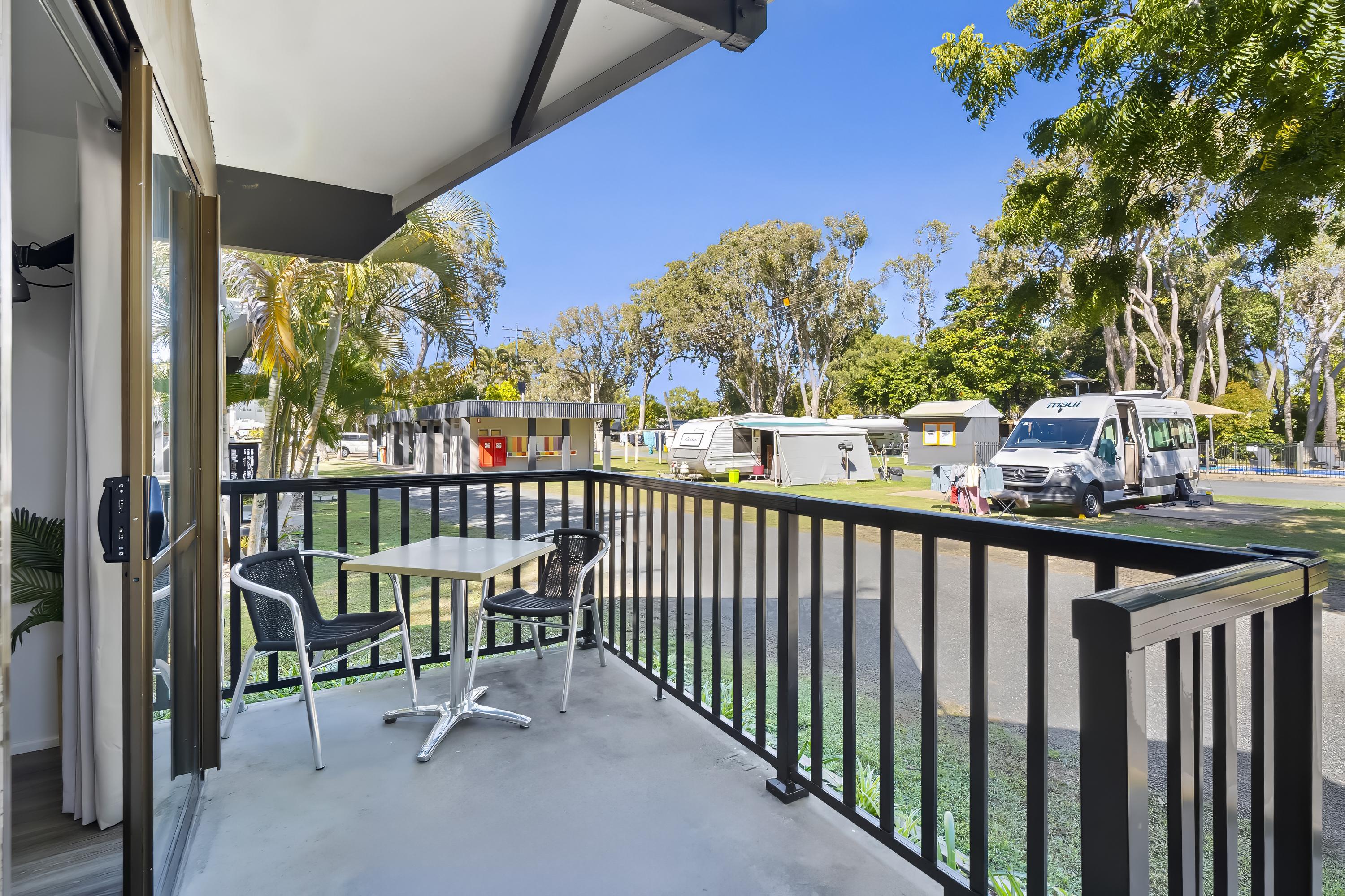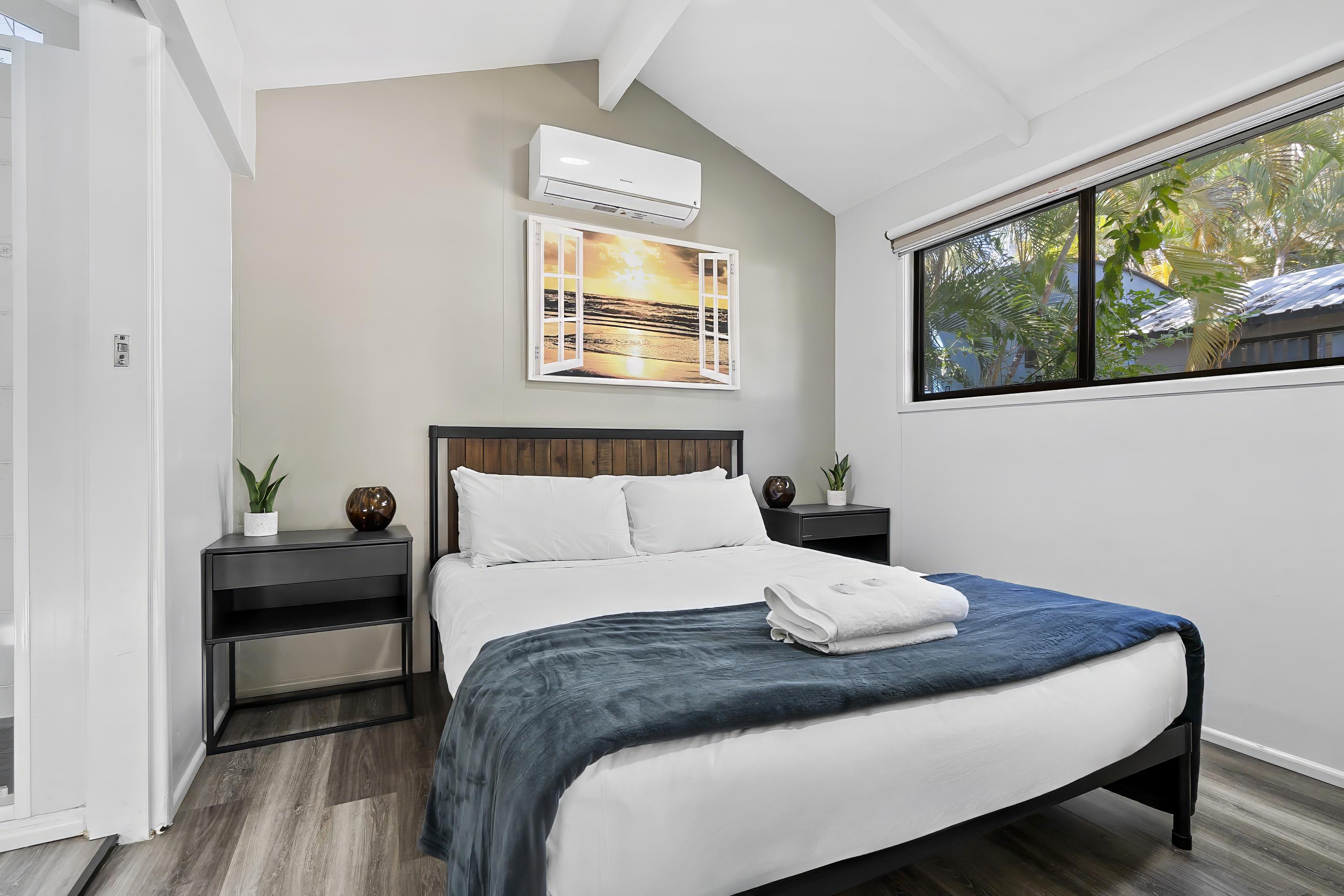 Our 2 Bedroom Units sleep up to four guests, with a queen bed in the main bedroom and 2 single beds in the second bedroom, as well as a bathroom, kitchen, living area, and small private deck.
