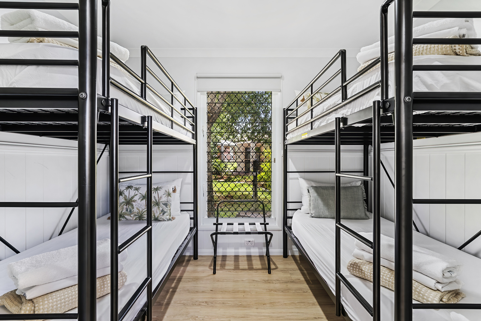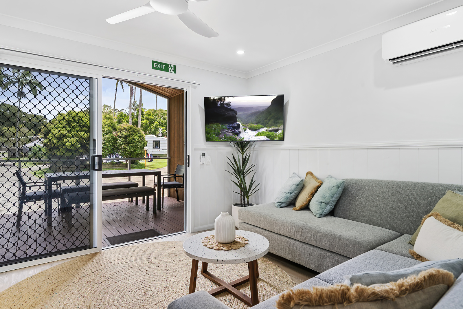 Our 3 Bedroom Deluxe Villa sleeps up to eight guests with a queen bed and ensuite in the main bedroom, a queen bed in the second bedroom and two bunks in the third bedroom, as well as an additional bathroom. Enjoy a living area, kitchen, internal laundry and a private deck. Imagery is indicative only – design may vary.