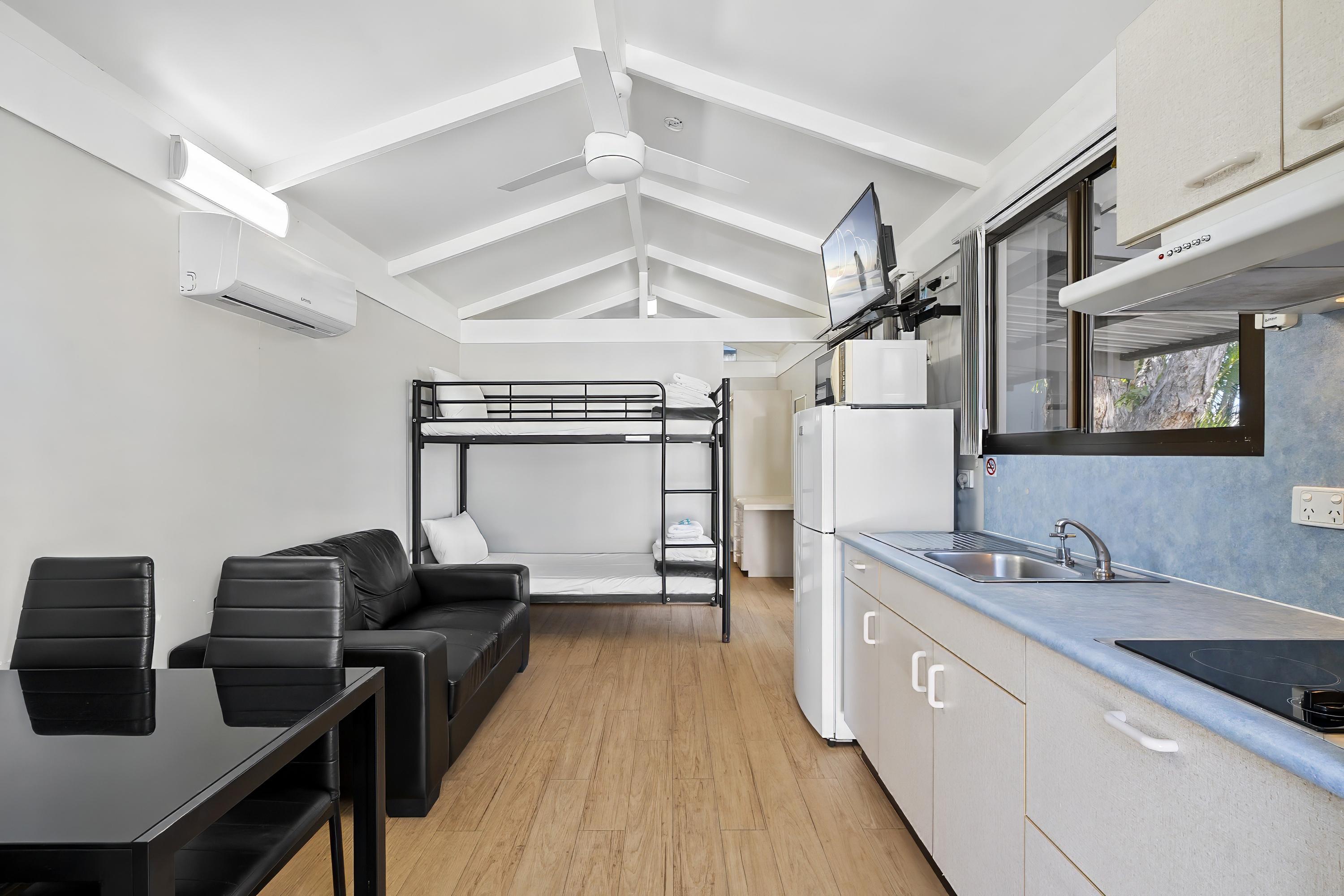 Our Non Ensuite Cabins are a great budget option, perfect for working stays and sleep up to four guests, with a double bed and bunks, as well as a kitchen and living area. Please note these cabins do not have a toilet or shower, however amenities are available across the road from their location.