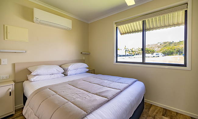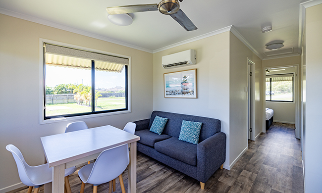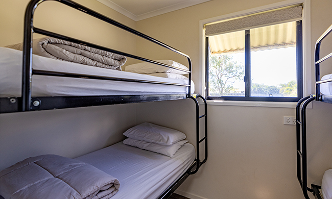Centrally located overlooking the park, 2 bedroom cabin sleeps six. One queen and two single bunks. Featuring air conditioning; bathroom; kitchen with microwave, fridge and hotplates; dining area; lounge with TV and DVD; small shaded veranda; parking for one vehicle.