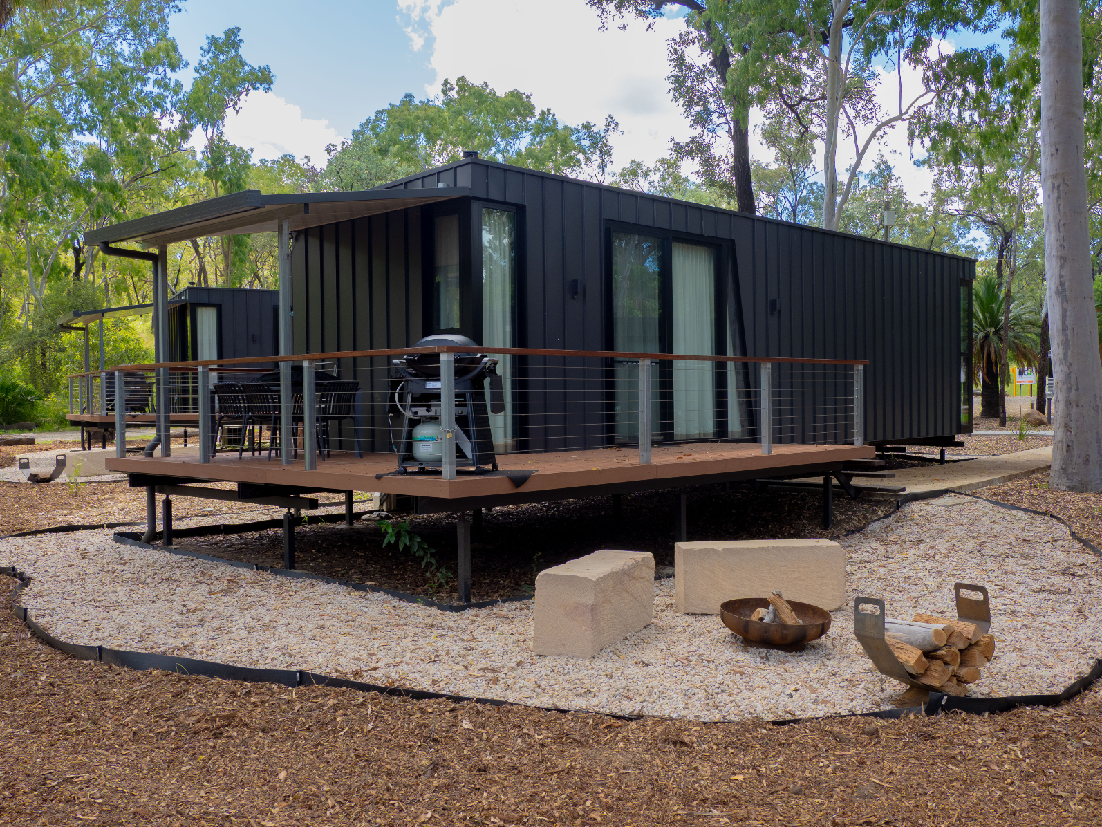 These stunning brand-new Deluxe One Bedroom Cabins are architecturally designed, environmentally conscious, and prefabricated right here in Queensland. Just right for four or perfect for two, our Deluxe One Bedroom Cabin is ideal for your next holiday. Positioned in the heart of Carnarvon Gorge National Park, these intimate, modern cabins feature their own manicured gardens, a private fire pit, and a welcome hamper on arrival.