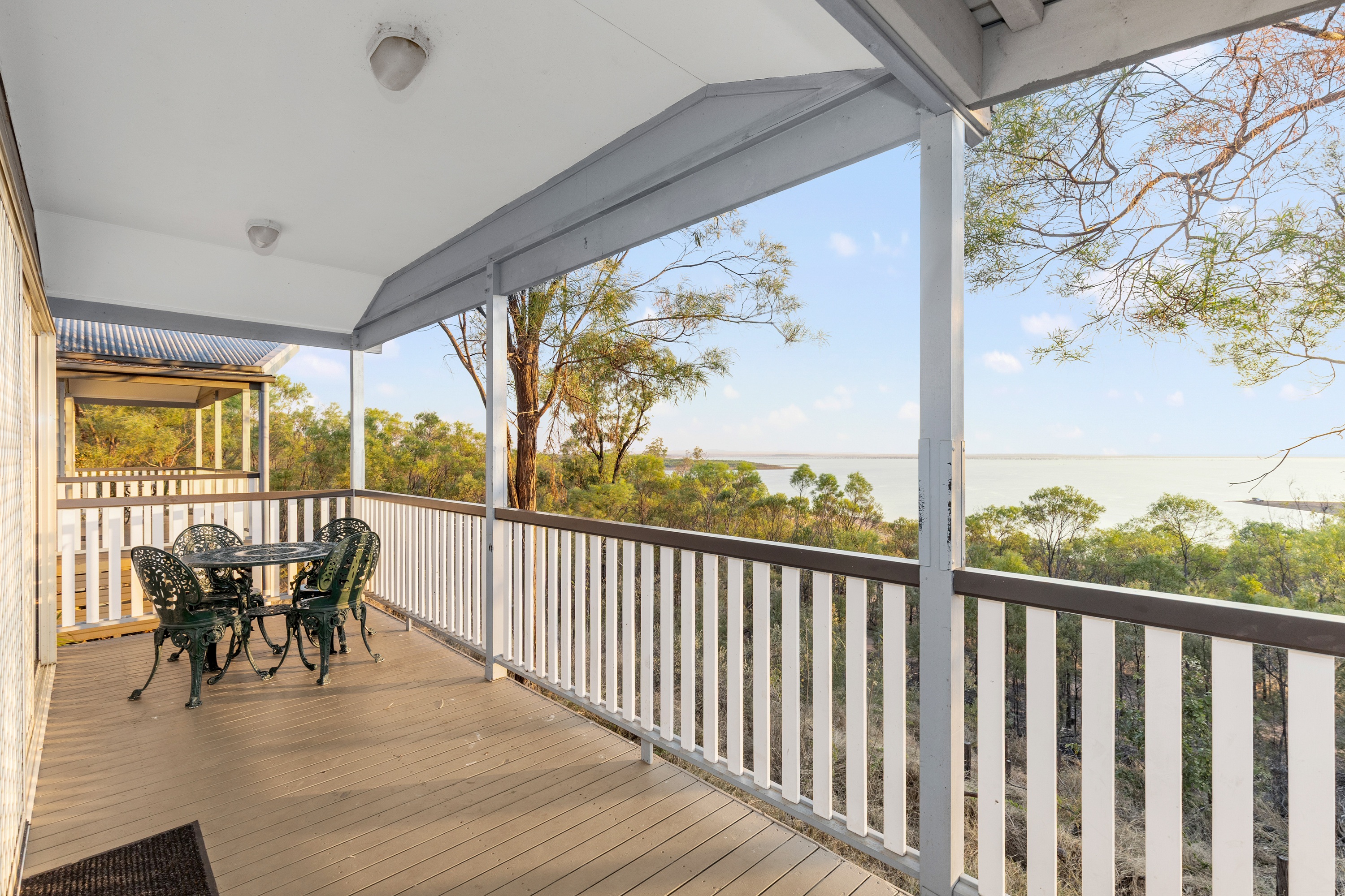 - Balcony with outdoor setting and lake view