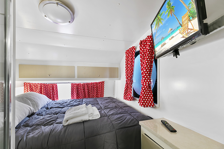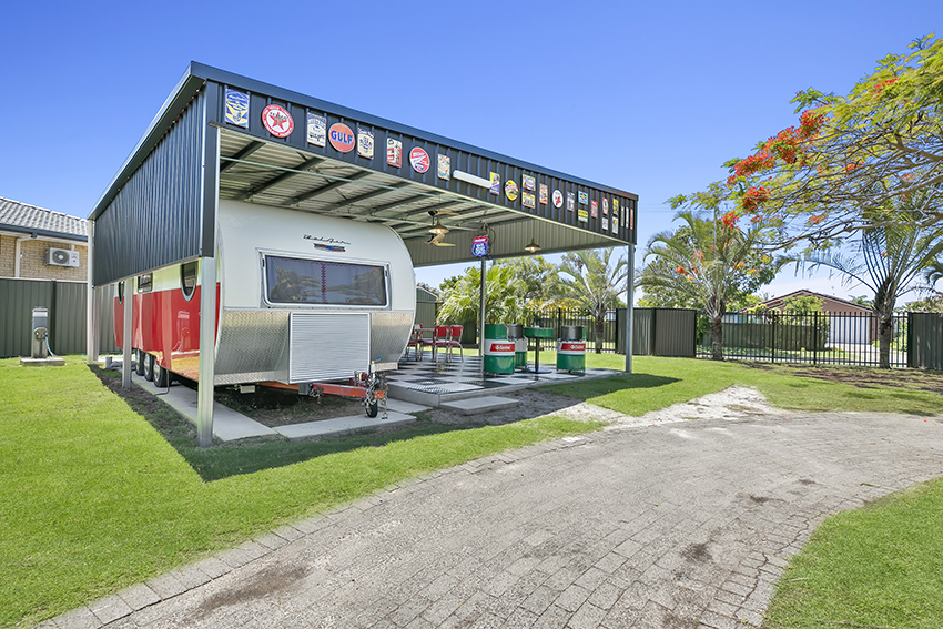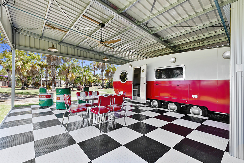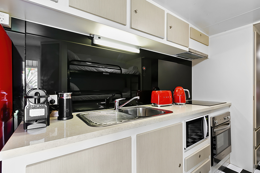 An unforgettable and nostalgic Hervey Bay stay. Our Bel Air Caravan sleeps up to six guests and is our most unique accommodation offering, with a double bed and triple bunks, kitchenette and shower in the beautifully decorated interior. Outside your door, access an ensuite toilet and added amenities, as well as a private outdoor area equipped with a BBQ and retro oil drum seating.