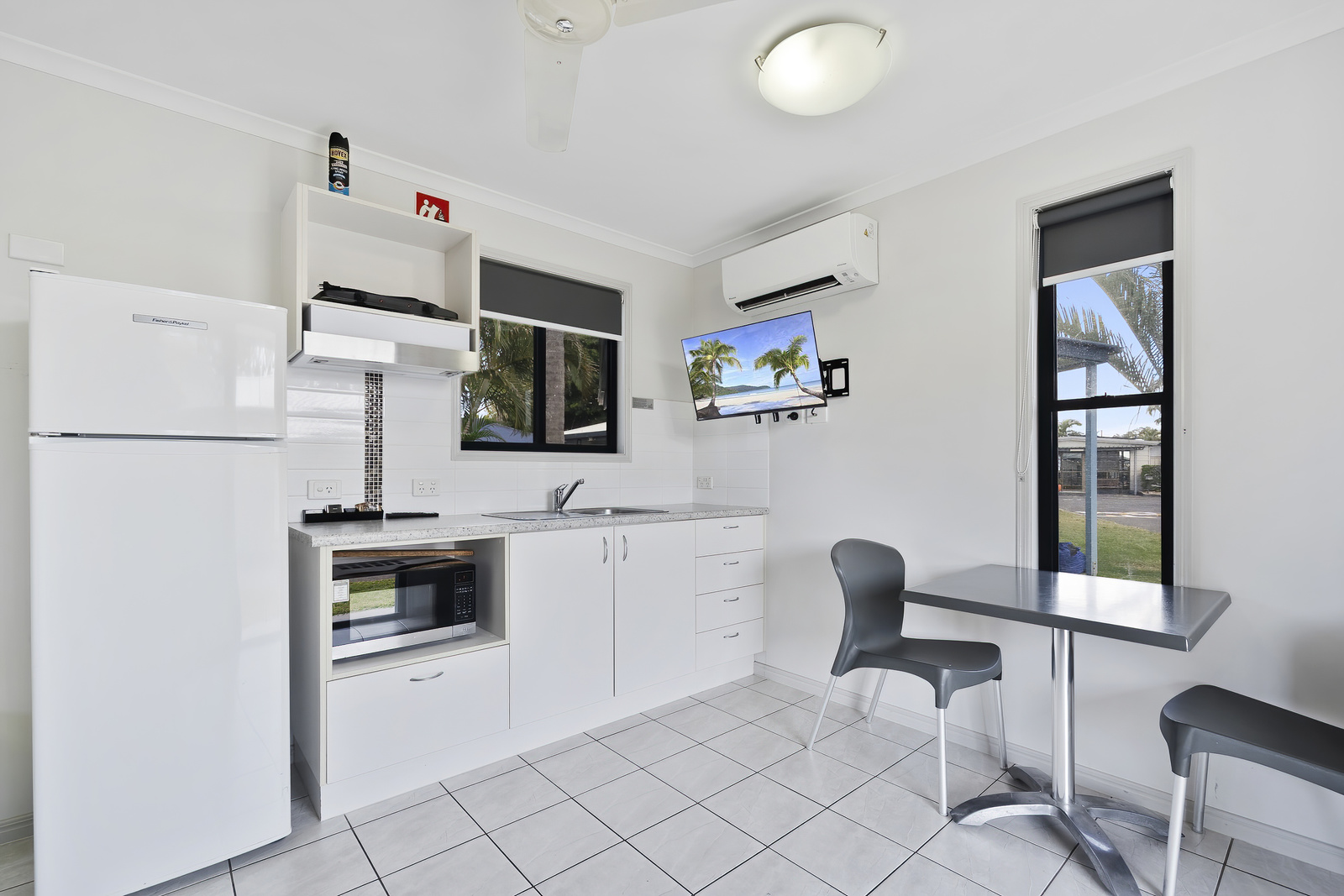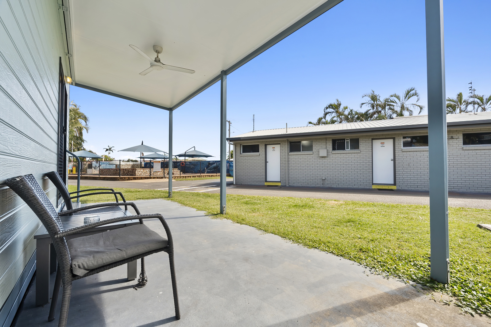 Experience Hervey Bay on a budget. Our Budget Cabins sleep two guests with a queen bed in the open plan space, as well as external ensuite bathroom, kitchenette, and outdoor patio.