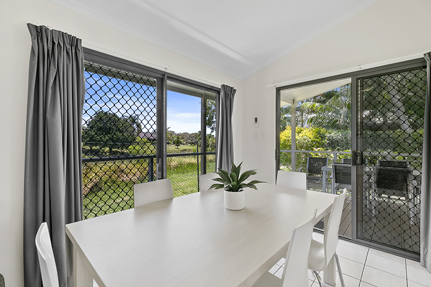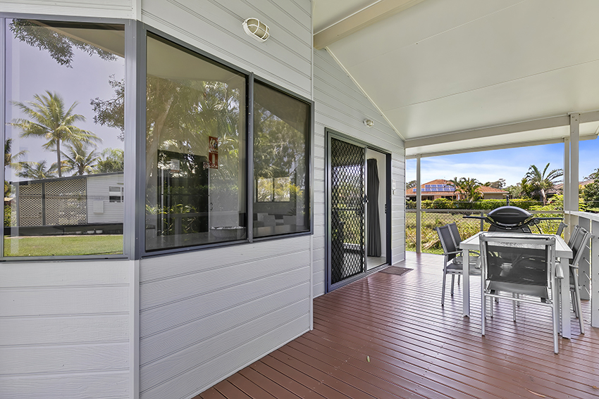 Stay in spacious and modern comfort right near Torquay Lakes. Our 3 Bedroom Superior Cabin sleeps up to six guests with a queen bed in the main bedroom, two singles in the second bedroom and a queen or two singles in the third bedroom, as well as two bathrooms, a living area, kitchen, and private deck.