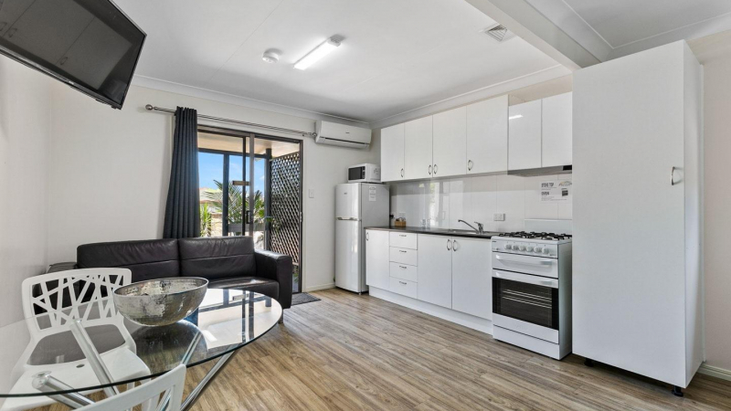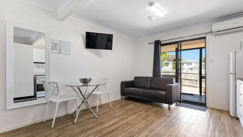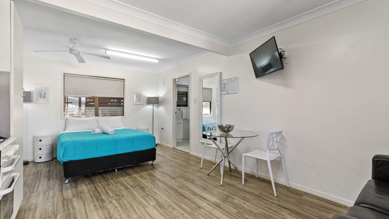 The Palms Side Retreat is a large studio room with a full kitchen. Feel a million miles away while you relax on your verandah or watch TV from your comfortable bed or leather couch in air-conditioned comfort. This villa has a full kitchen and modern bathroom. It is also pet-friendly.