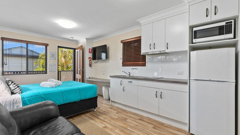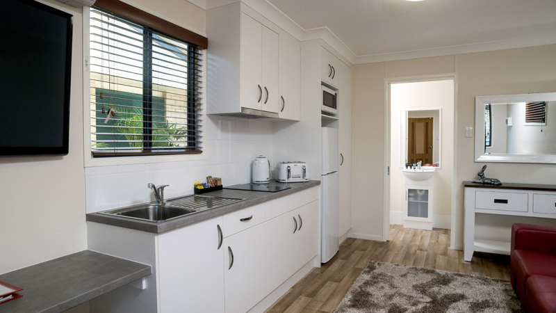 The Studio Condo is beautifully appointed with a well appointed kitchenette with ceramic cooktop. It has a very comfortable pillow top mattress with quality linen supplied. This studio villa also features a modern bathroom, full air-conditioning, big screen TV, Wi-Fi, leather couch and veranda.