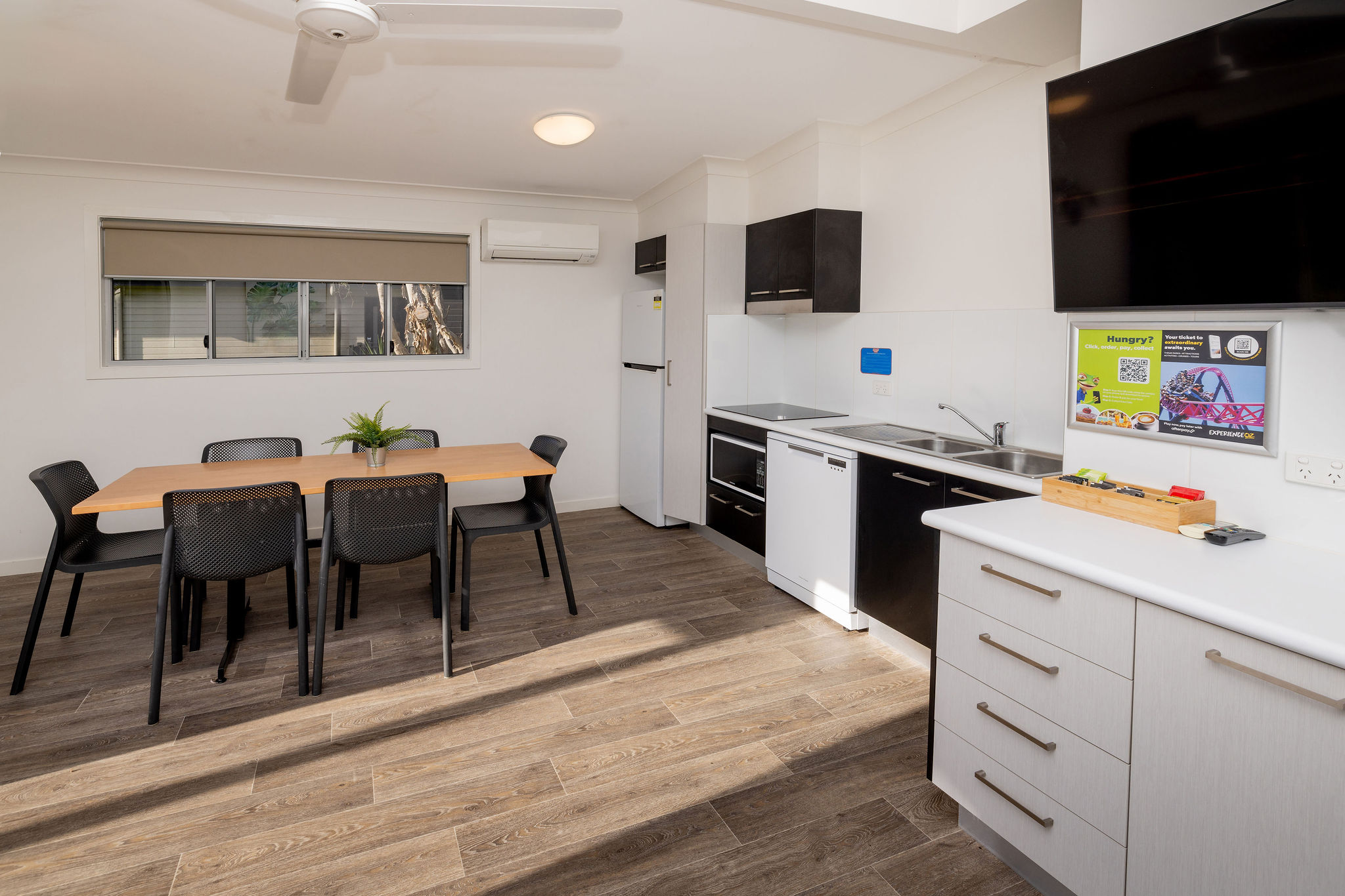 These cabins are close to all the action of the pool area and boast a modern kitchen including dishwasher with open plan dining and lounge. Each are fitted a large screen television to keep the kids amused, or if you like kick back with a fun holiday DVD.