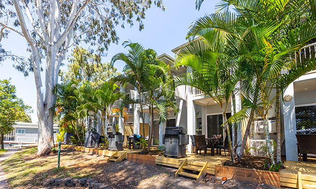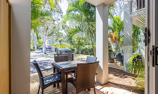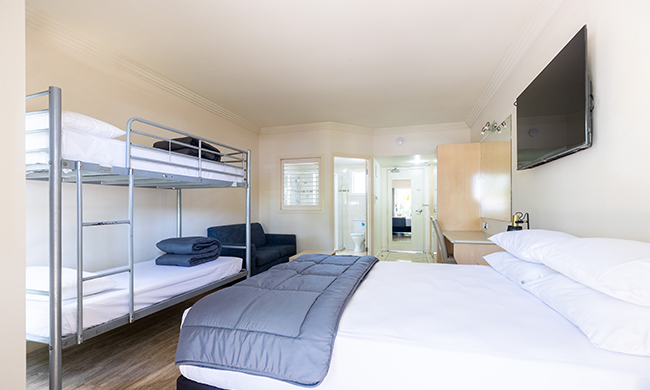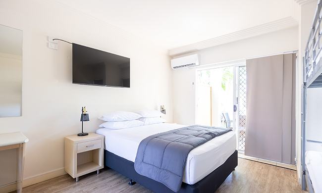 One queen and one single bunk bed in an open plan studio layout. Kitchenette including microwave, fridge, toaster and kettle; air-conditioning; one bathroom; patio; sofa; flat screen television; parking for one vehicle.Availability