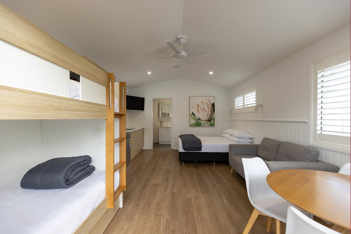 Centrally located in the park, this open plan studio cabin sleeps four. It contains a queen bed and bunk bed; kitchenette including stovetop, microwave and fridge; air-conditioning; one bathroom; veranda with outdoor setting; flat screen television; and on-site parking for one vehicle.