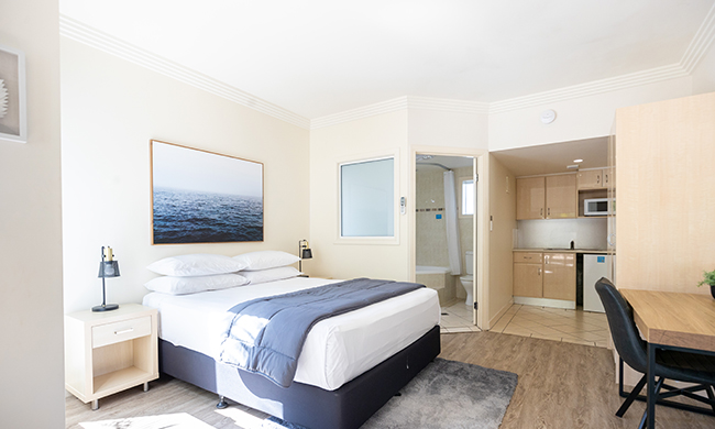 Open plan layout. One queen and one fold-out sofa (suitable for small children only). Kitchenette including microwave, fridge, toaster and kettle; air-conditioning; one bathroom; balcony; sofa; flat screen television and on-site parking for one vehicle.Availability