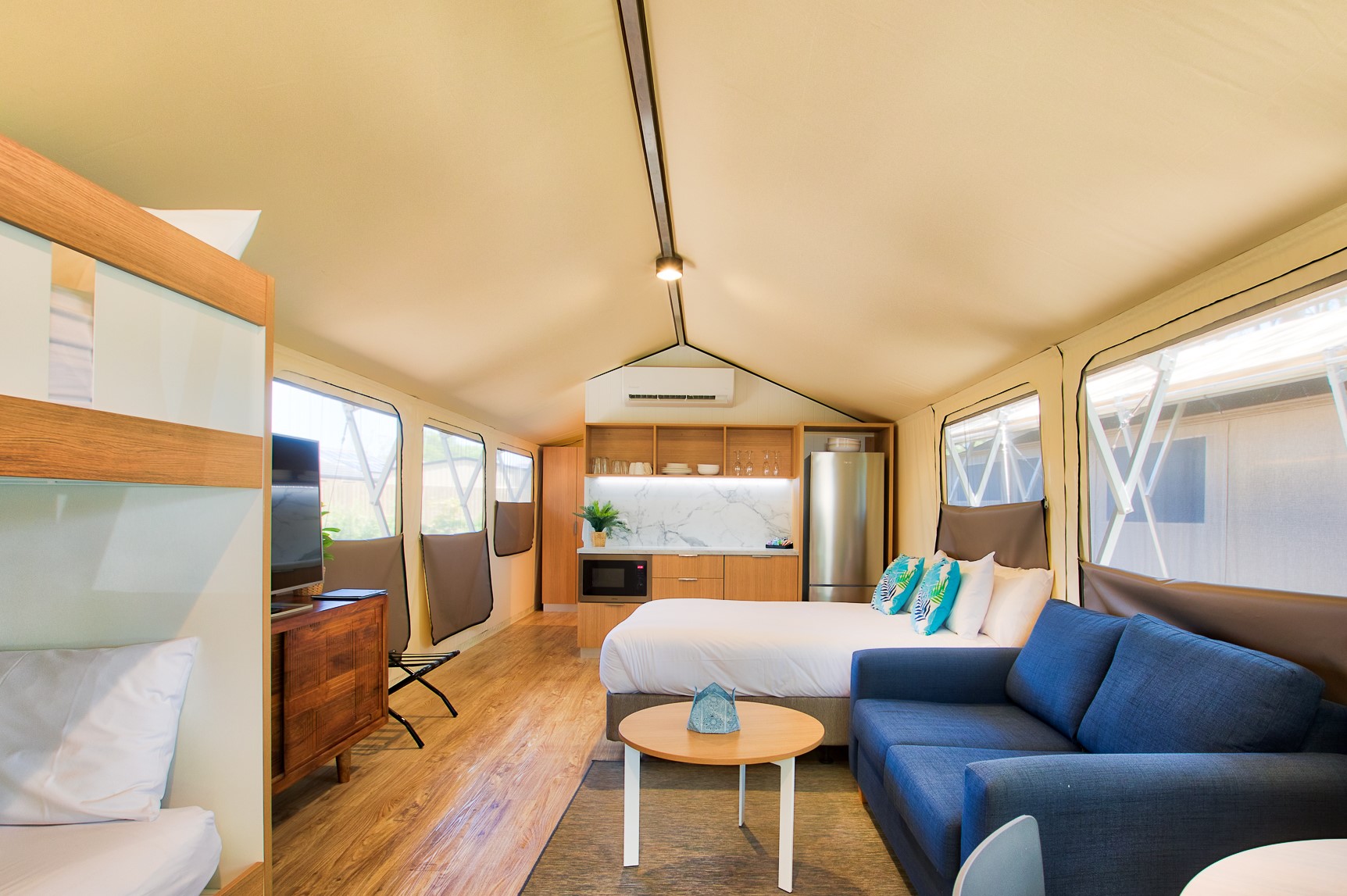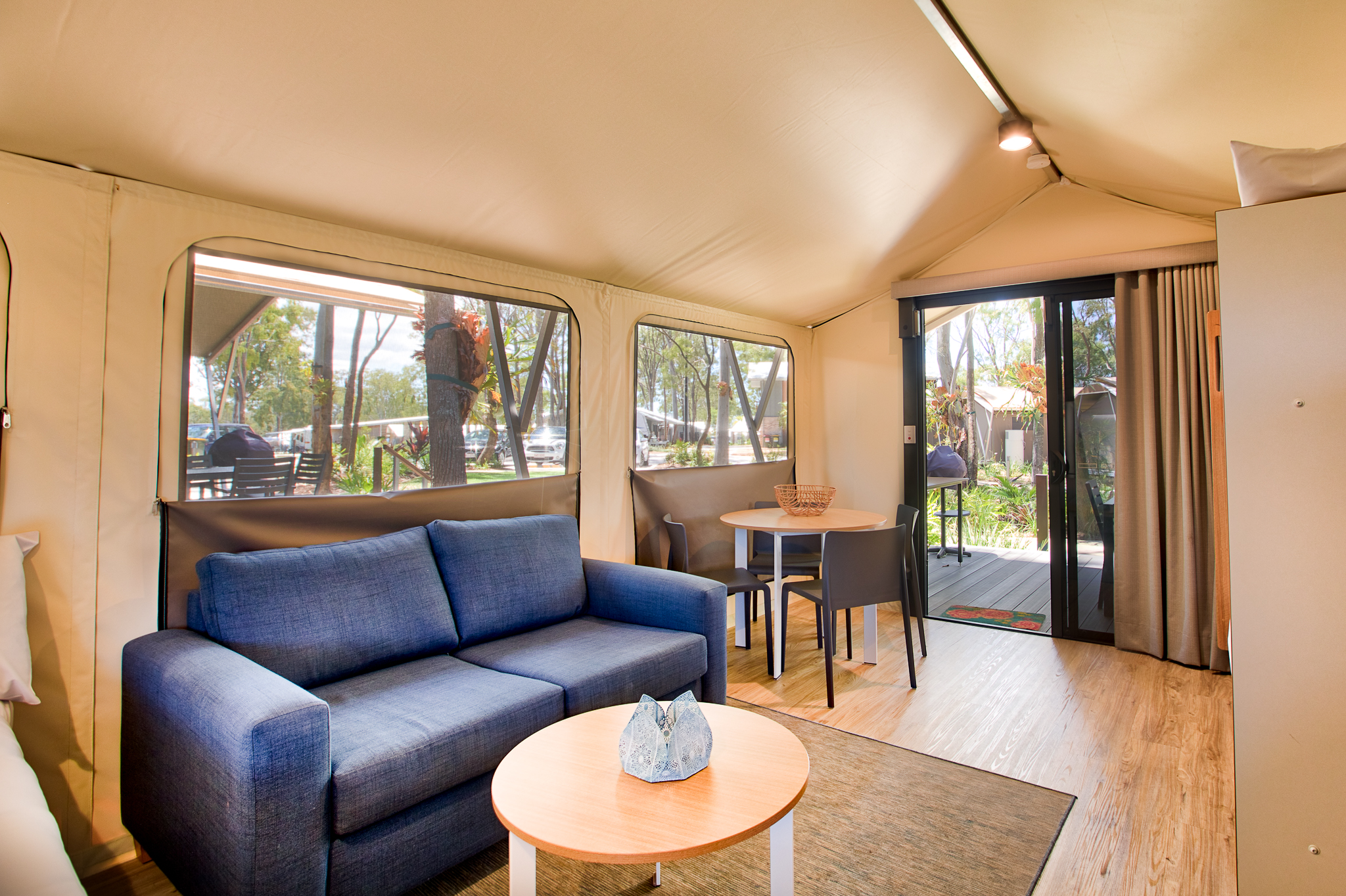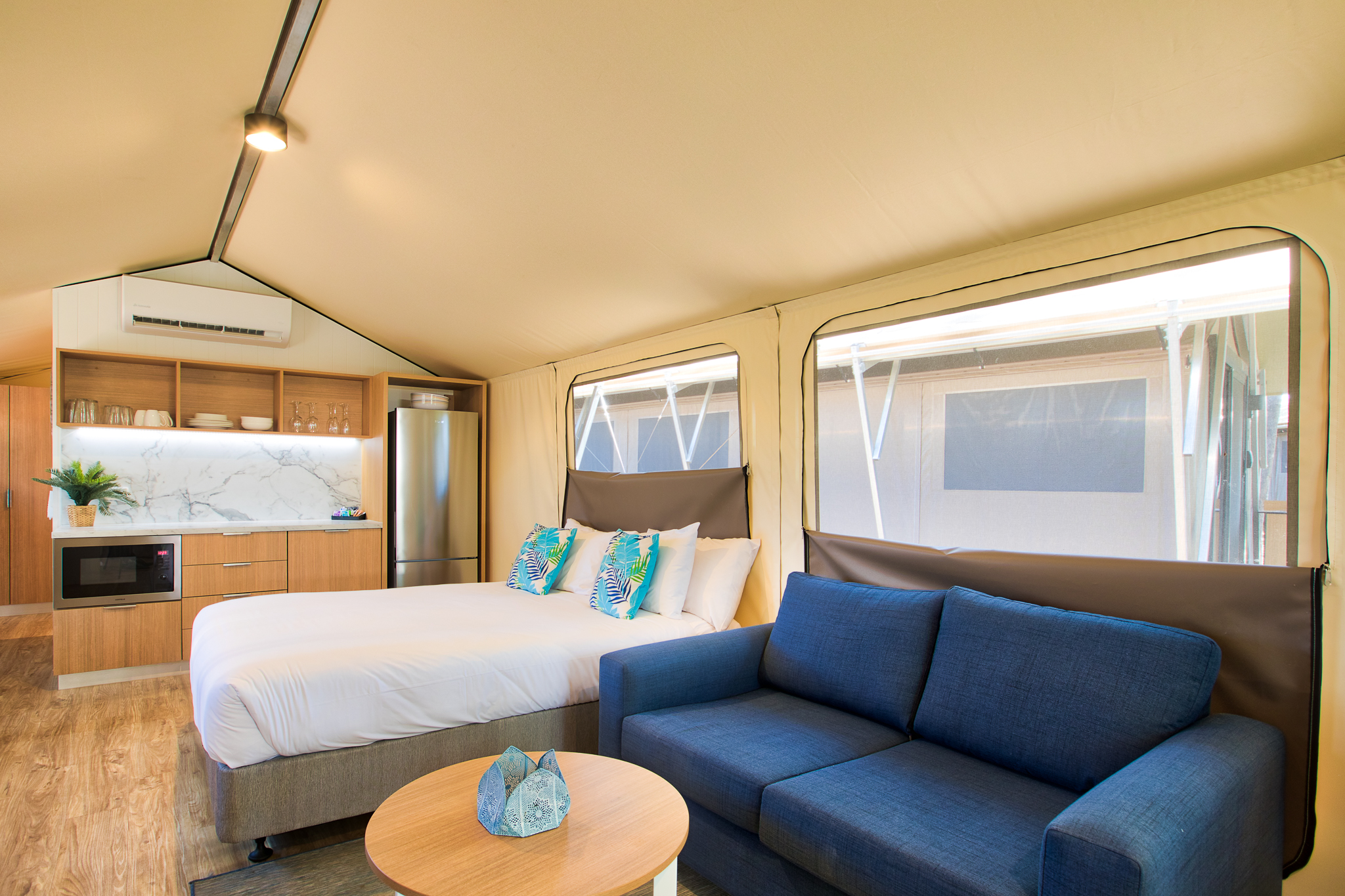 The Family Safari Tent is a unique way to camp in style. The Family Safari Tent has its own bathroom and open plan dining and lounge area with a TV opening out to a private alfresco dining area with a kitchenette and outdoor BBQ. The Safari Tents are Air-conditioned to stay cool in the Summer and Warm in the Winter!