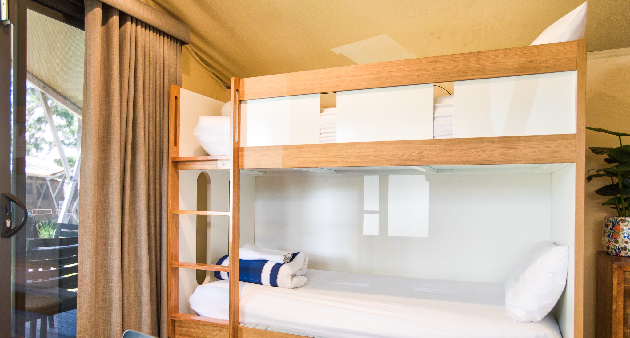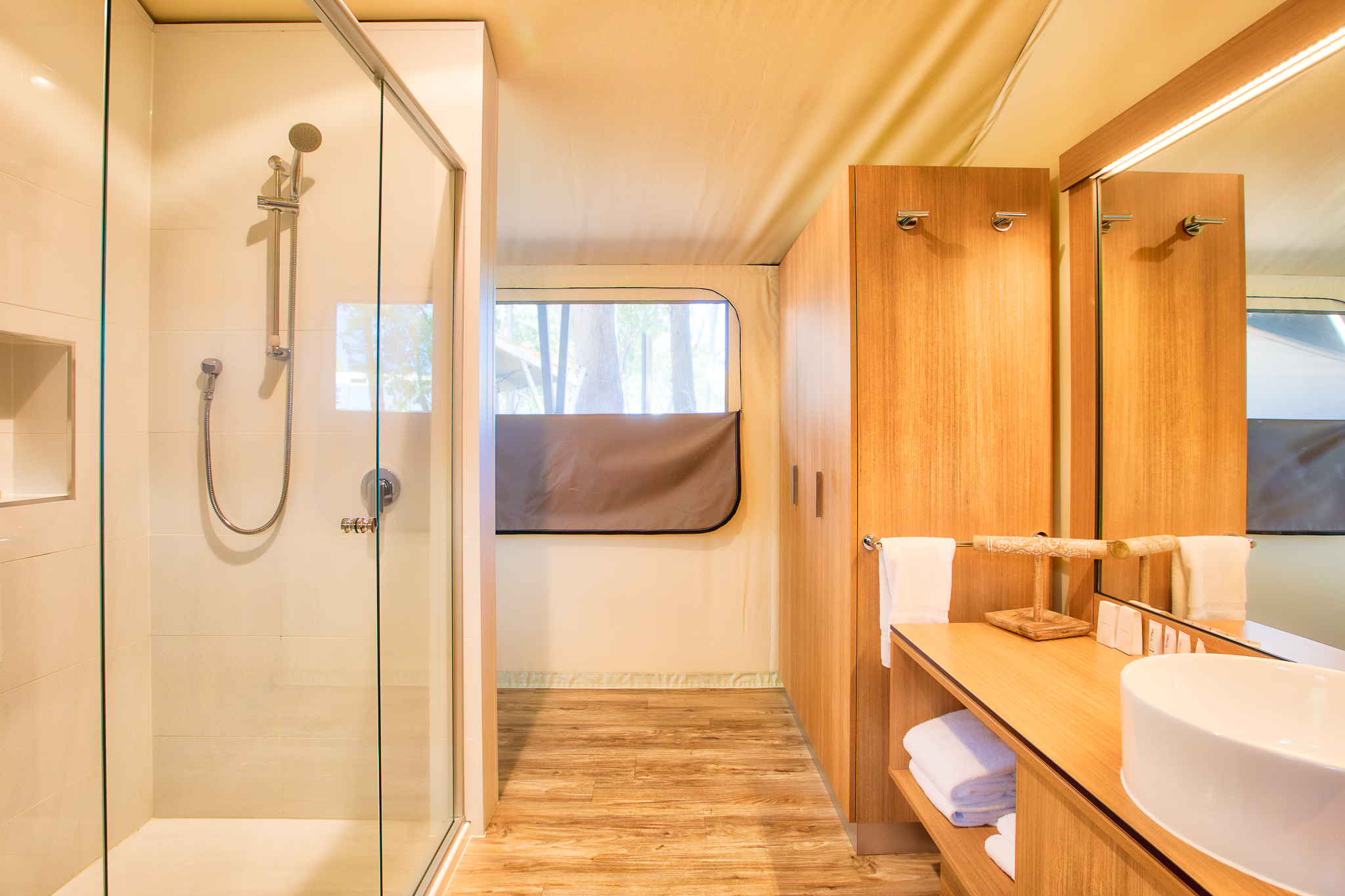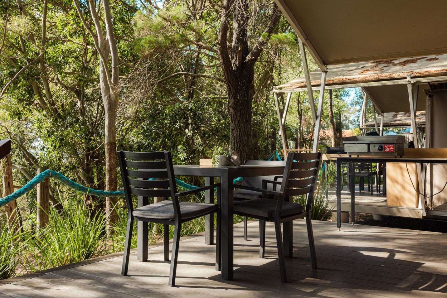 The Family Safari Tent is a unique way to camp in style. The Family Safari Tent has its own bathroom and open plan dining and lounge area with a TV opening out to a private alfresco dining area with a kitchenette and outdoor BBQ. The Safari Tents are Air-conditioned to stay cool in the Summer and Warm in the Winter!