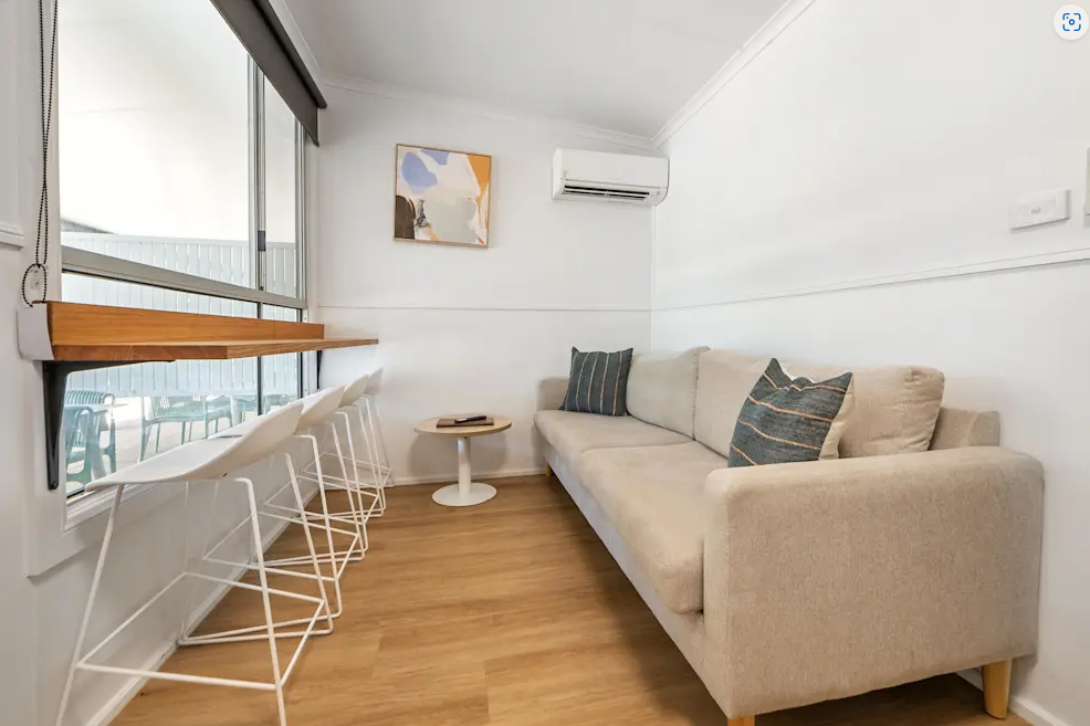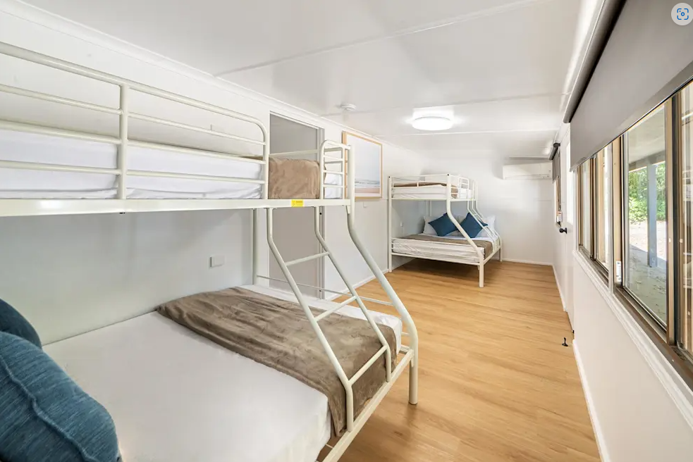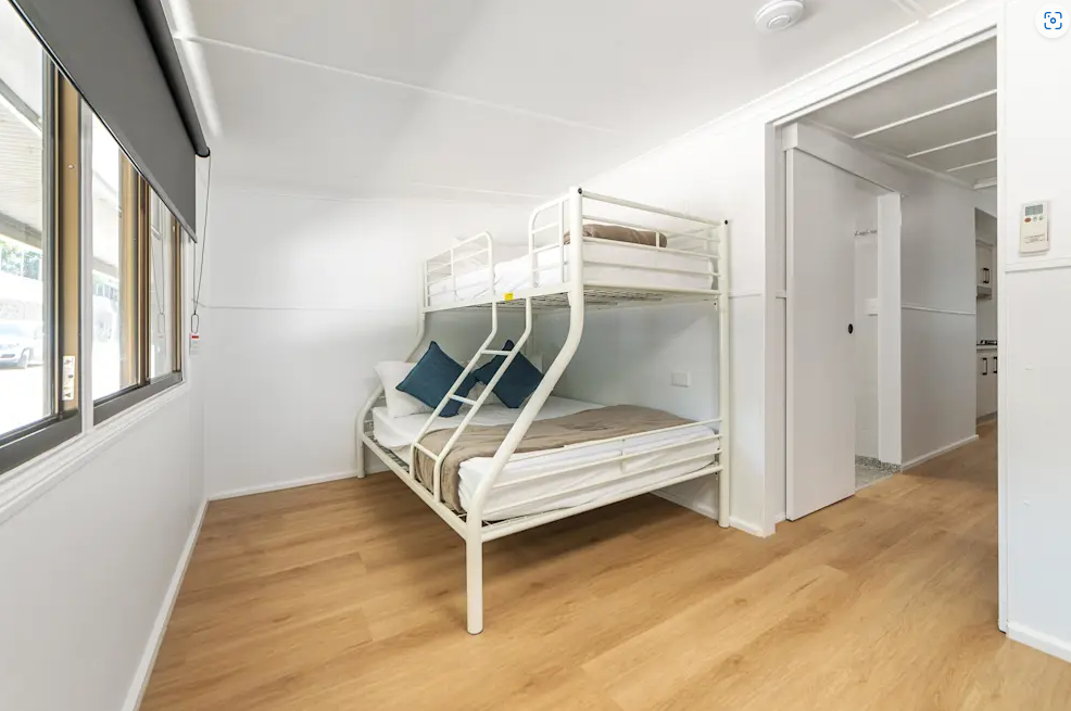 Fronting the beach famous for sunrise with the wallabies and kangaroos are the newly renovated Family Beachside Units. Accommodating everyone from the small family to the larger family these self-contained beach cabins have two rooms with air-conditioning throughout, a separate bathroom and are fronted by a shaded verandah to take in the ocean breeze. The kitchenette has a 2-gas burner cooktop, microwave, fridge, flat screen TV and a breakfast bar to admire the view while you eat. This unit accommodates 8 guests with a queen bed in the main room, and two double beds with overhead single bunks. There is an outdoor setting to take full advantage of the undercover verandah.