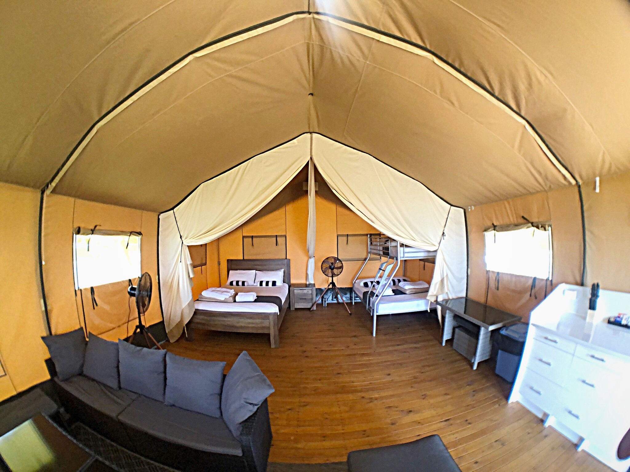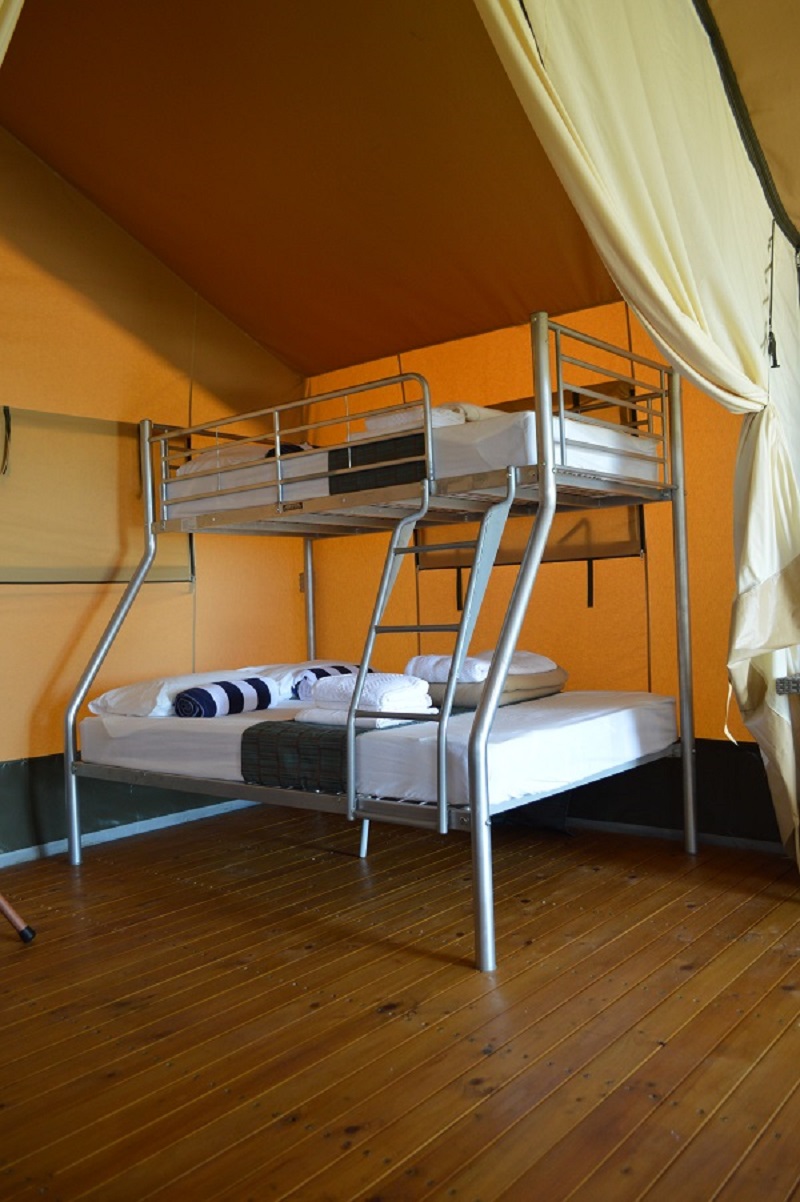 The tent sleeps up to five people, with a queen bed and a double bed with a bunk over the top. The Safari Tent is fitted with plentiful screened windows for your comfort.
