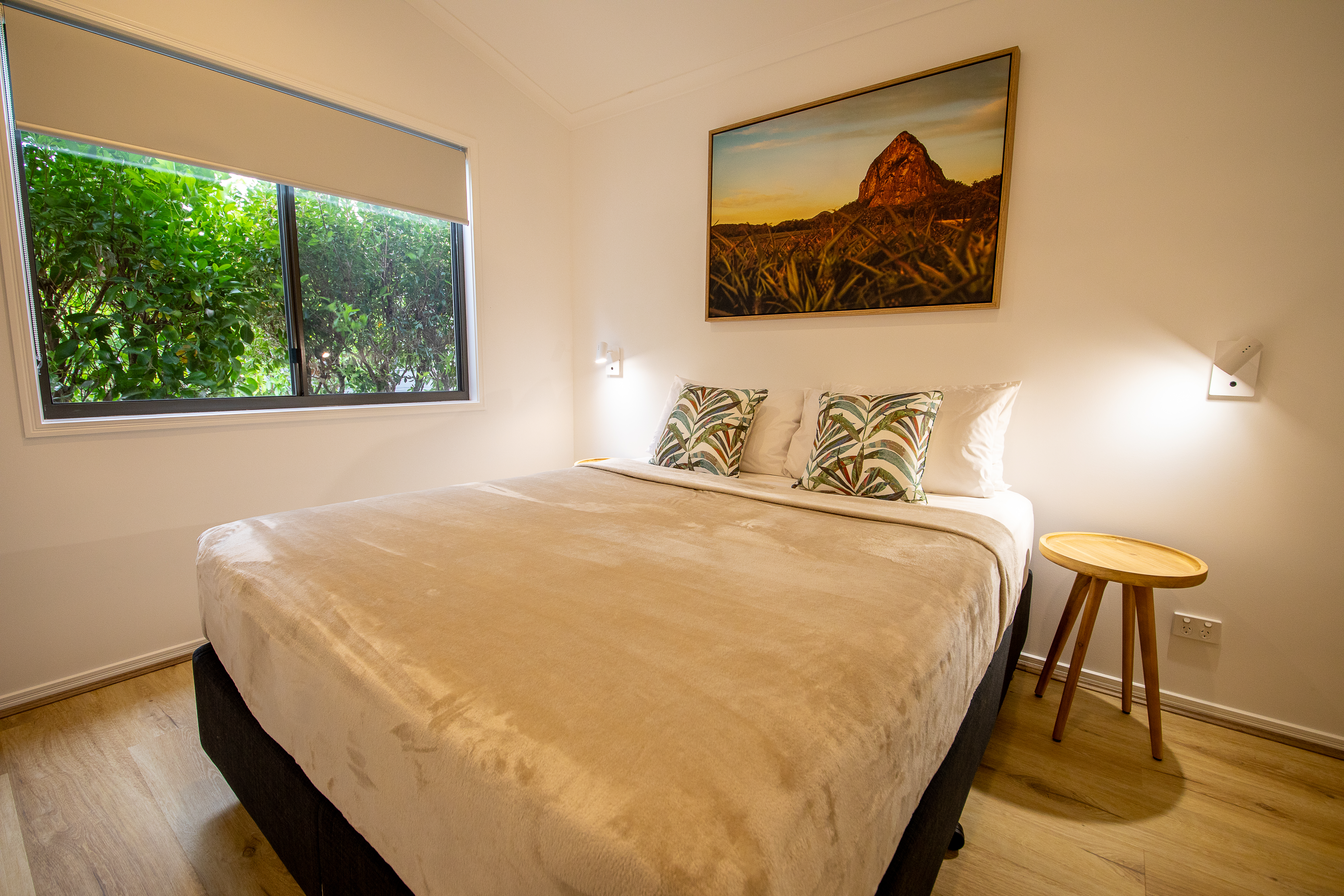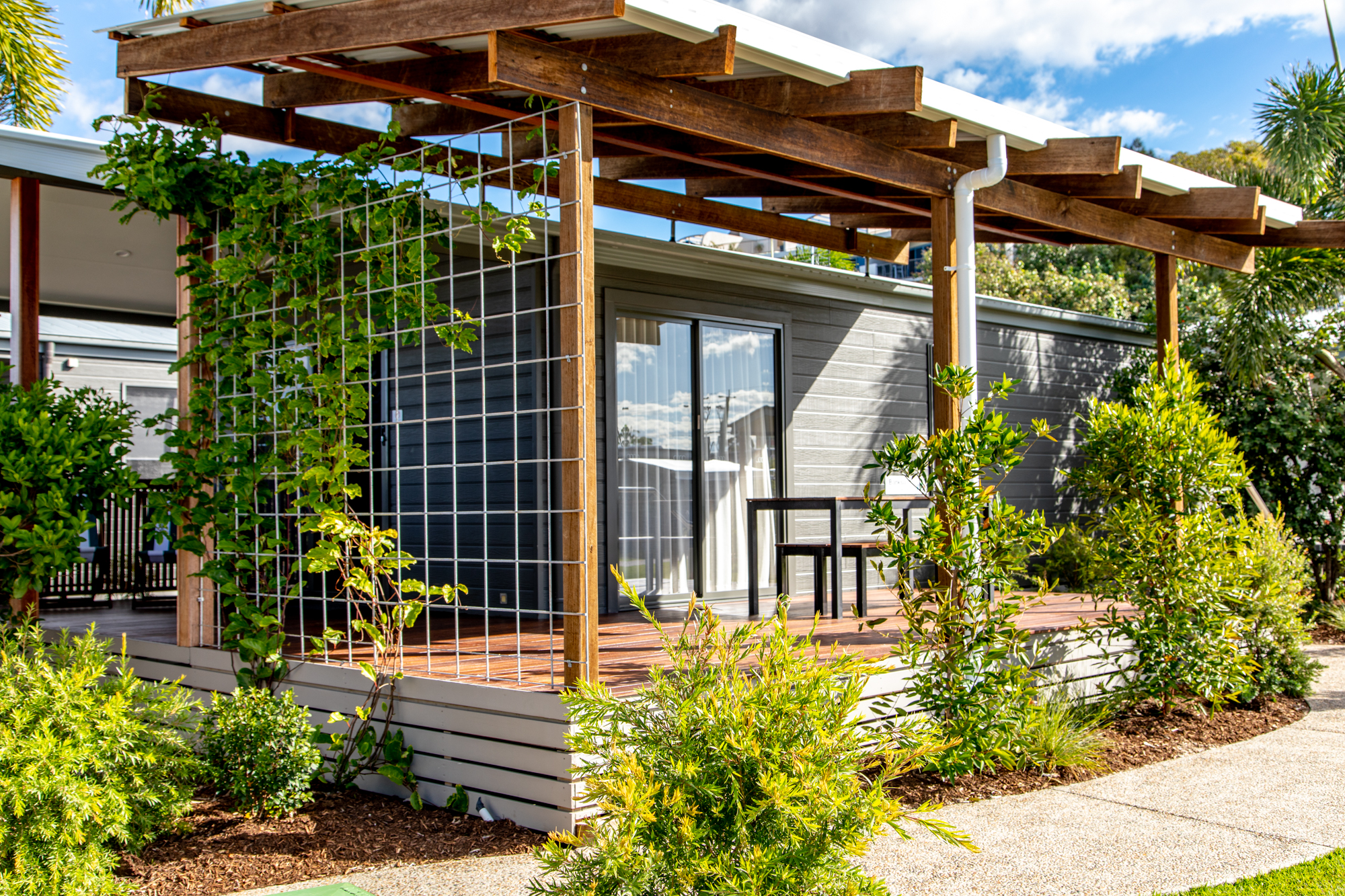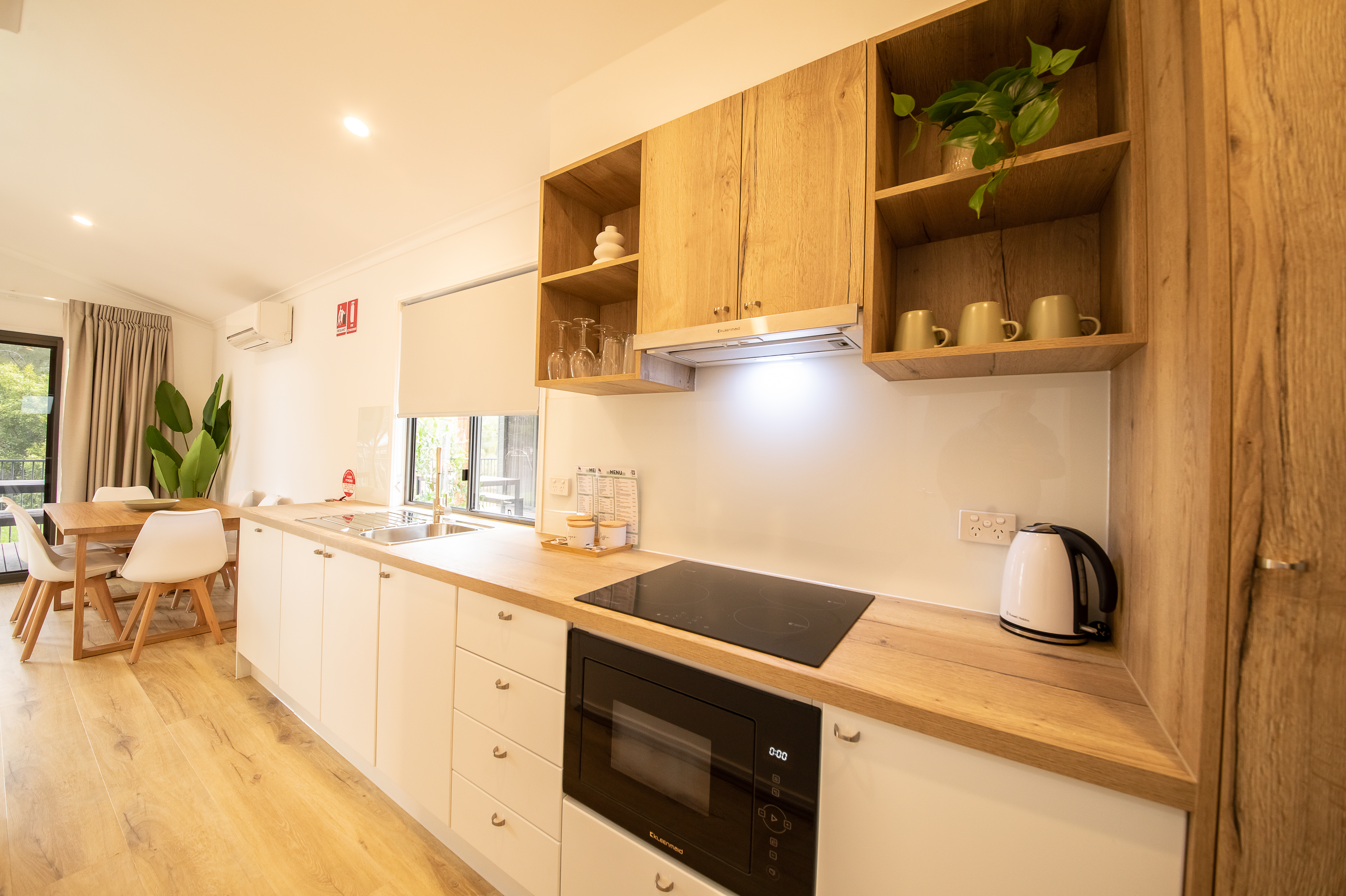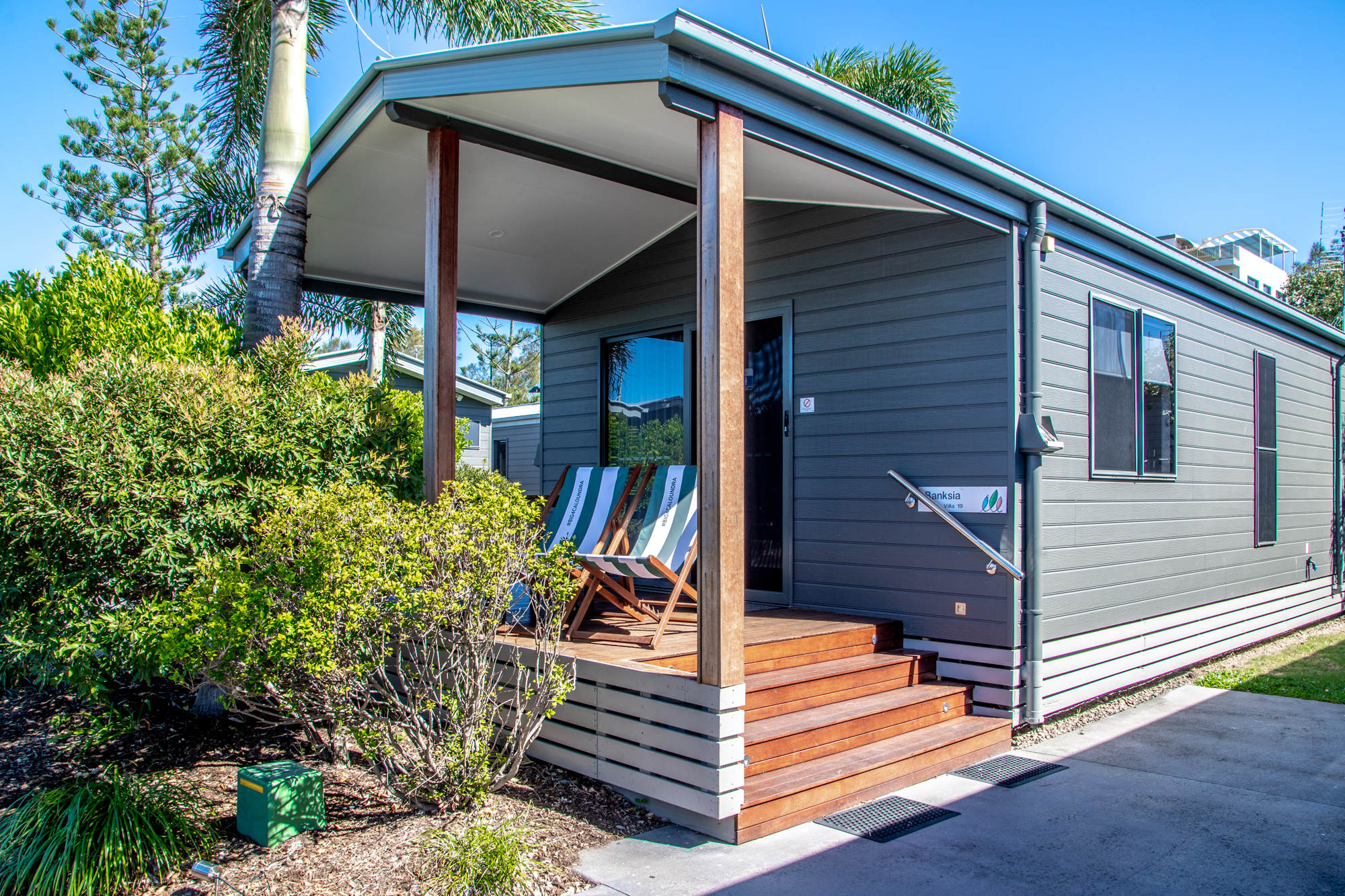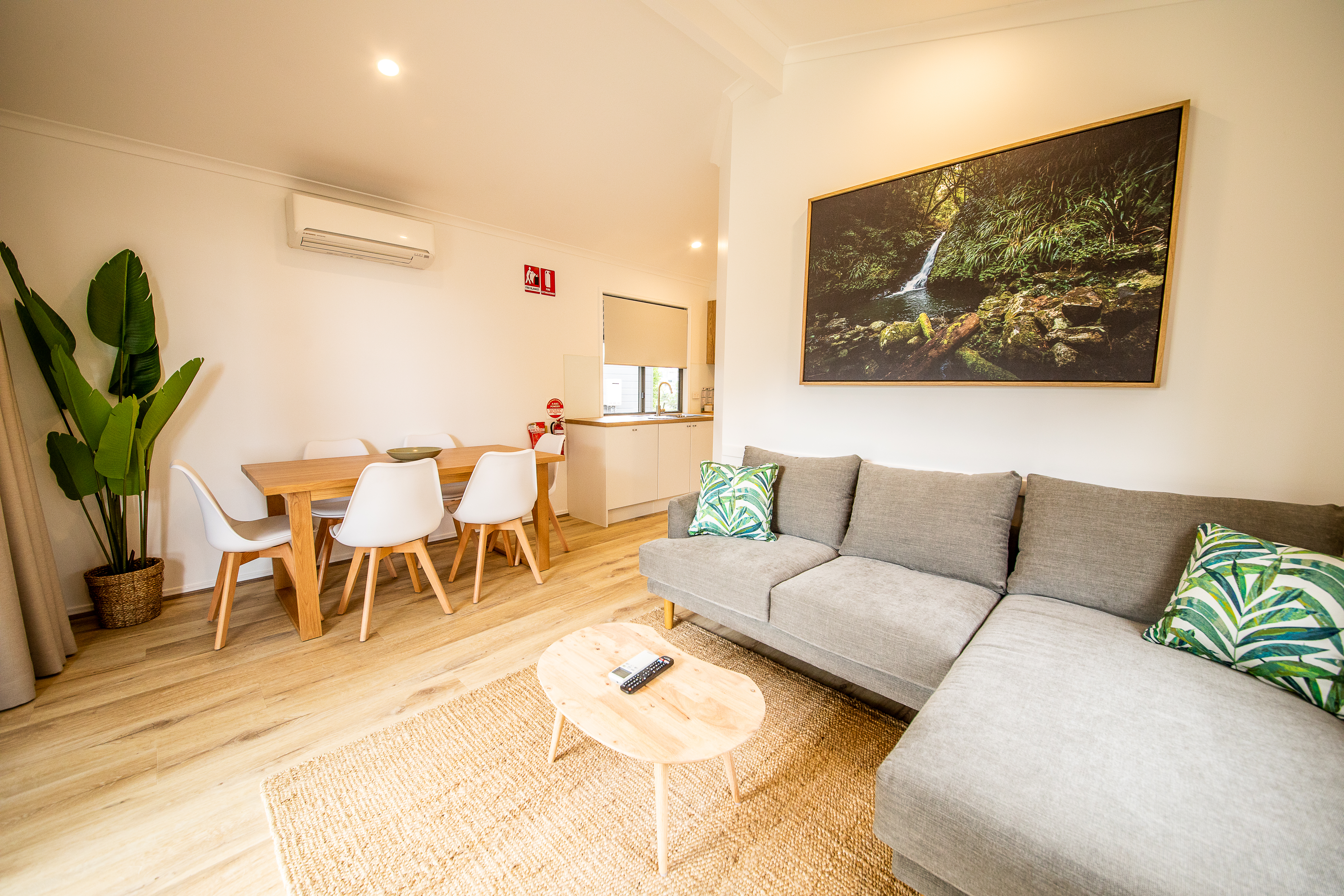 Modern 2 bedroom cabin with room for six sleepy heads to rest after a day filled with fun. The family can spread out across two bedrooms, open plan living and dining area and enjoy a glass of wine, relax on the deck chairs and enjoy the balmy evenings.