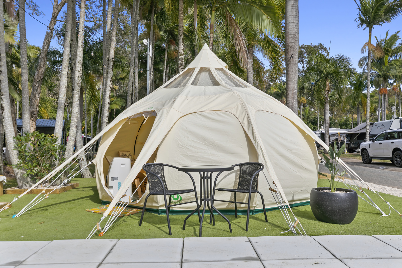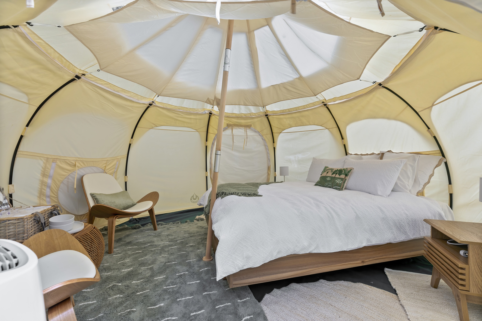 Our Belle Tents sleep two guests with a plush queen bed as well as comfortable and modern furnishings and air conditioning for year-round comfort. With access to amenities, it's the perfect way to immerse yourself in nature with the conveniences of modern living.