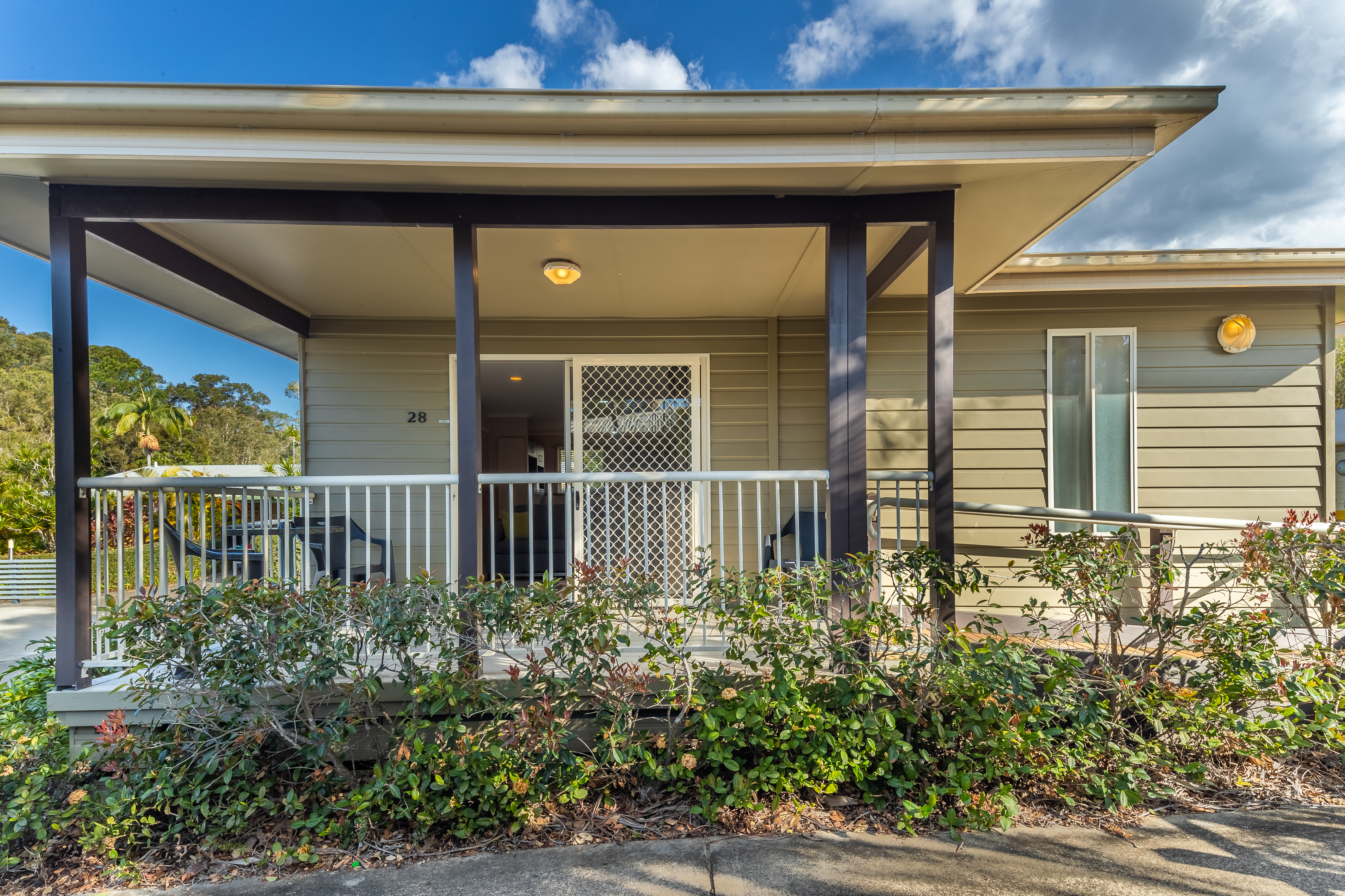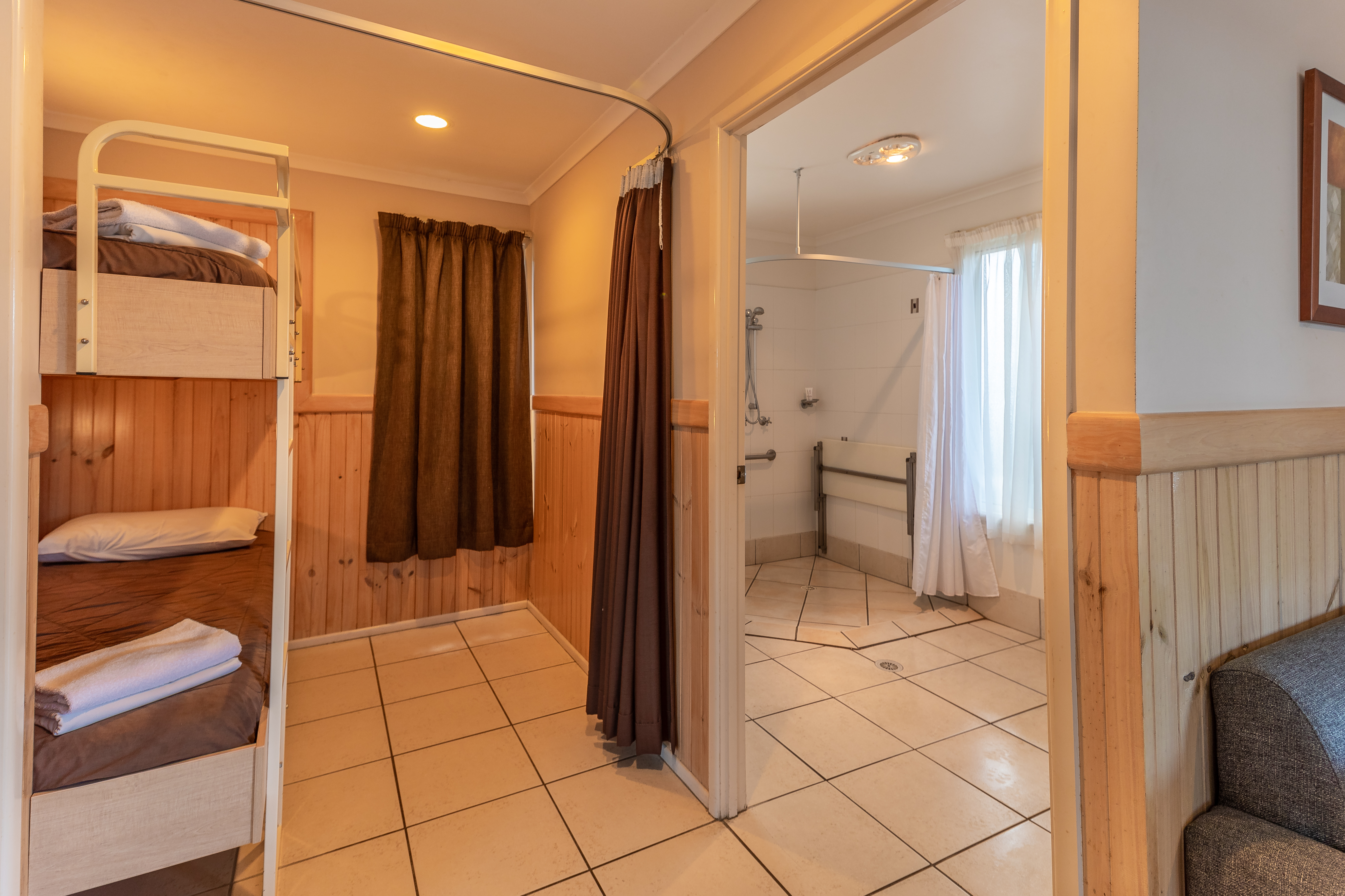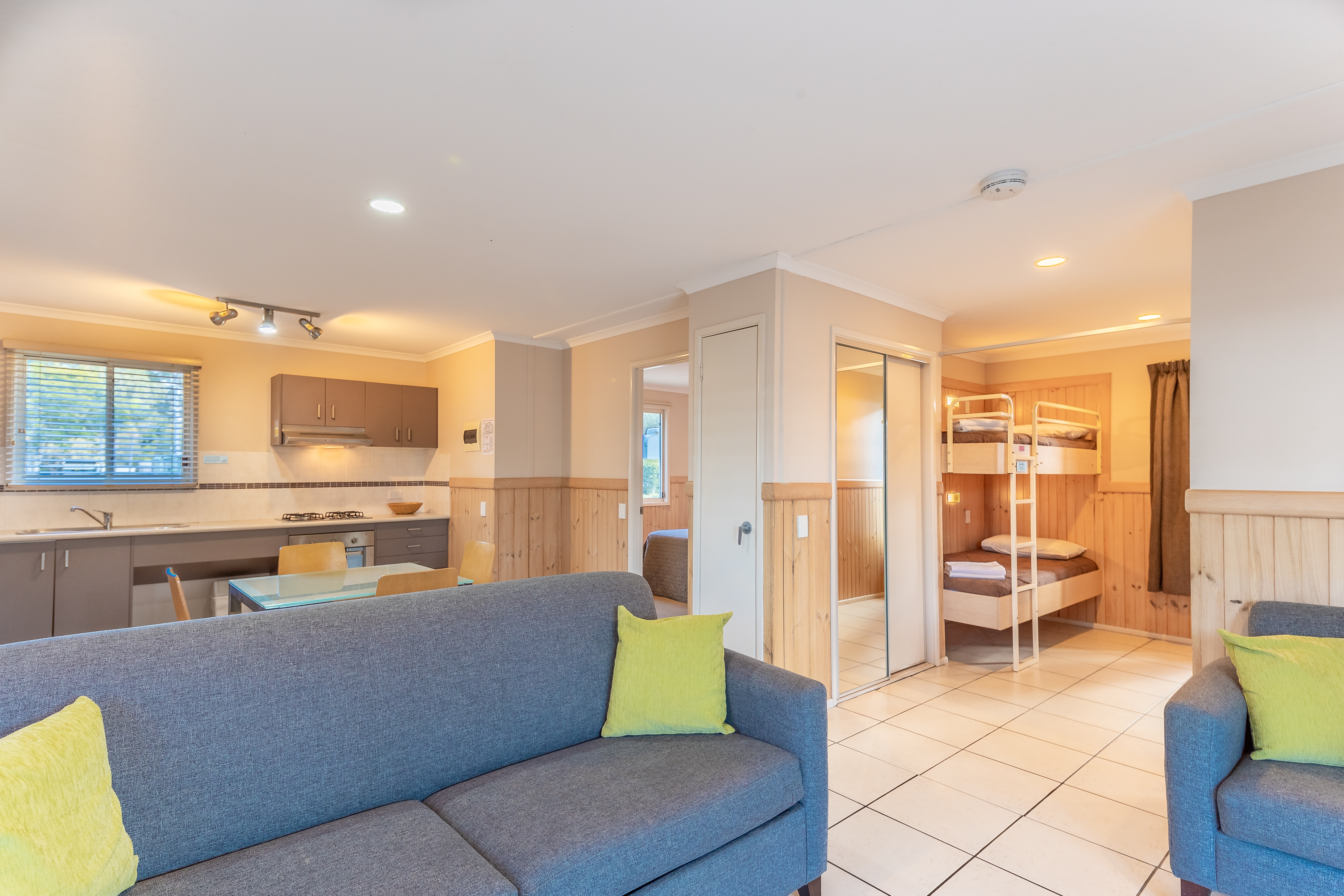 Experience a comfortable and accessible family stay. Our Deluxe Cabins sleep up to four guests with a queen bed in the main bedroom and a bunk (children under 12 only) in an alcove, we well as an accessible bathroom, open plan living area, kitchen, and private deck with ramp entry.