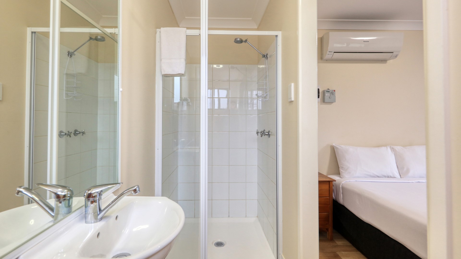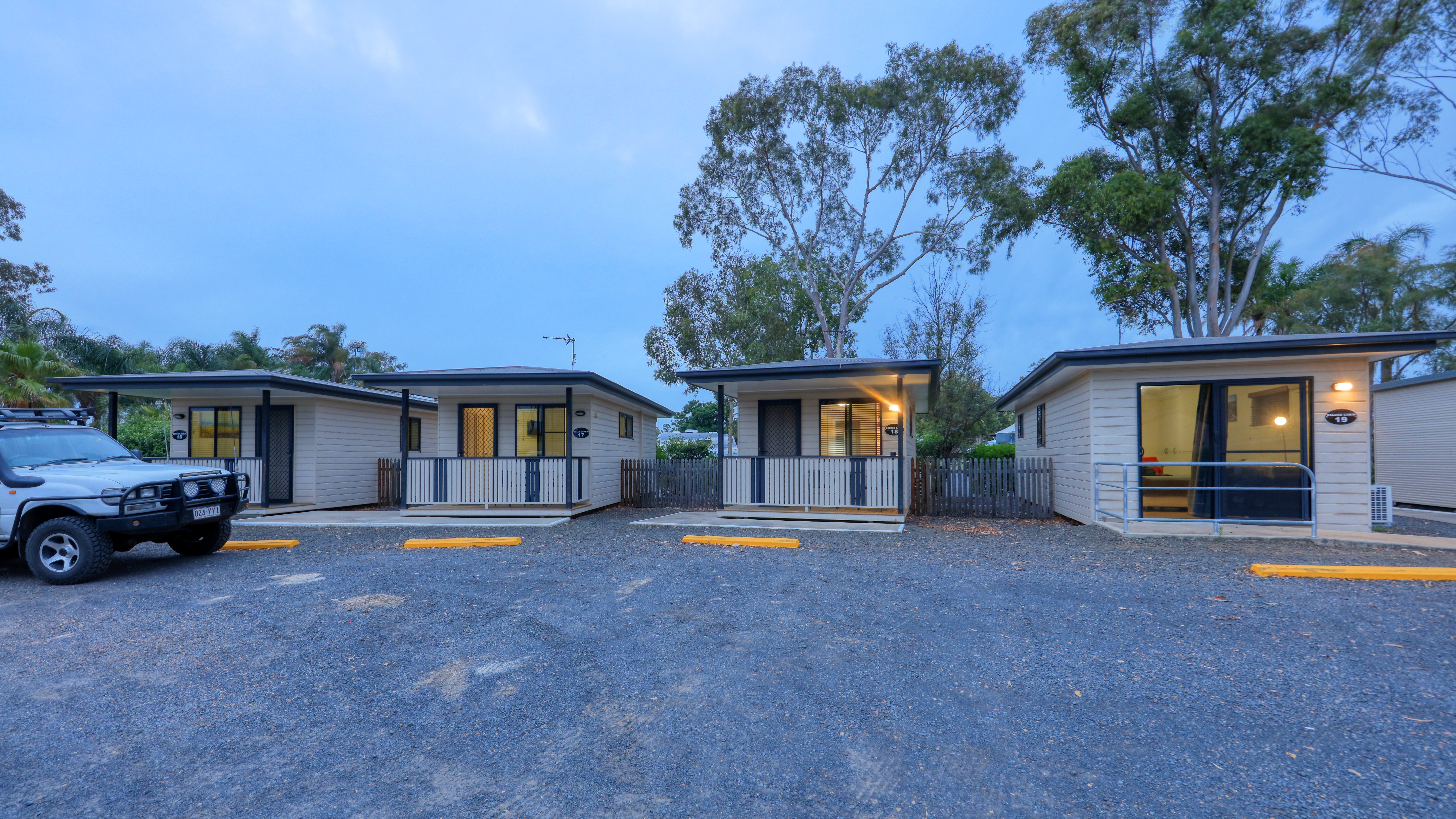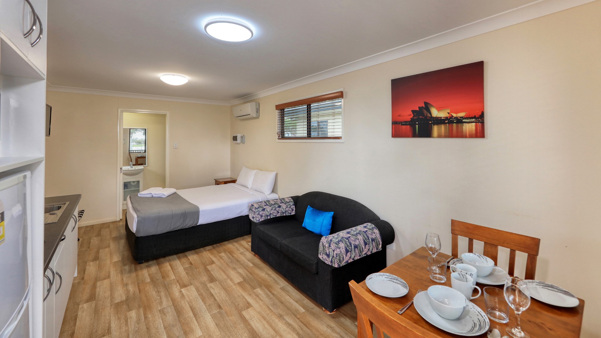 Modern and large studio style cabin. Queen size bed, own ensuite. Fully self-contained and complete with table & chairs, lounge, cook top, microwave, fridge, toaster, kettle, cooking utensils, large TV, air con. Own balcony. All linen supplied.