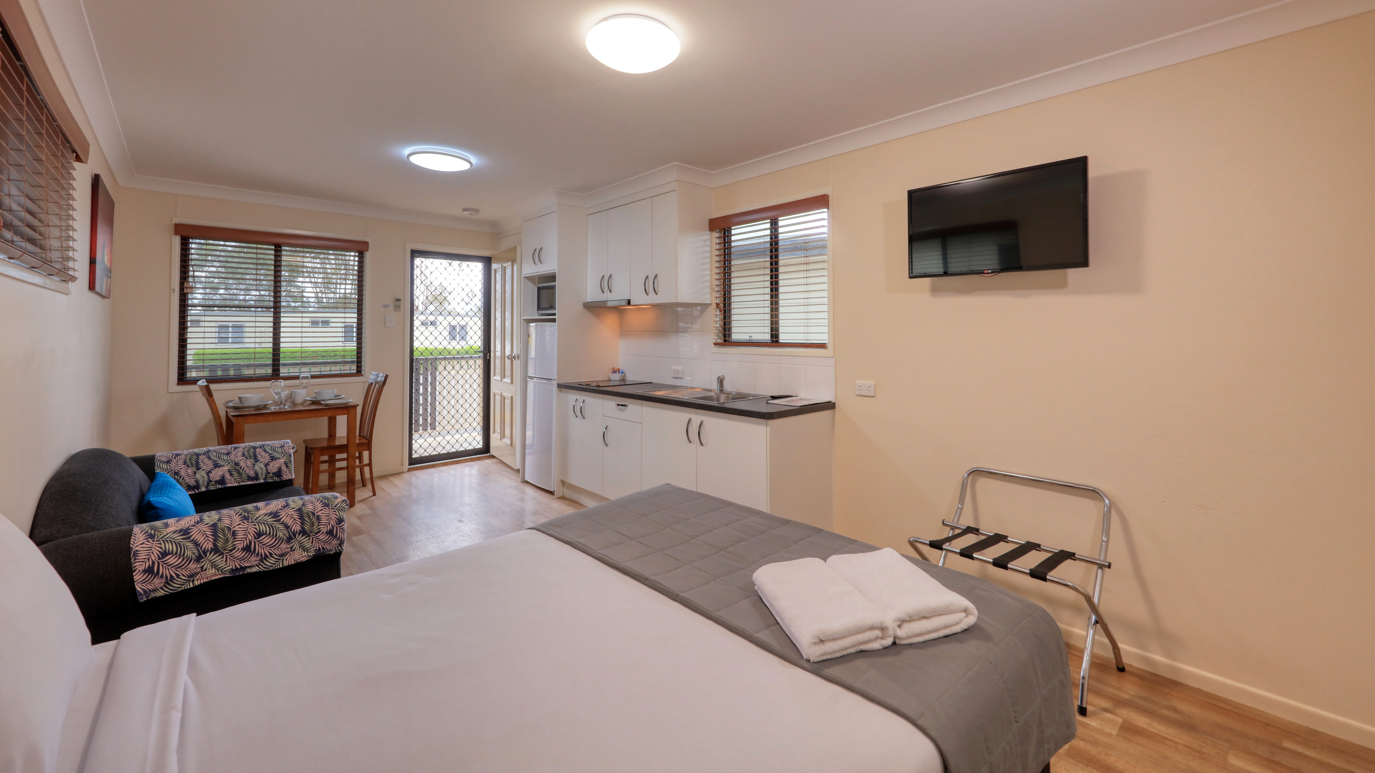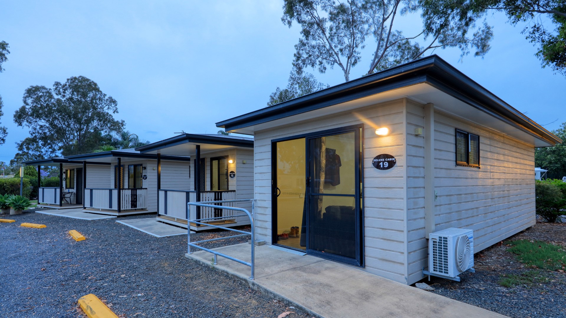 Modern and large studio style cabin. Queen size bed, own ensuite. Fully self-contained and complete with table & chairs, lounge, cook top, microwave, fridge, toaster, kettle, cooking utensils, large TV, air con. Own balcony. All linen supplied.