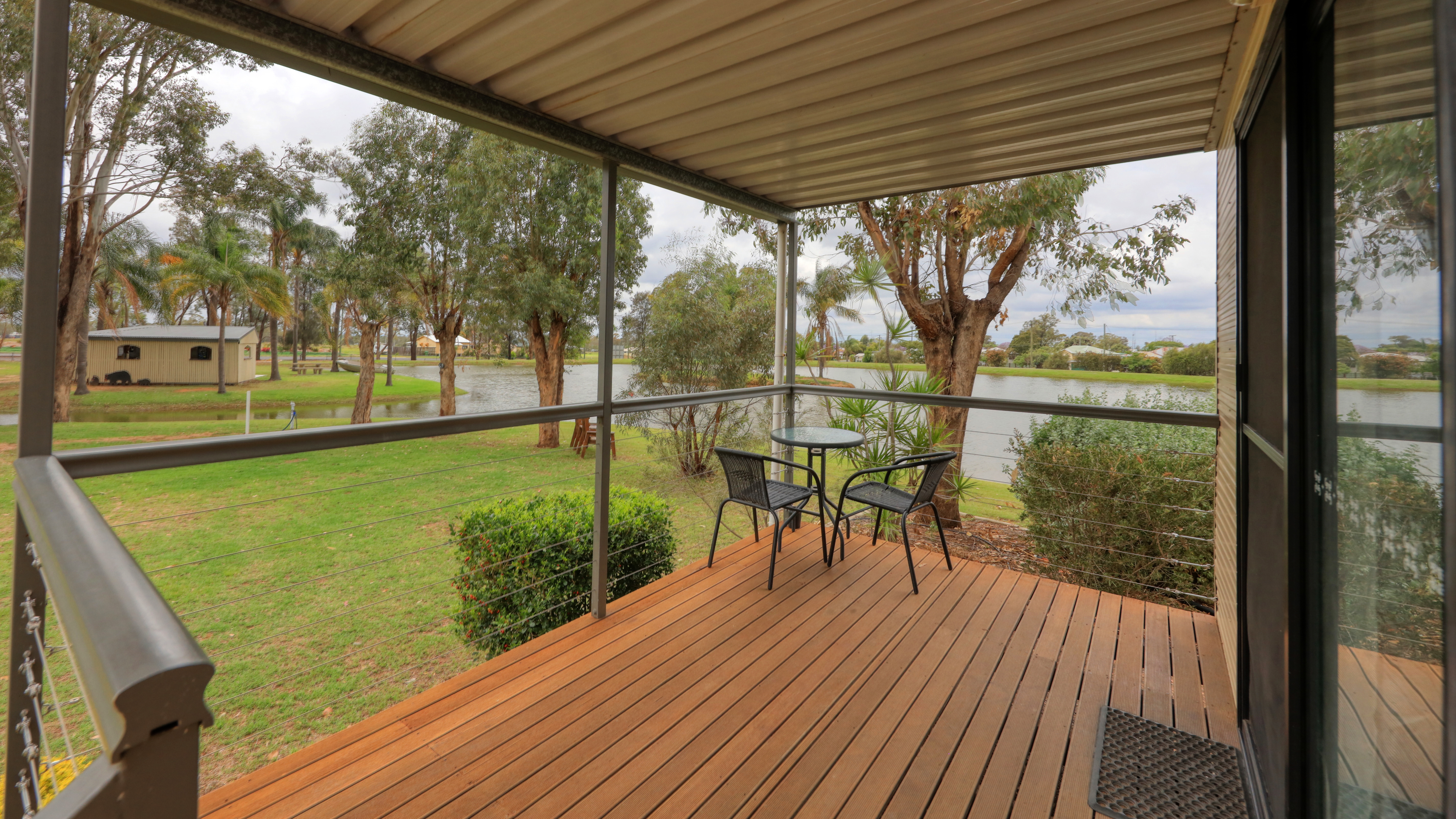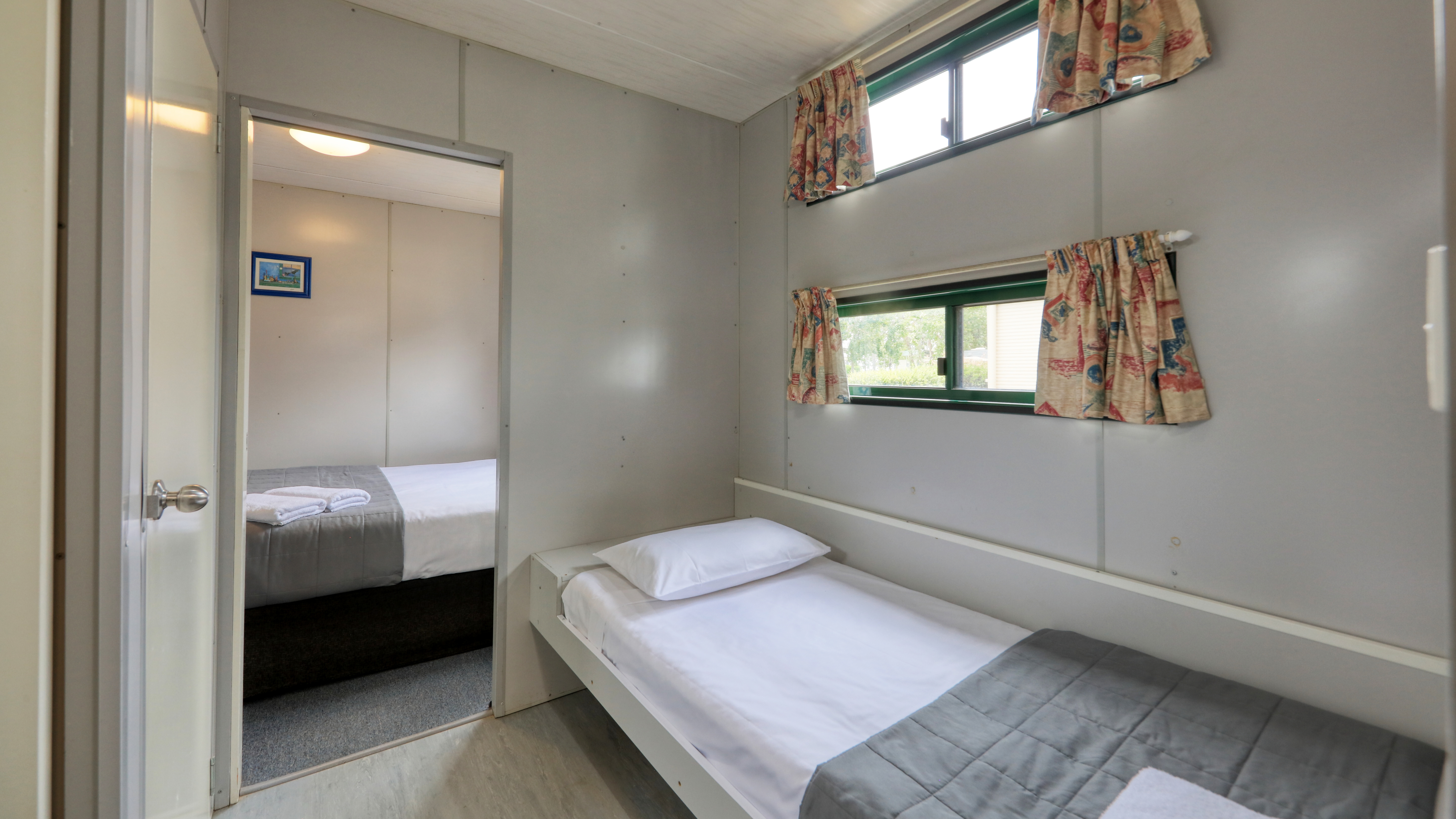 This large Family Cabin sleeps 3 with a queen bed in the main room, separated by sliding door from the rest of the cabin. There is a king single bed opposite the bathroom in the walk through with a sliding door separating the main living area which has a kids sofa bed. A lovely large deck that overlooks the lake.
