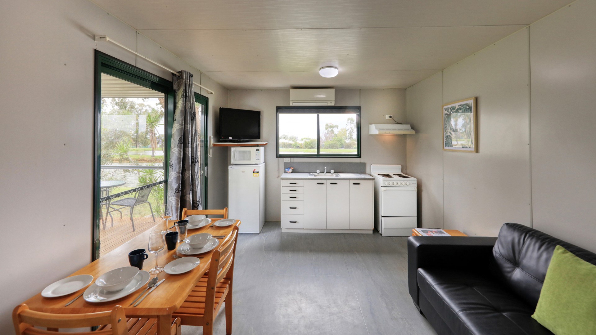 Our Family Cabin is fully self-contained and complete with table and chairs, lounge, cook top stove, microwave, new modern large TV, new split system air con, own bathroom, fridge, toaster, kettle, cooking utensils, etc. All linen supplied. Parking space at your front door.