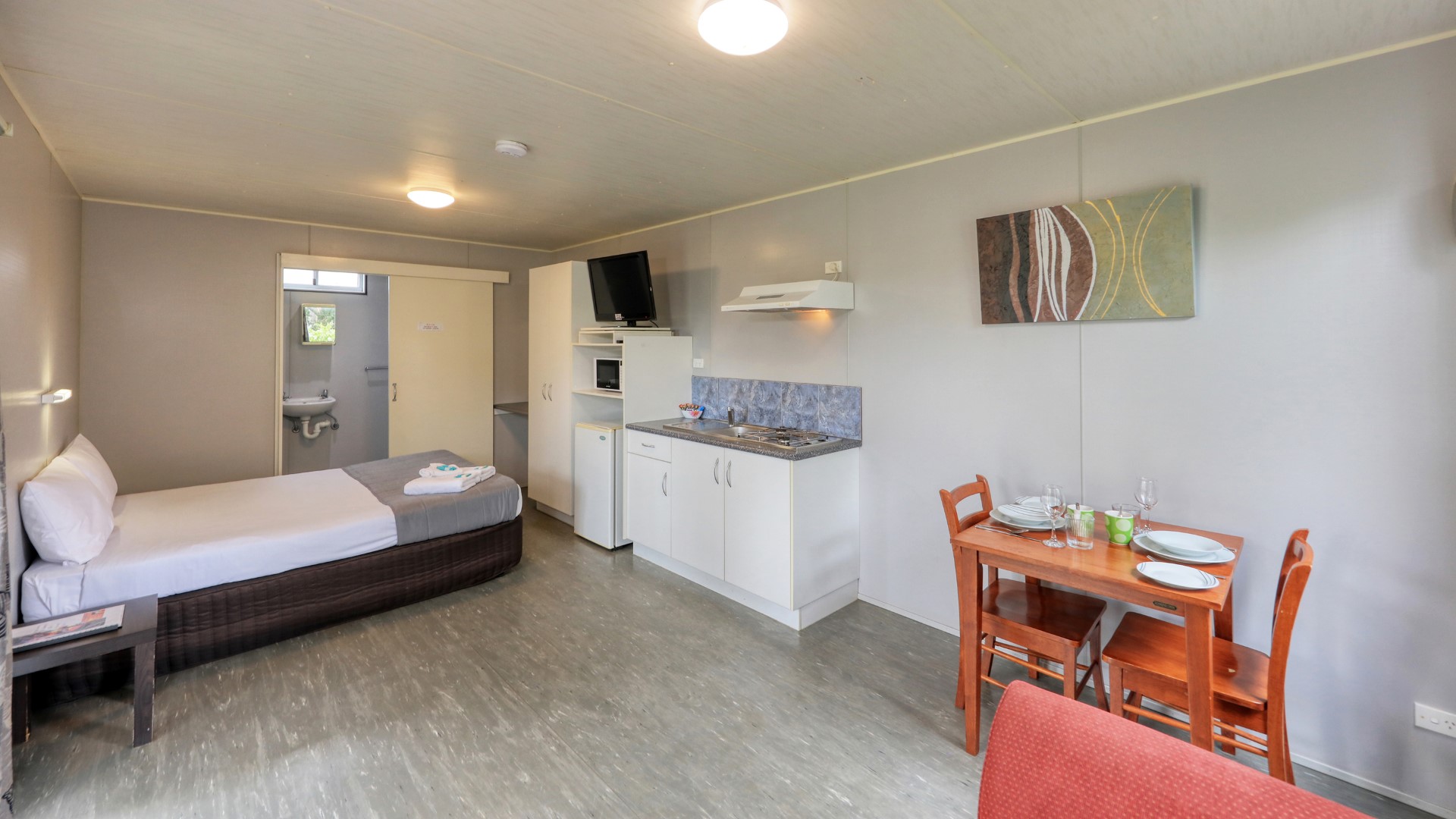 Large studio style cabin. Queen size bed, own ensuite. Fully self-contained and complete with table & chairs, lounge, gas cook top, microwave, fridge, toaster, kettle, cooking utensils, large TV, air con. Own balcony. All linen supplied.