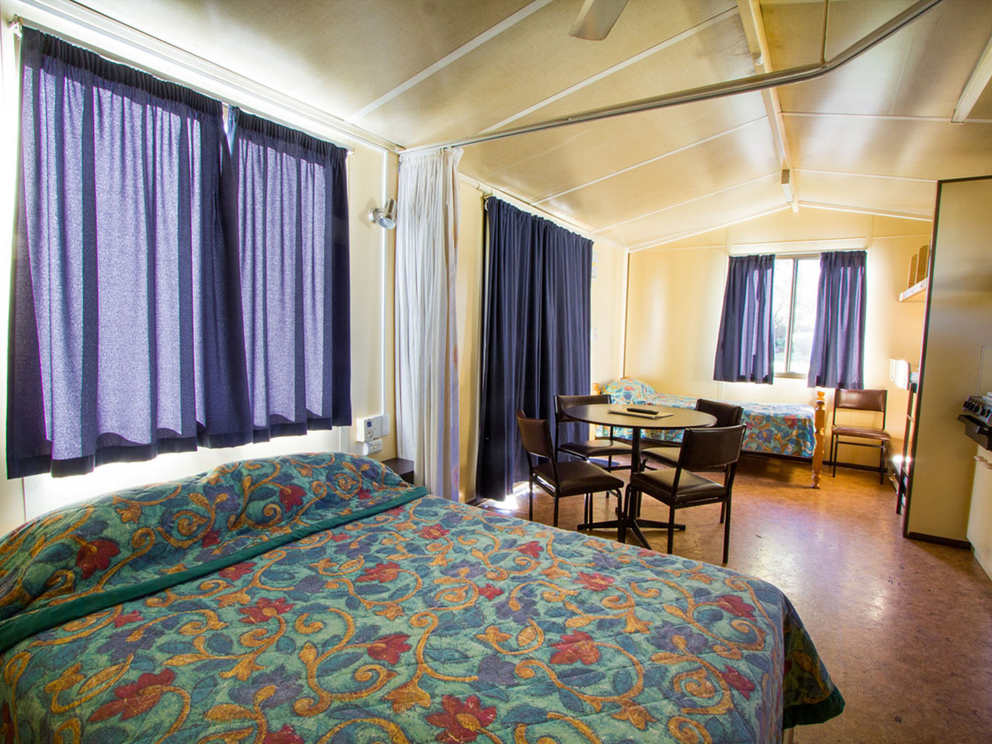 It features a private ensuite, TV, and a kitchenette with gas oven, stovetop, microwave, and bar fridge. Located near the BBQ area and communal facilities, it’s a convenient and budget-friendly choice.