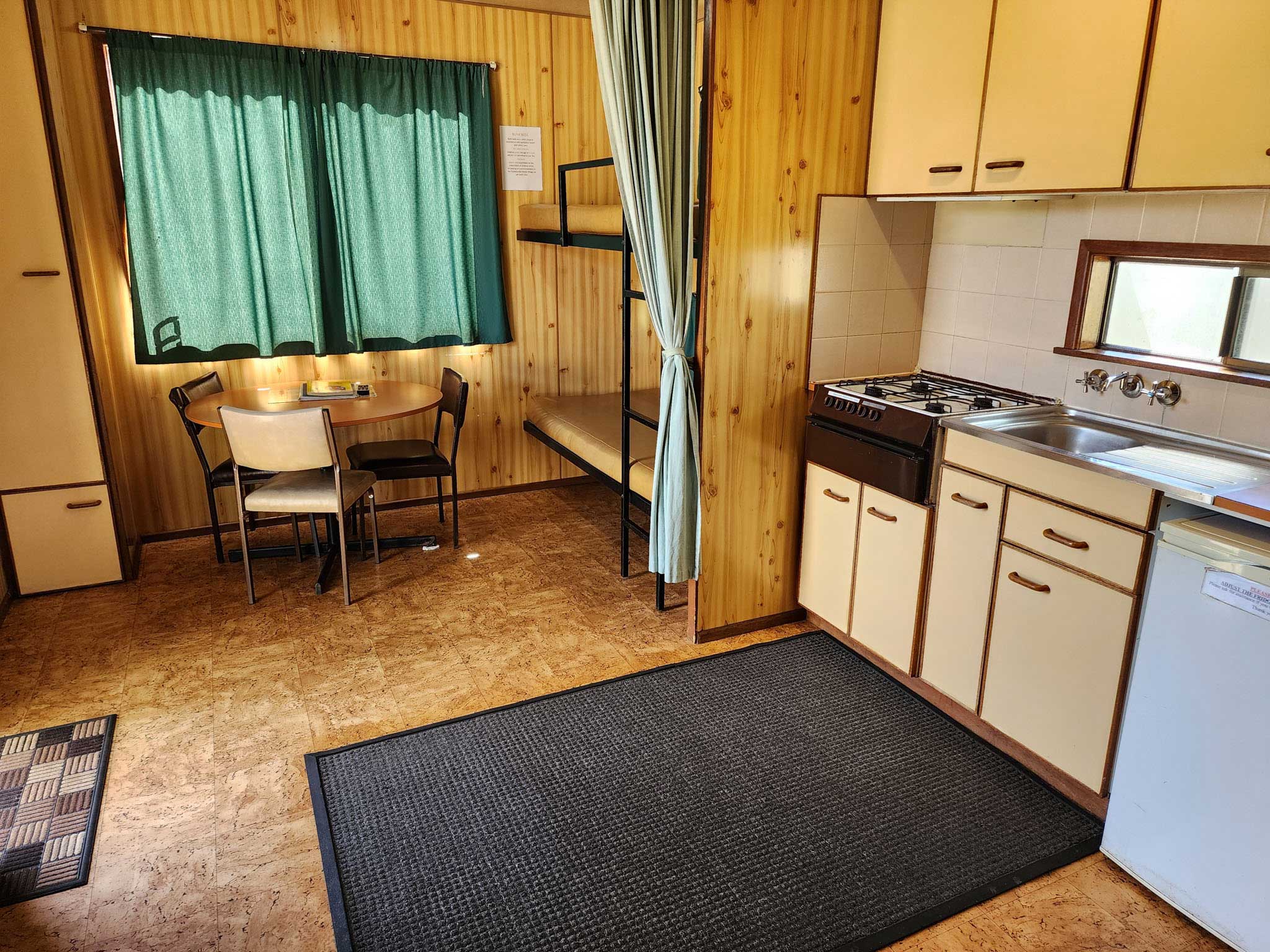 The kitchenette includes a gas stovetop, microwave, toaster, kettle, and bar fridge—everything you need for easy meals.