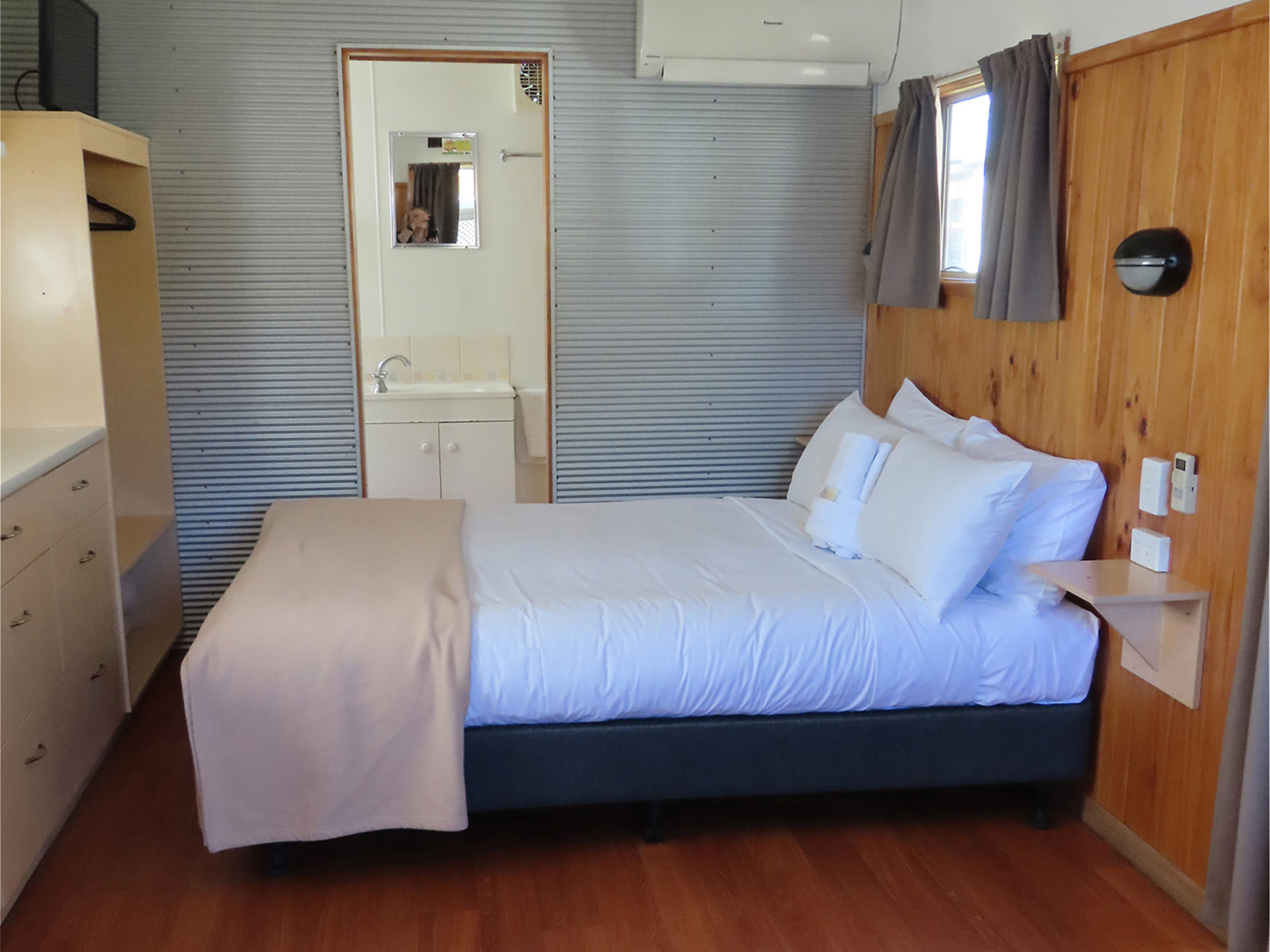 This fully self contained lovingly restored open plan style cabin has a double bed, set of bunks, ensuite, cooking facilities and split system/reverse cycle air conditioning and digital television for you to enjoy. This is the perfect choice for the budget conscious traveller. Our ensuite cabins are close to all of the park facilities, BBQs, herb gardens, laundry and pool.