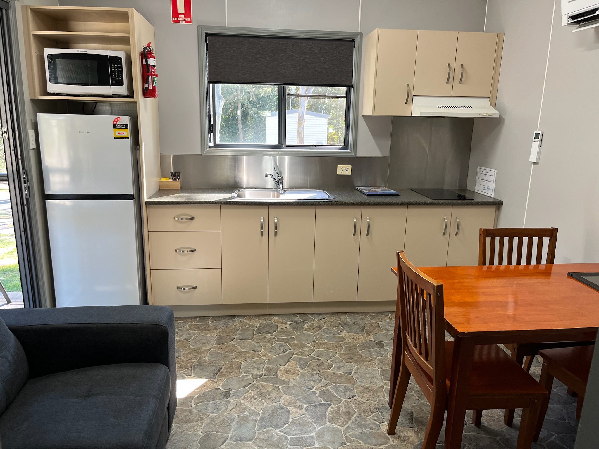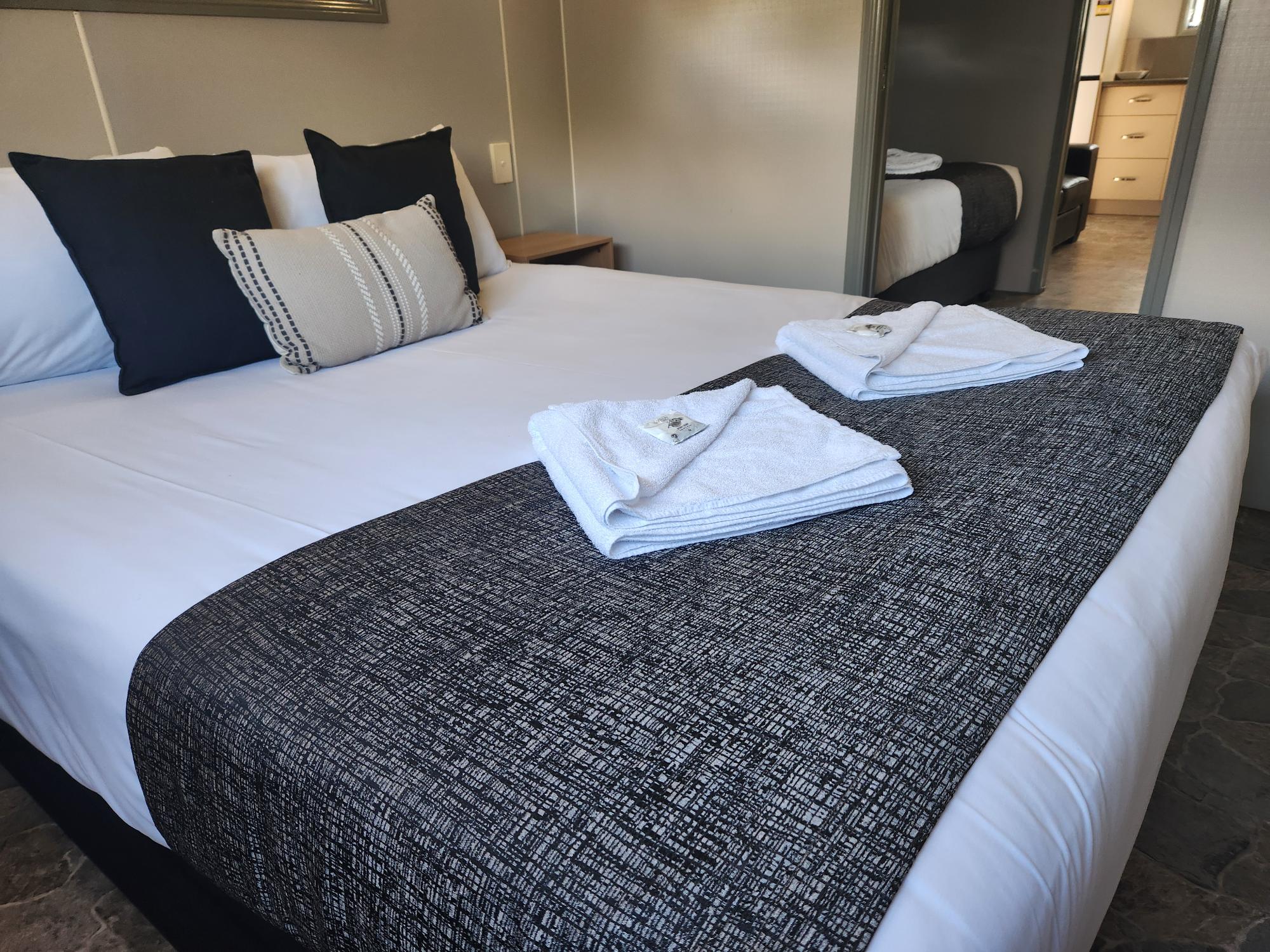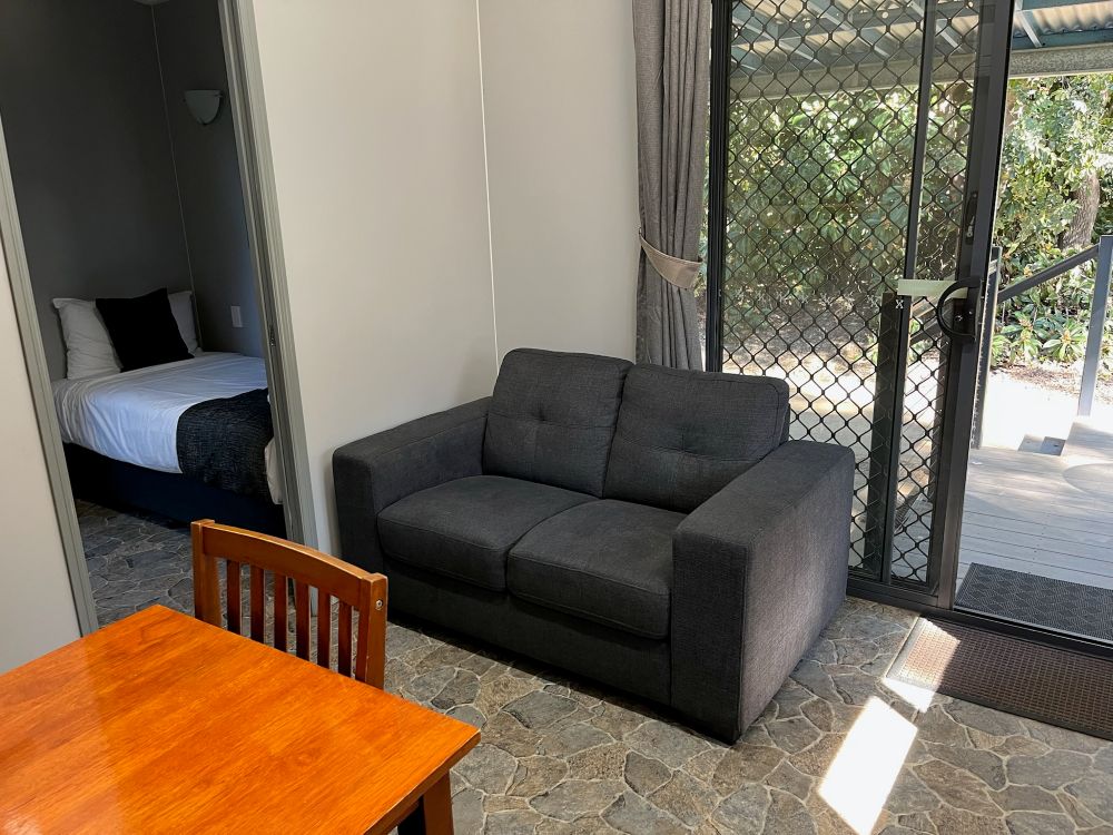 These well appointed units have a queen bed in the main bedroom and a single bed in a separate alcove. All linen provided. The self contained kitchen has a full size fridge and freezer, dining table and lounge with flat screen TV, reverse cycle air conditioning and a furnished deck with car parking alongside the unit.