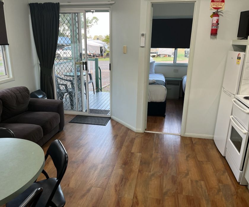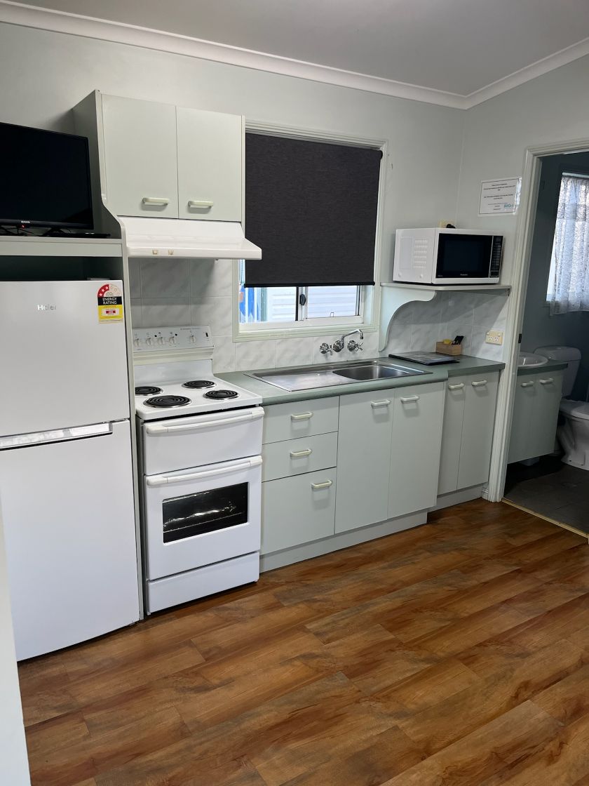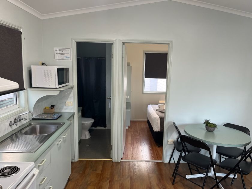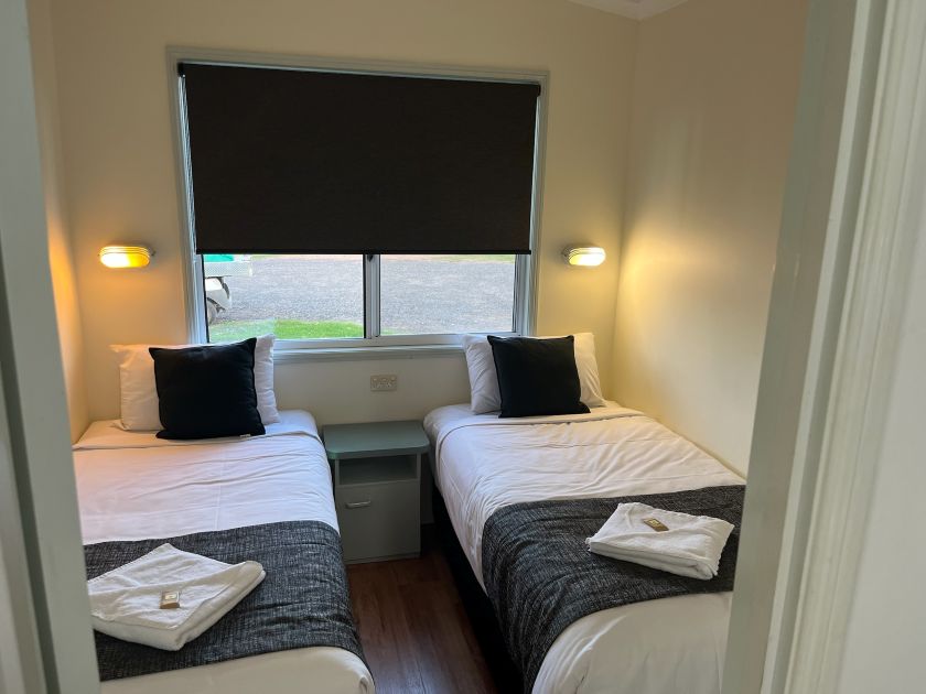 The Two Bedroom Standard Cabins have a queen and 2 single beds with all linen provided. They have a fully self contained kitchen with dining table and flat screen TV, bathroom, reverse cycle air conditioning, and car parking nearby.