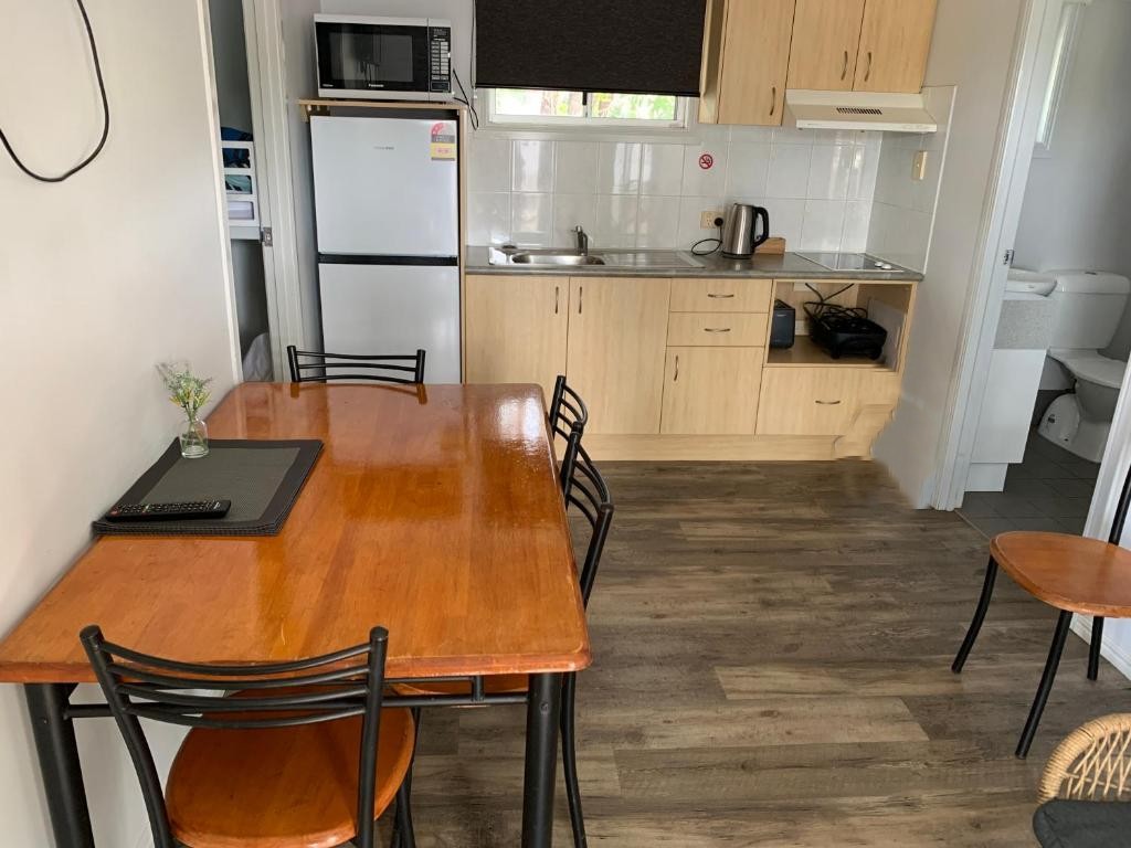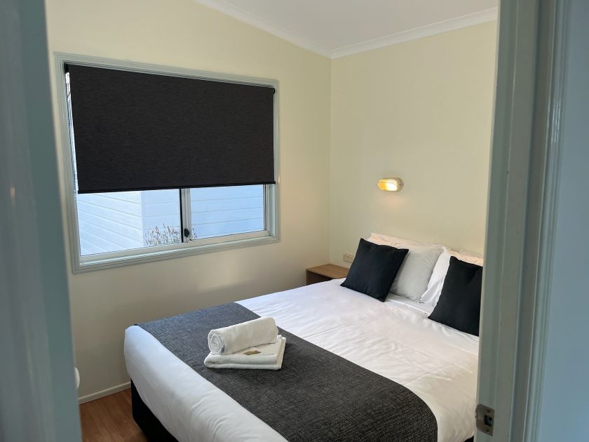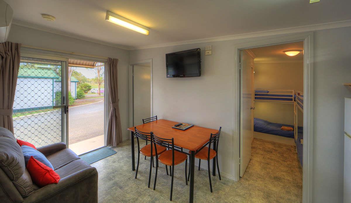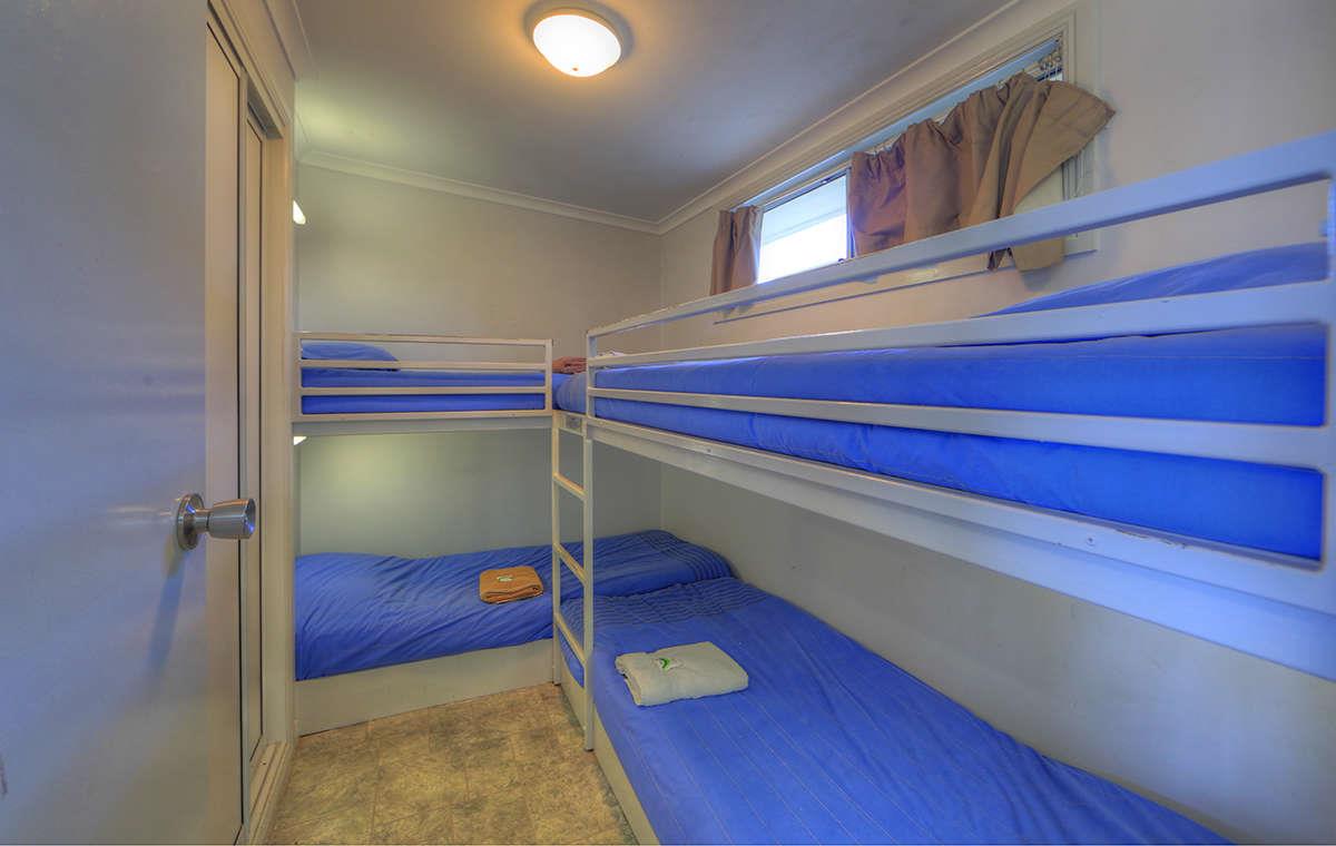 These two bedroom Family Cabins have a queen bed in the main bedroom and 2 sets of bunks in the second bedroom. All linen provided. They have a fully self contained kitchen, dining room, lounge, TV, reverse cycle air-conditioning and parking nearby.