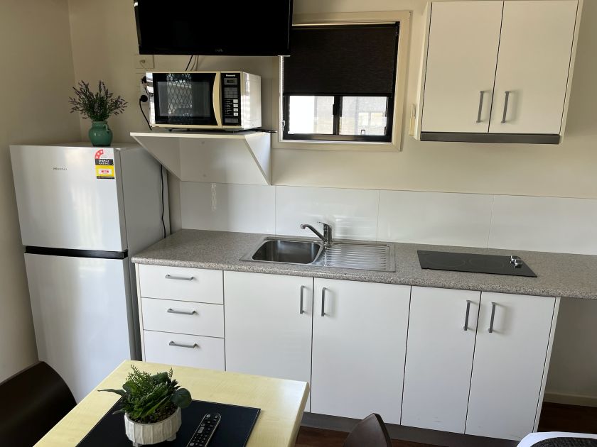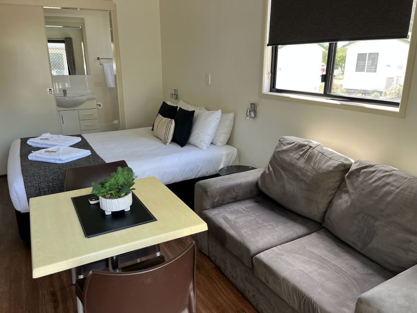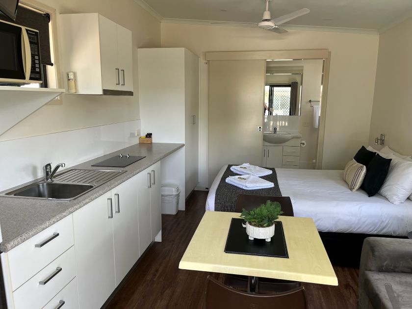 Our Premium Open Plan Villas have a double bed with linen provided. Sleeps 2. They feature a kitchenette, lounge, TV, reverse cycle air conditioning, bathroom and parking nearby.