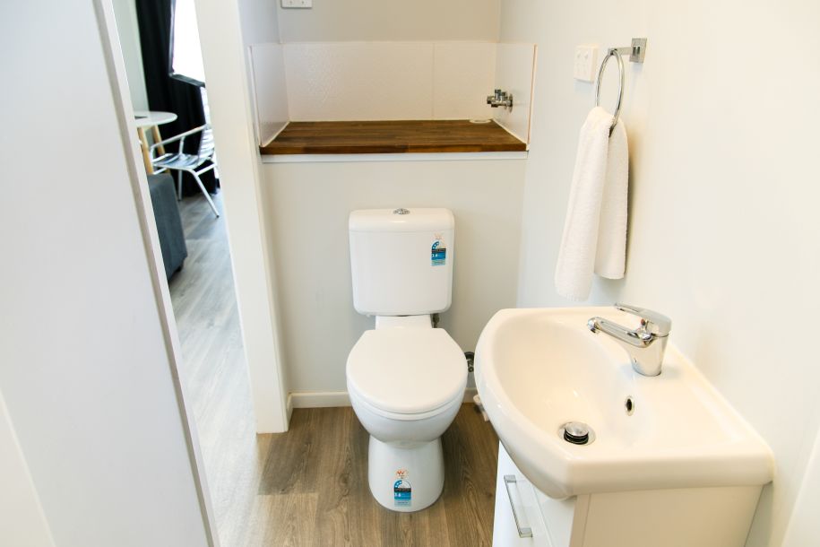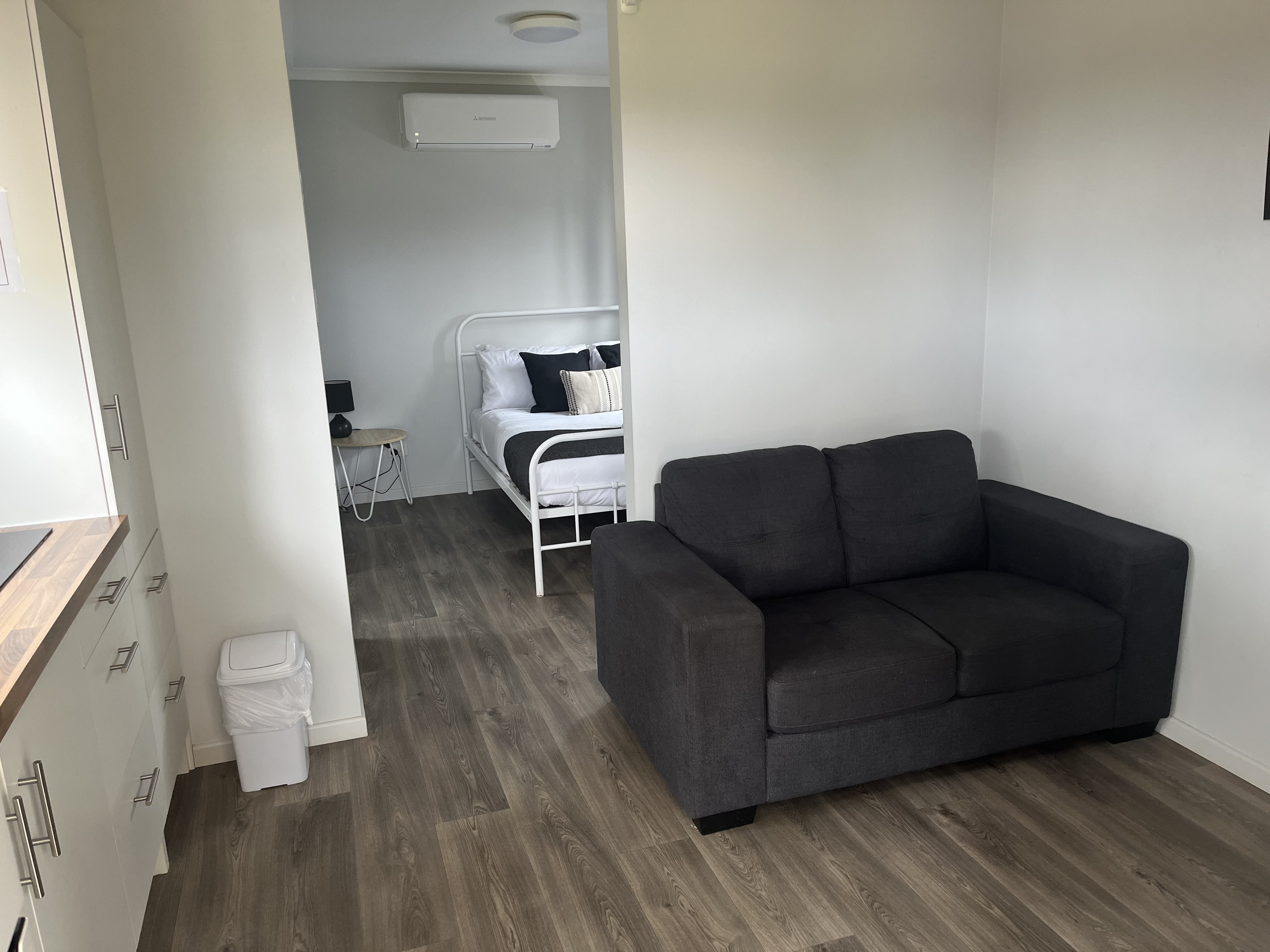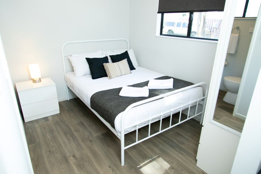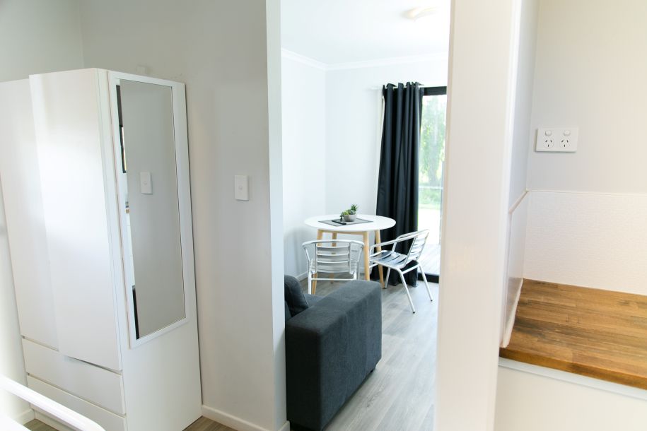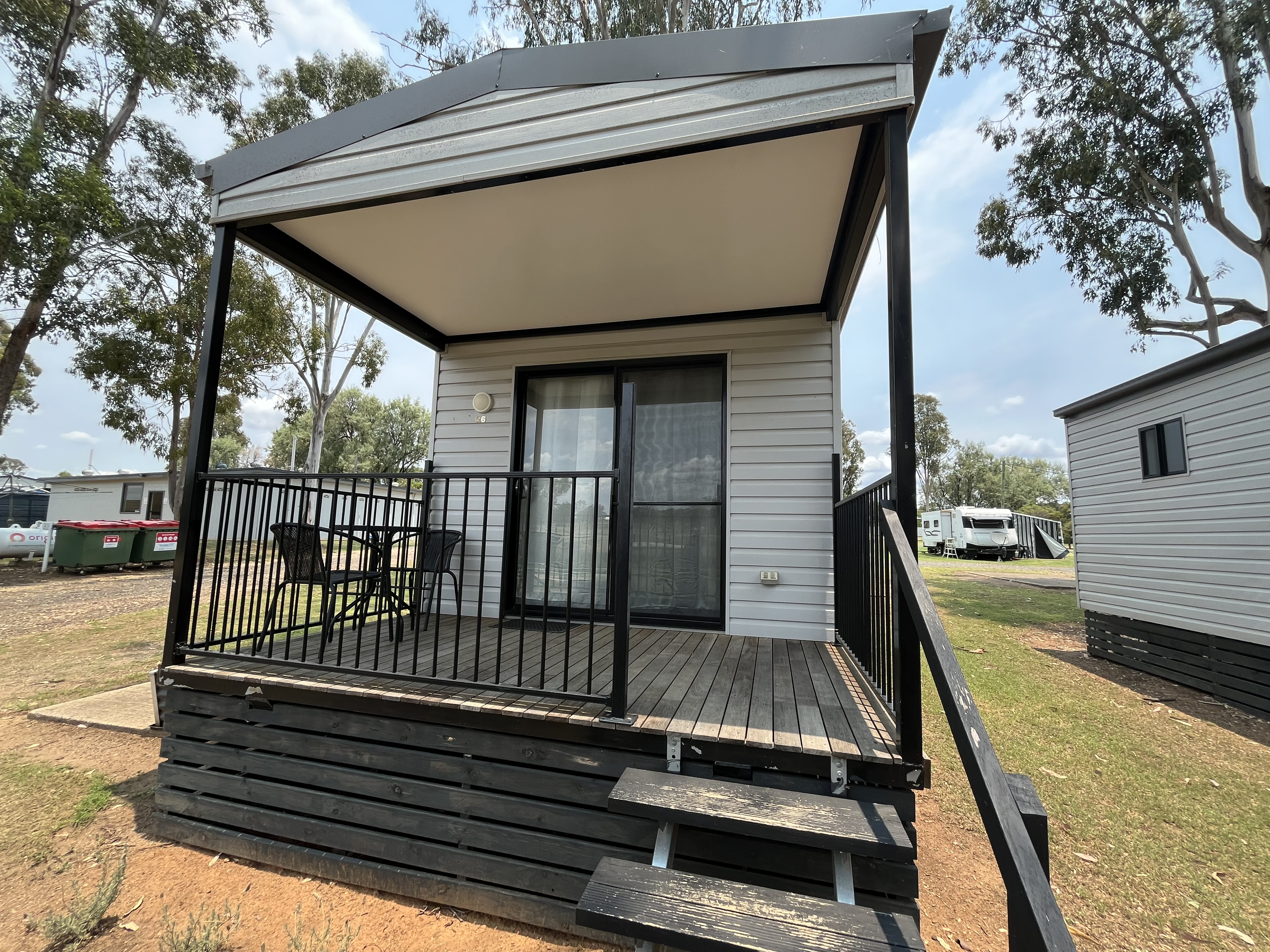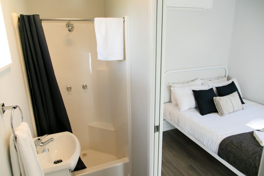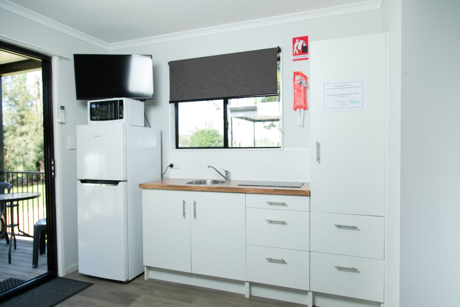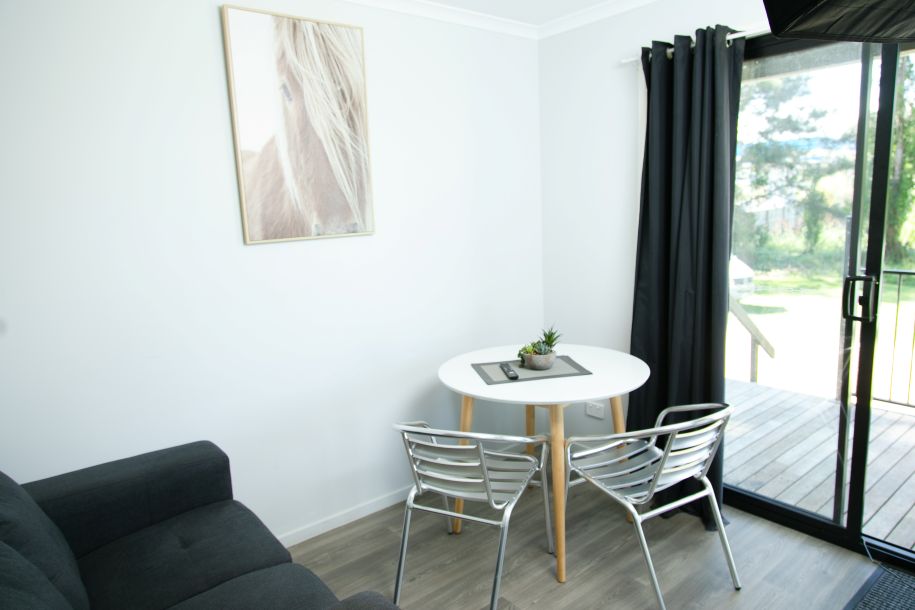 These modern open plan cabins have a queen bed in the main bedroom with linen provided. A divider wall separates the bedroom from the main living area. They have a self-contained kitchen, bathroom, lounge, and dining table with a flat-screen TV and reverse cycle air conditioning. Relax on the decked verandah within a bush setting. Parking alongside the cabin.