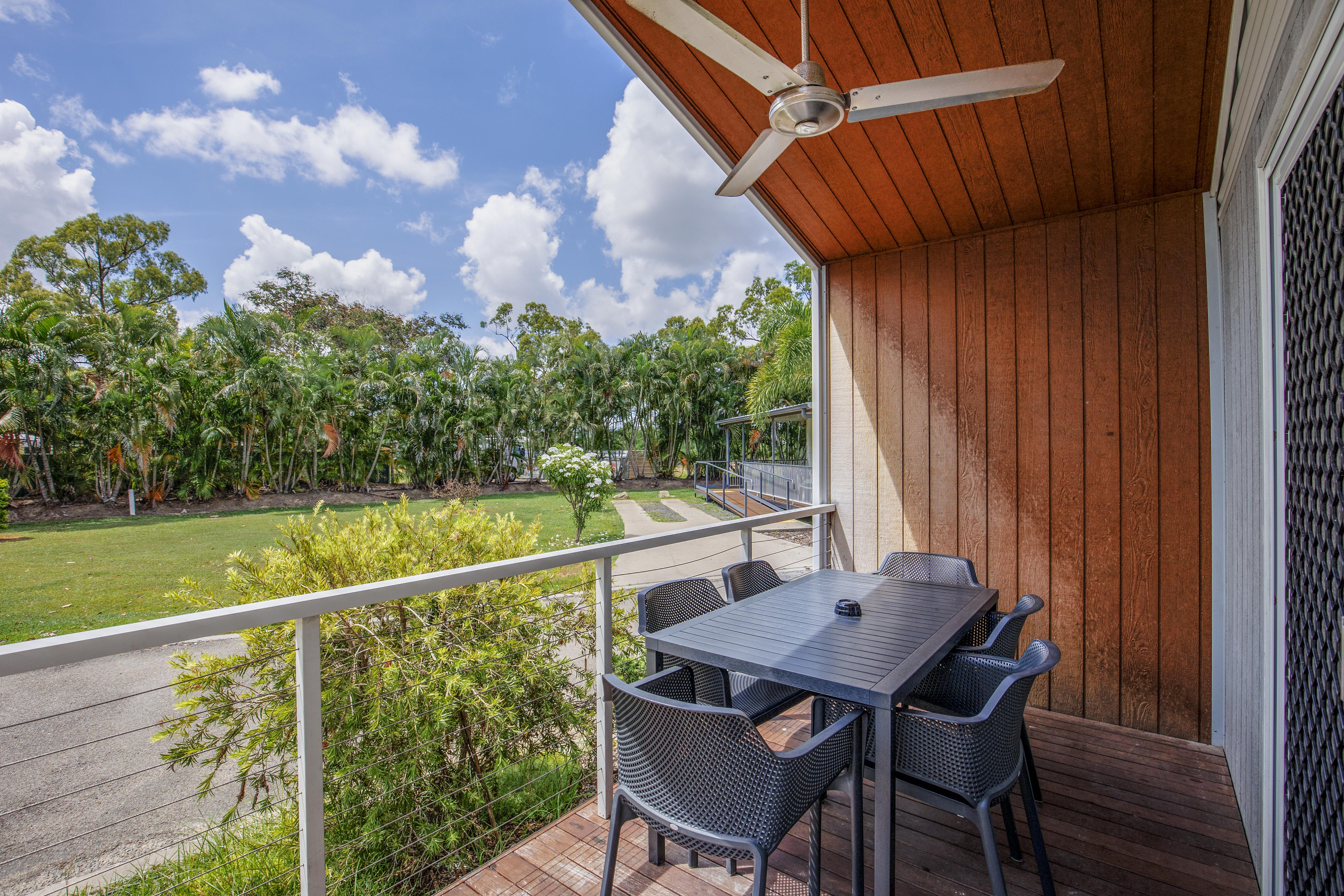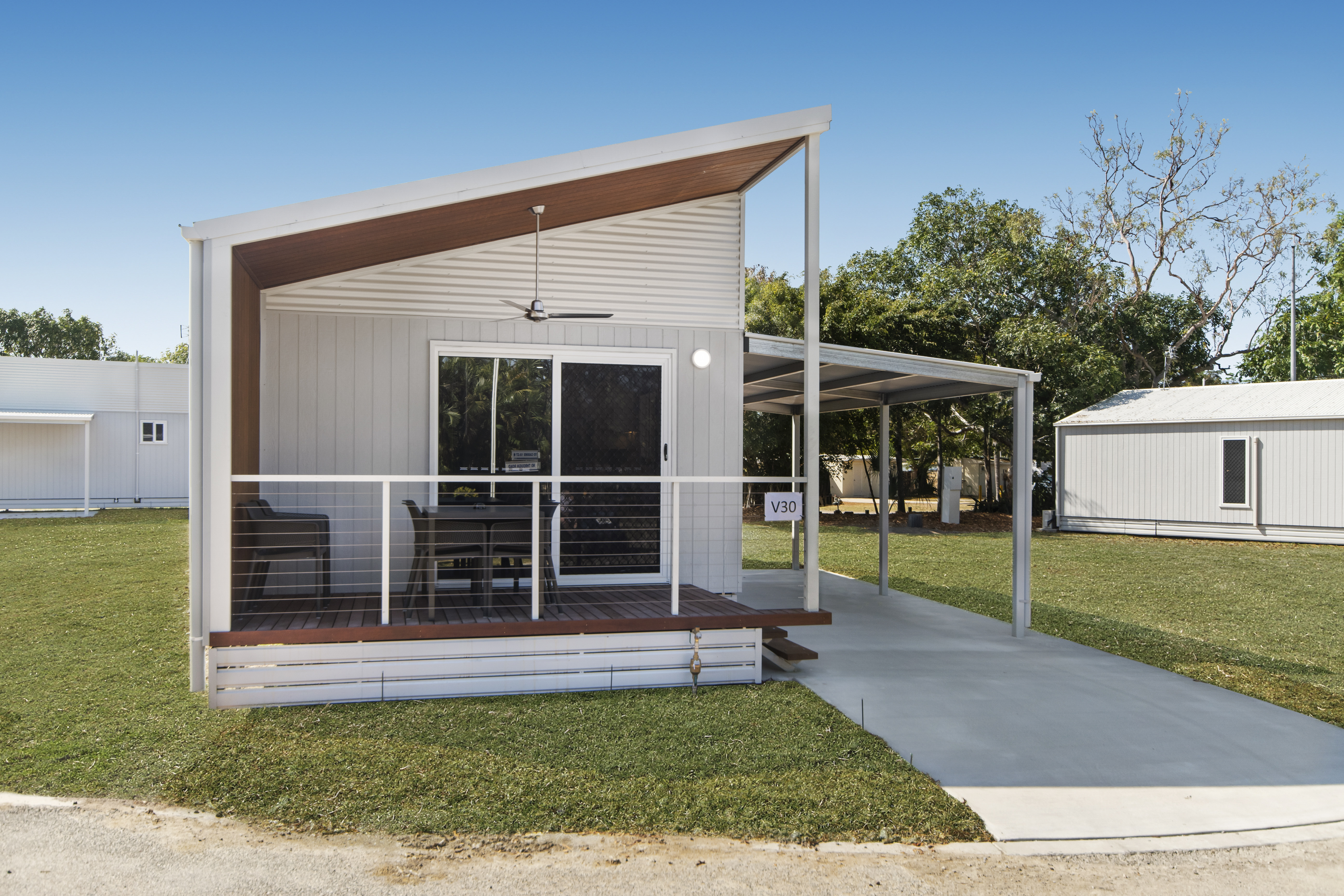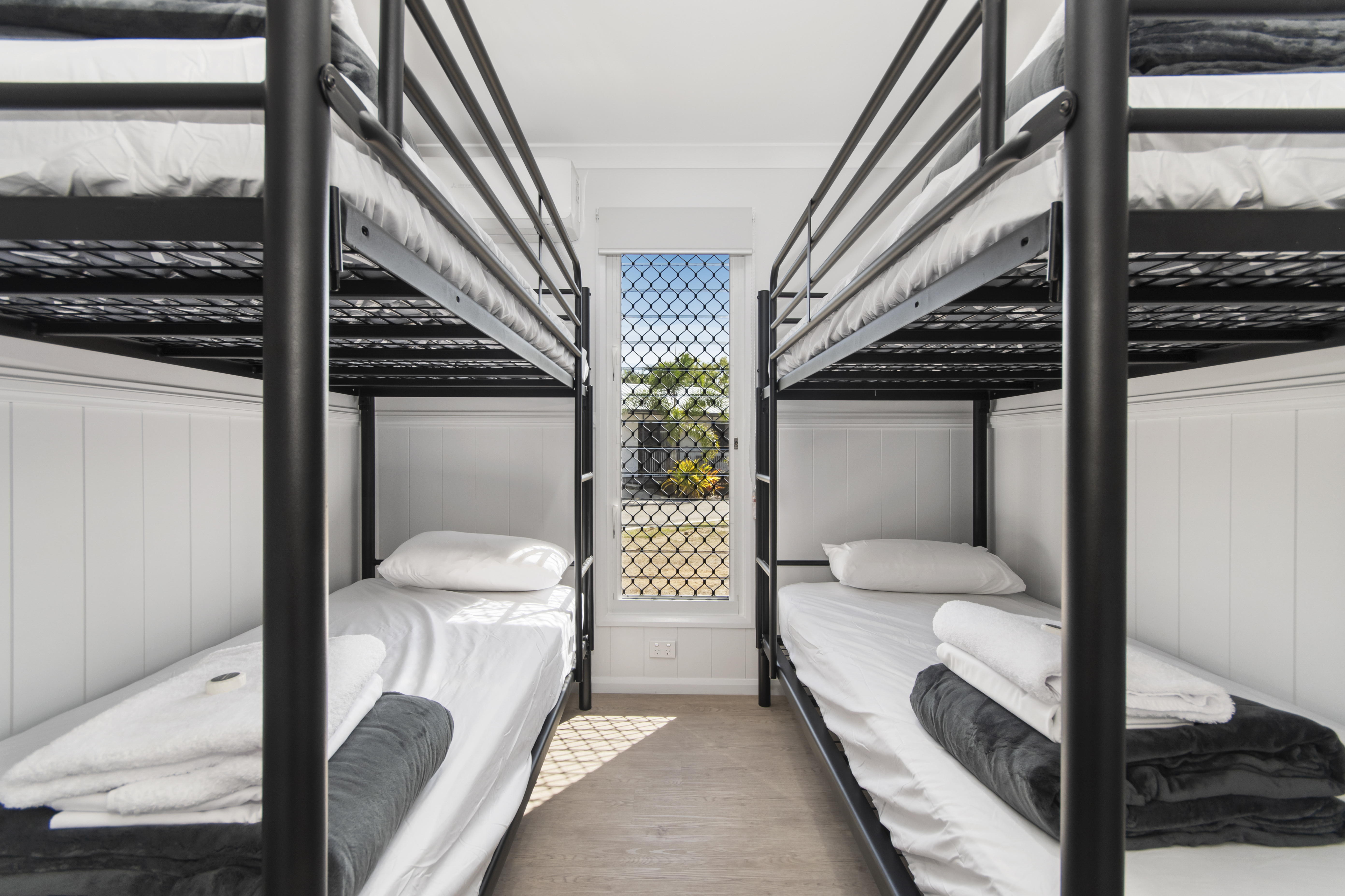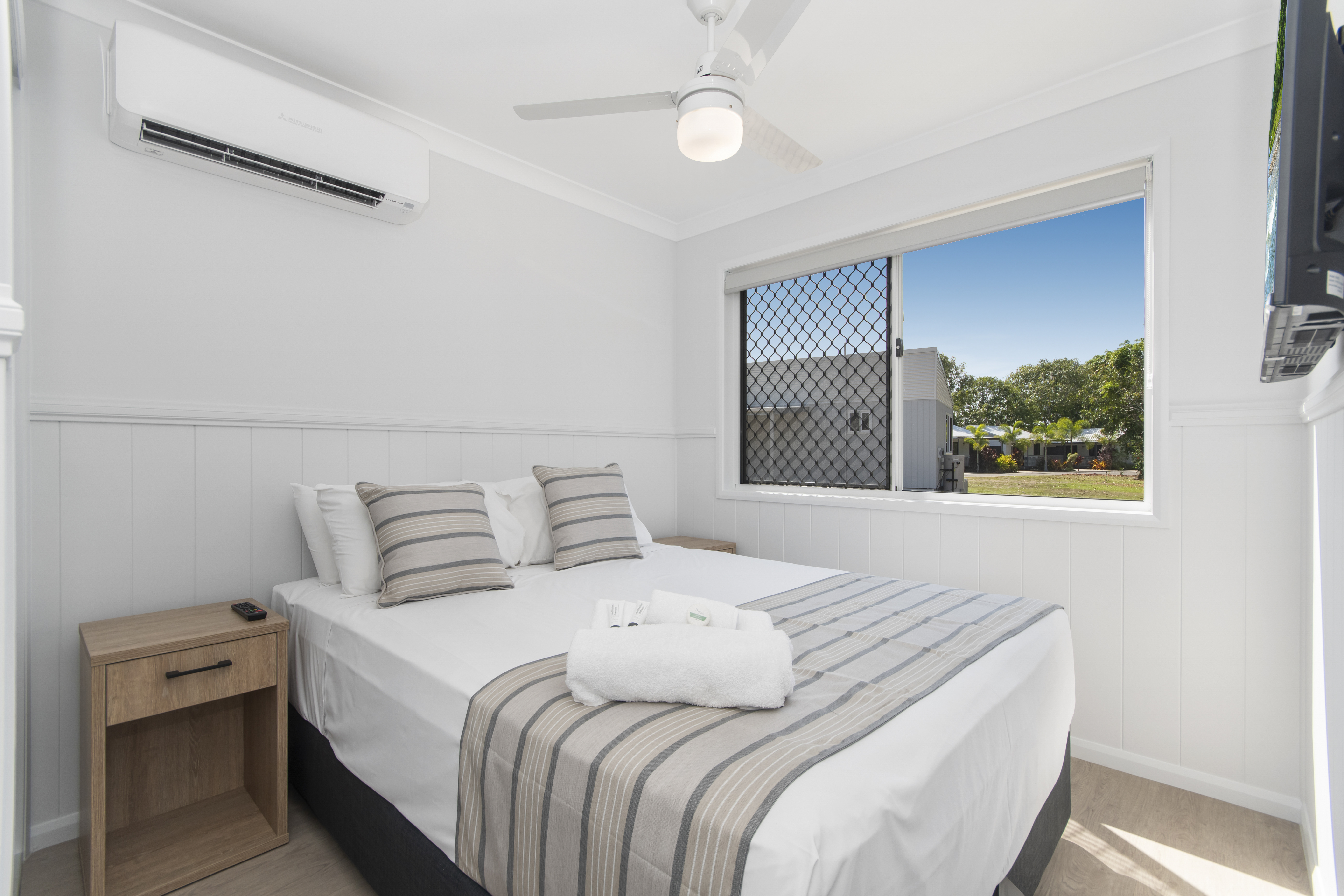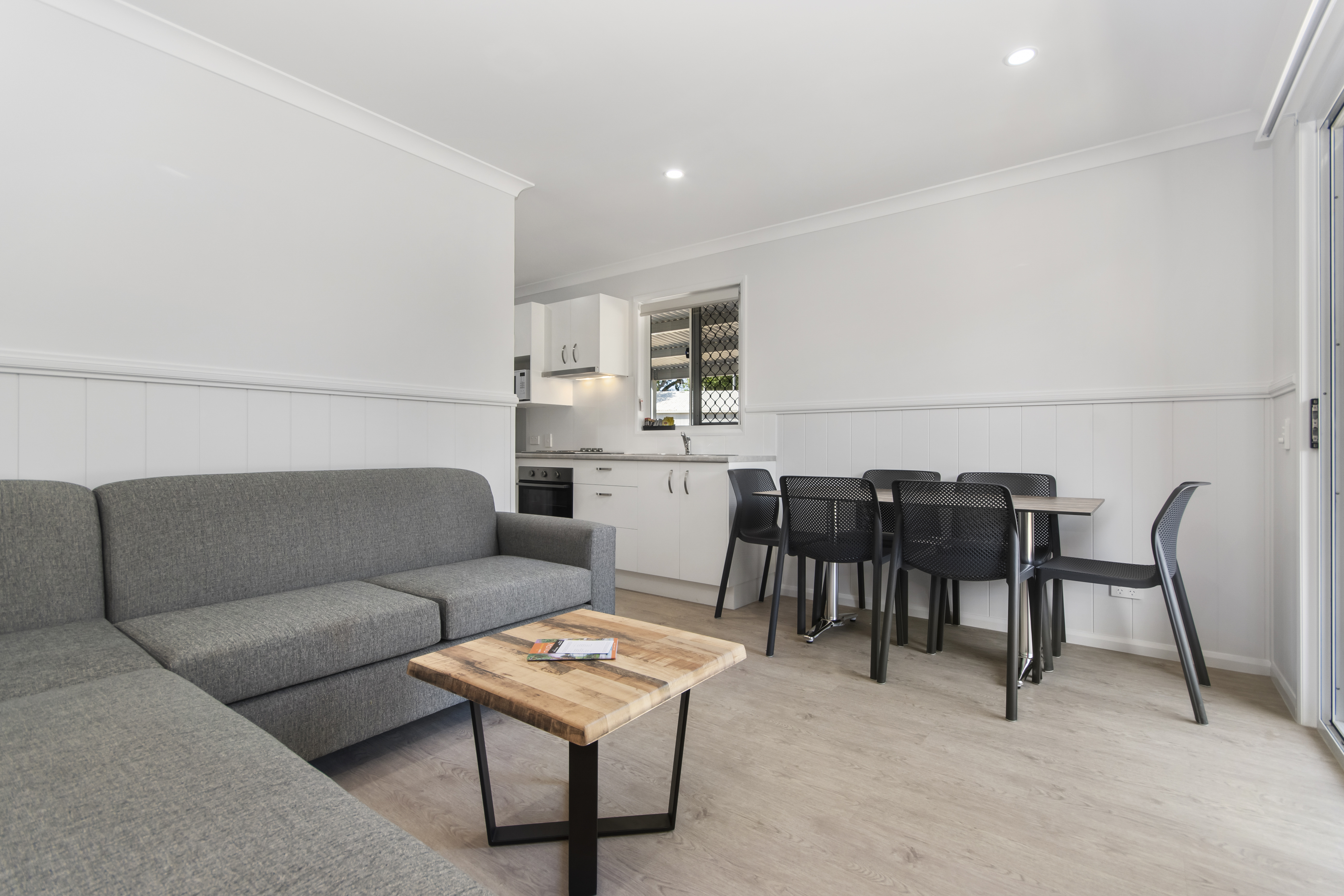 Enjoy a comfortable modern stay. Our 2 Bedroom Deluxe Villas sleep up to six guests with a queen bed in the main bedroom and 2 bunks in the second bedroom, as well as a bathroom, modern living area, kitchen, internal laundry, and private deck.