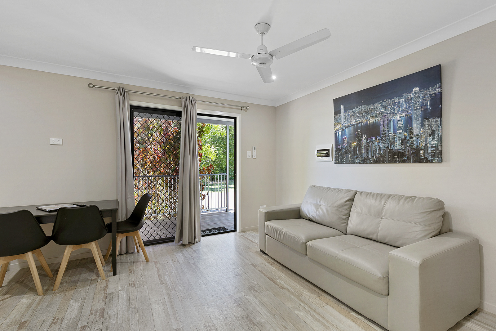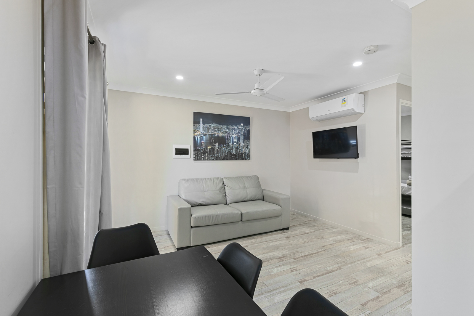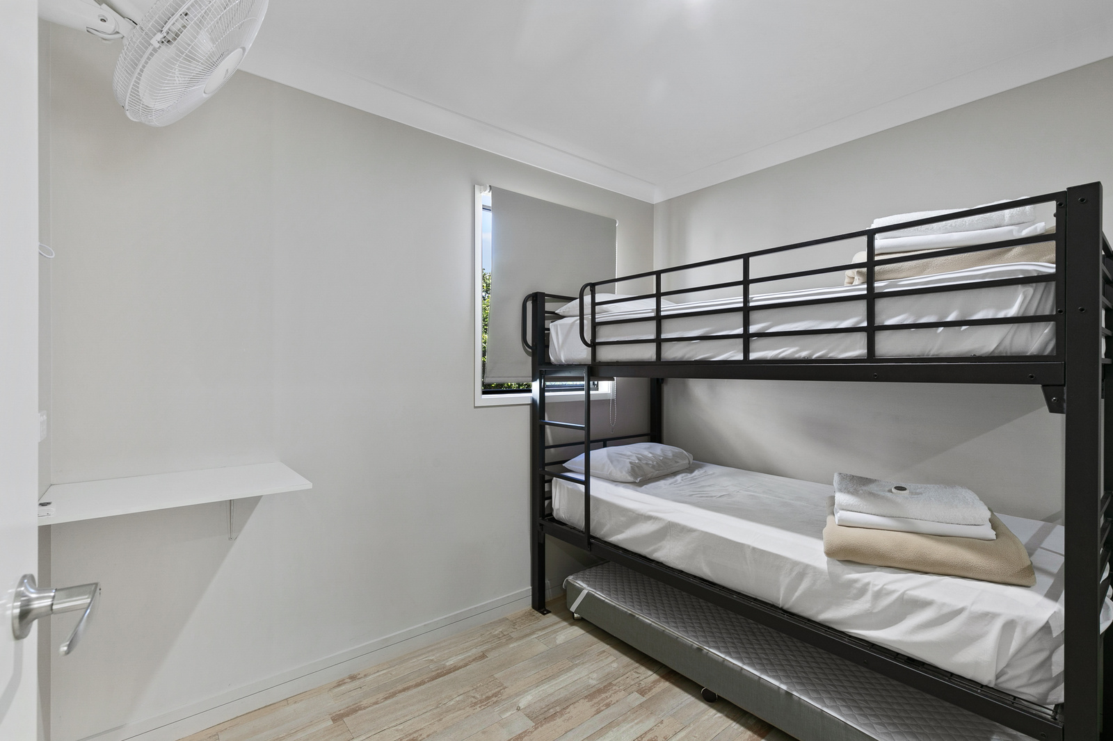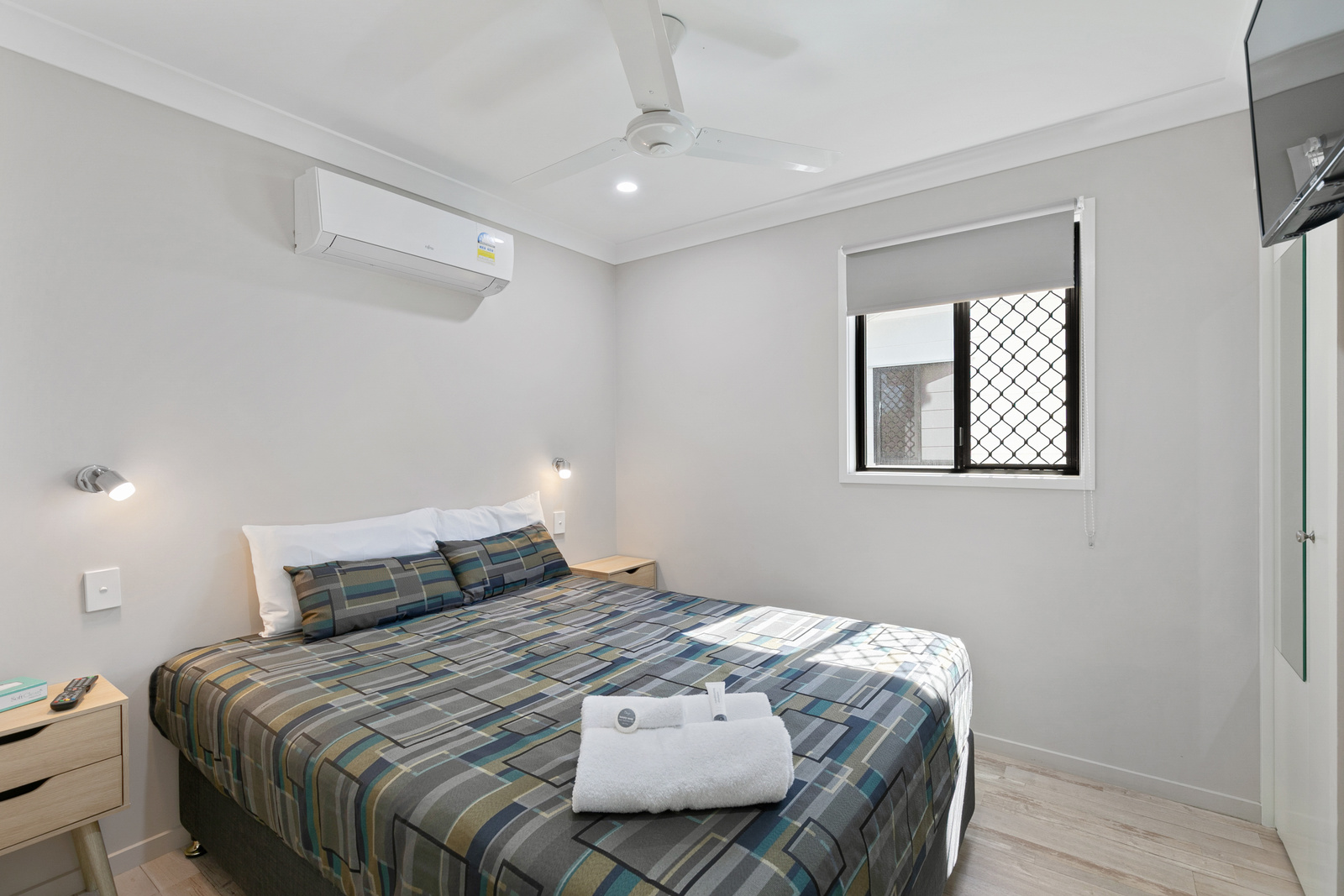 Stay in inviting comfort and luxury. Our 2 Bedroom Villa sleeps up to six guests with a queen bed in the main bedroom and a bunk and additional trundle in the second bedroom, as well as a bathroom, living area with sofa bed that folds out into a double bed, kitchen, and private deck.