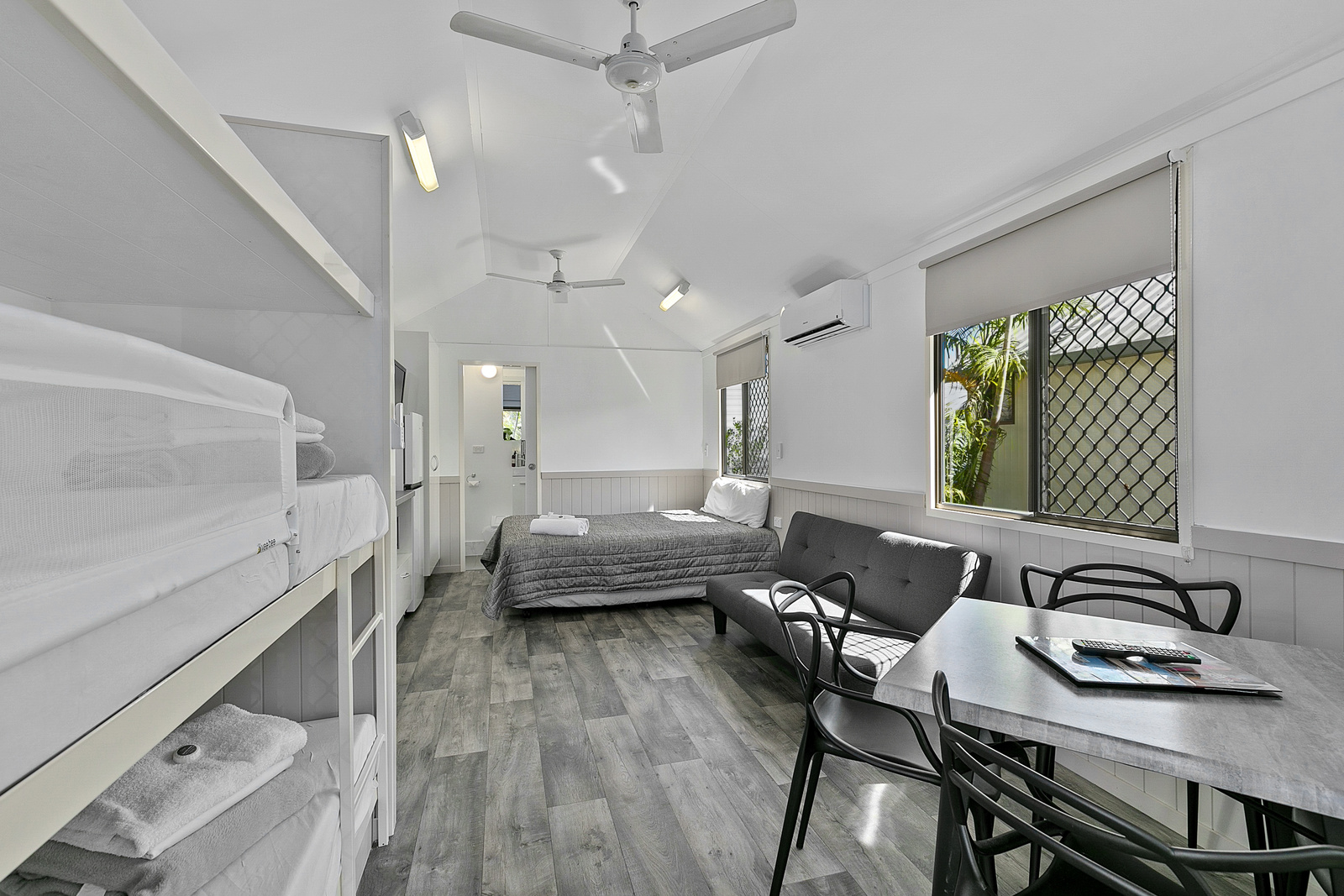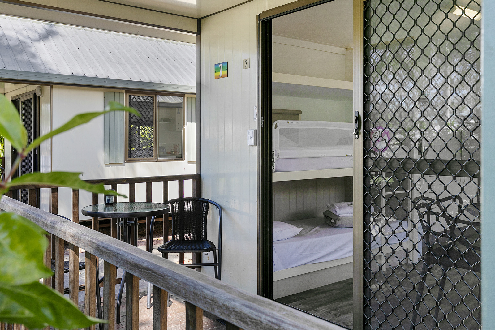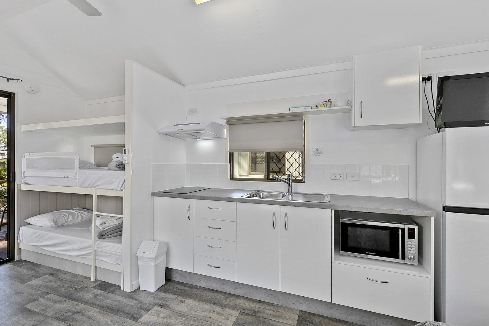 Enjoy modern comfort and privacy. Our Deluxe Ensuite Cabins sleep up to four guests (2 adults and 2 children) with a queen bed and a kids bunk built into the wall, as well as a living area and kitchenette in an open plan space, plus a private bathroom and private deck.