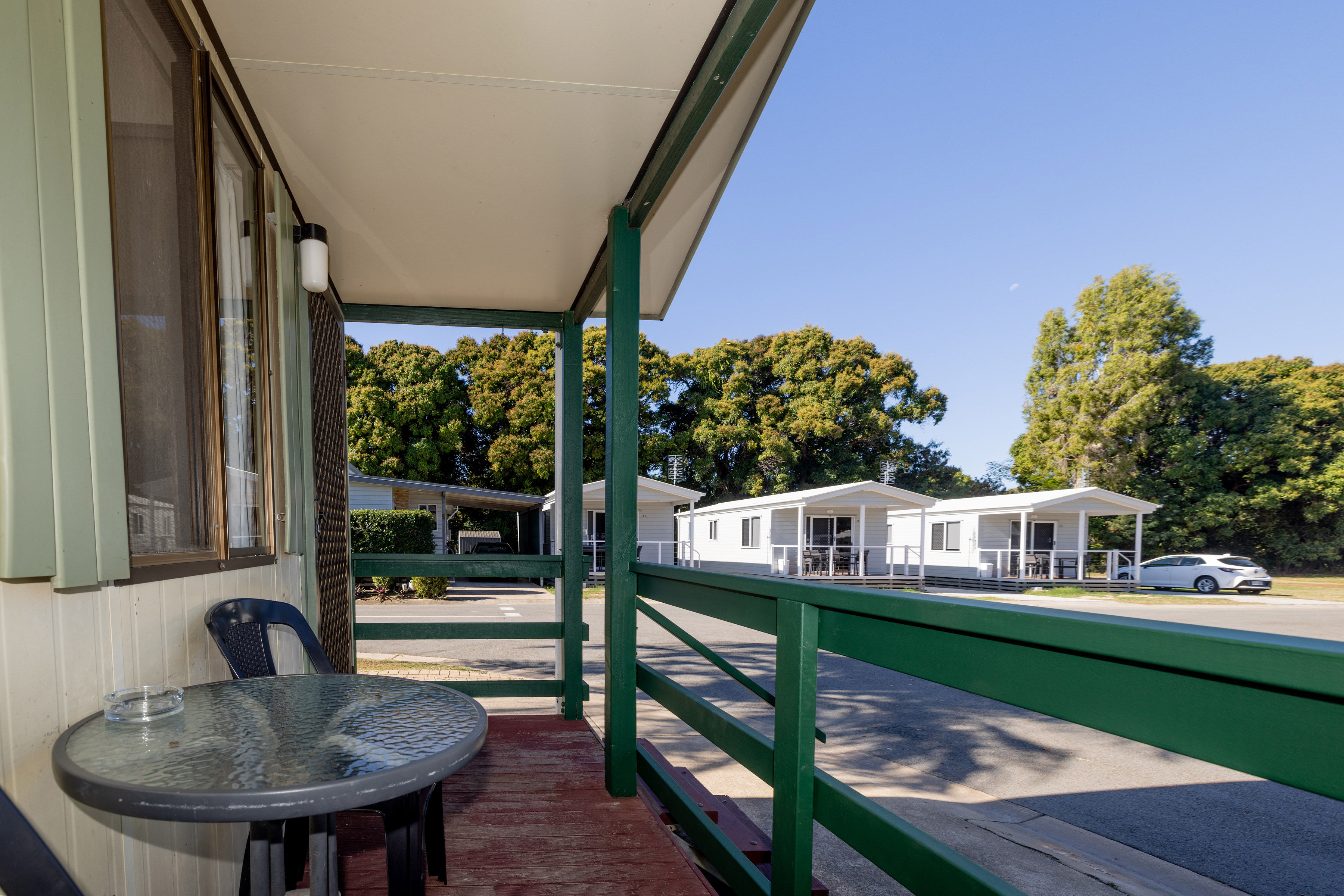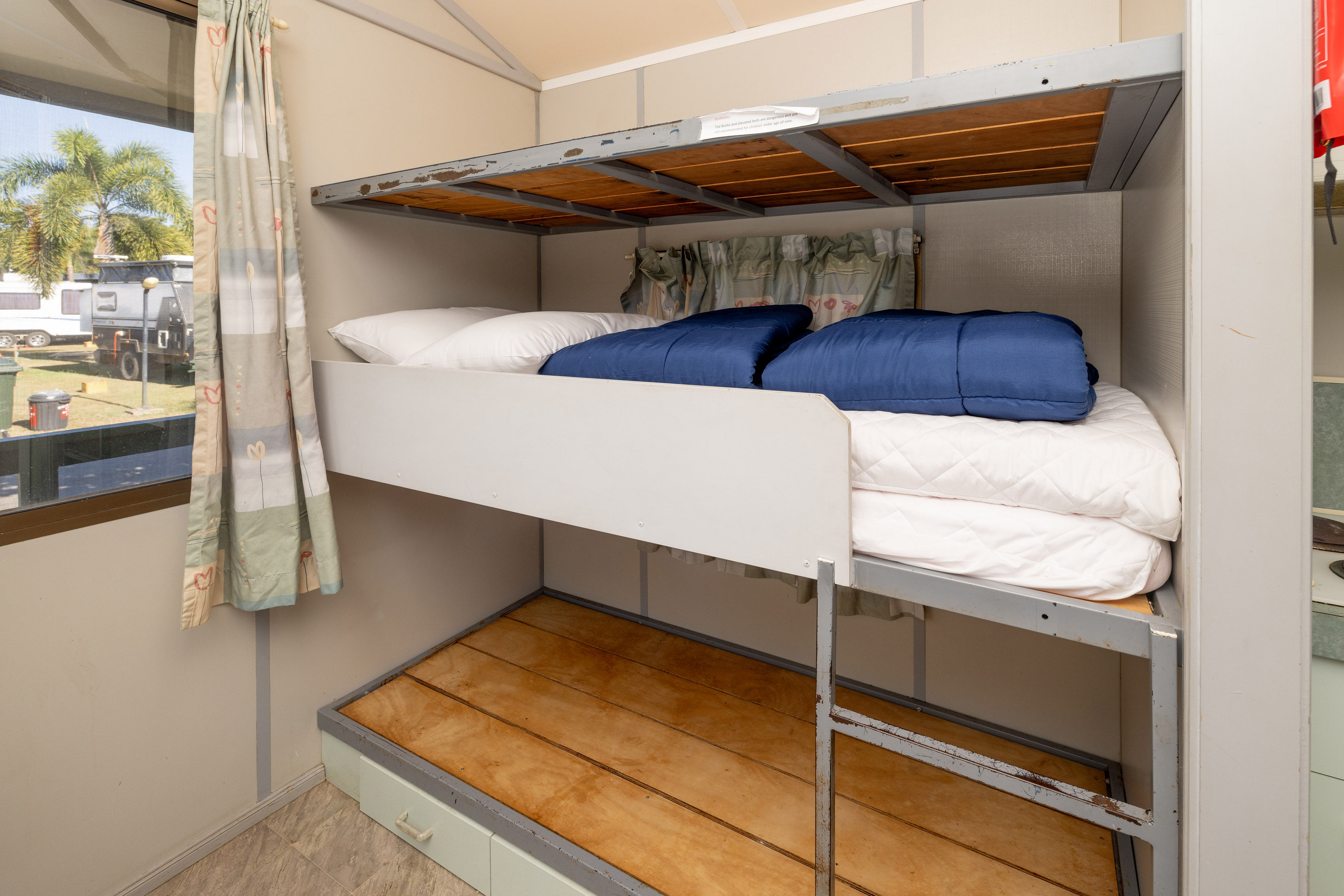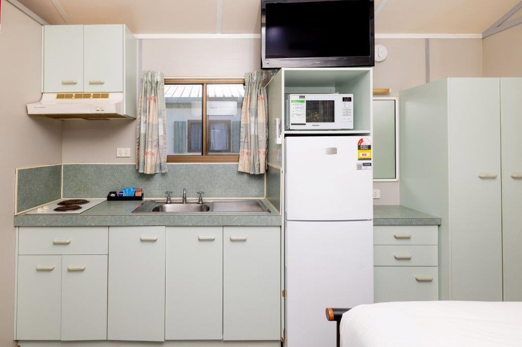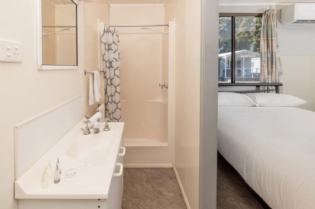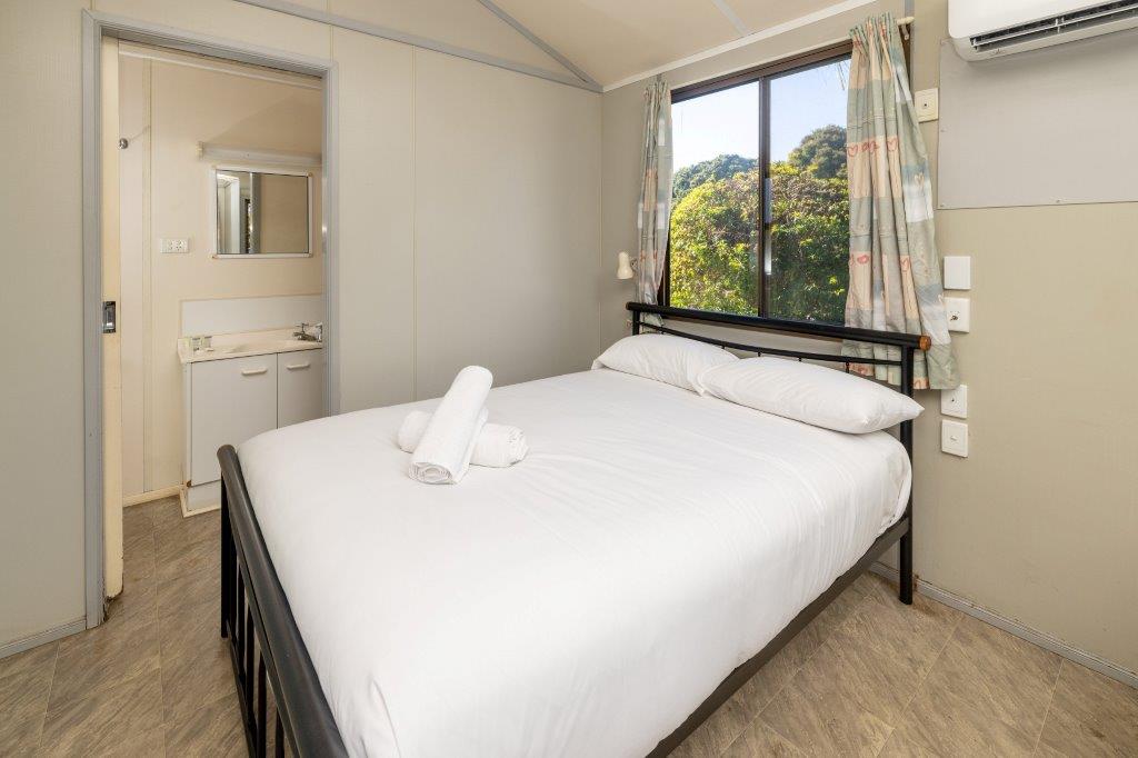 This compact studio sleeps up to four with a double bed and bunk set in an open-plan layout. Includes air conditioning, kitchenette with fridge, microwave and portable double cooktop, and private bathroom. A practical pick for budget-conscious guests wanting comfort and access to park facilities.