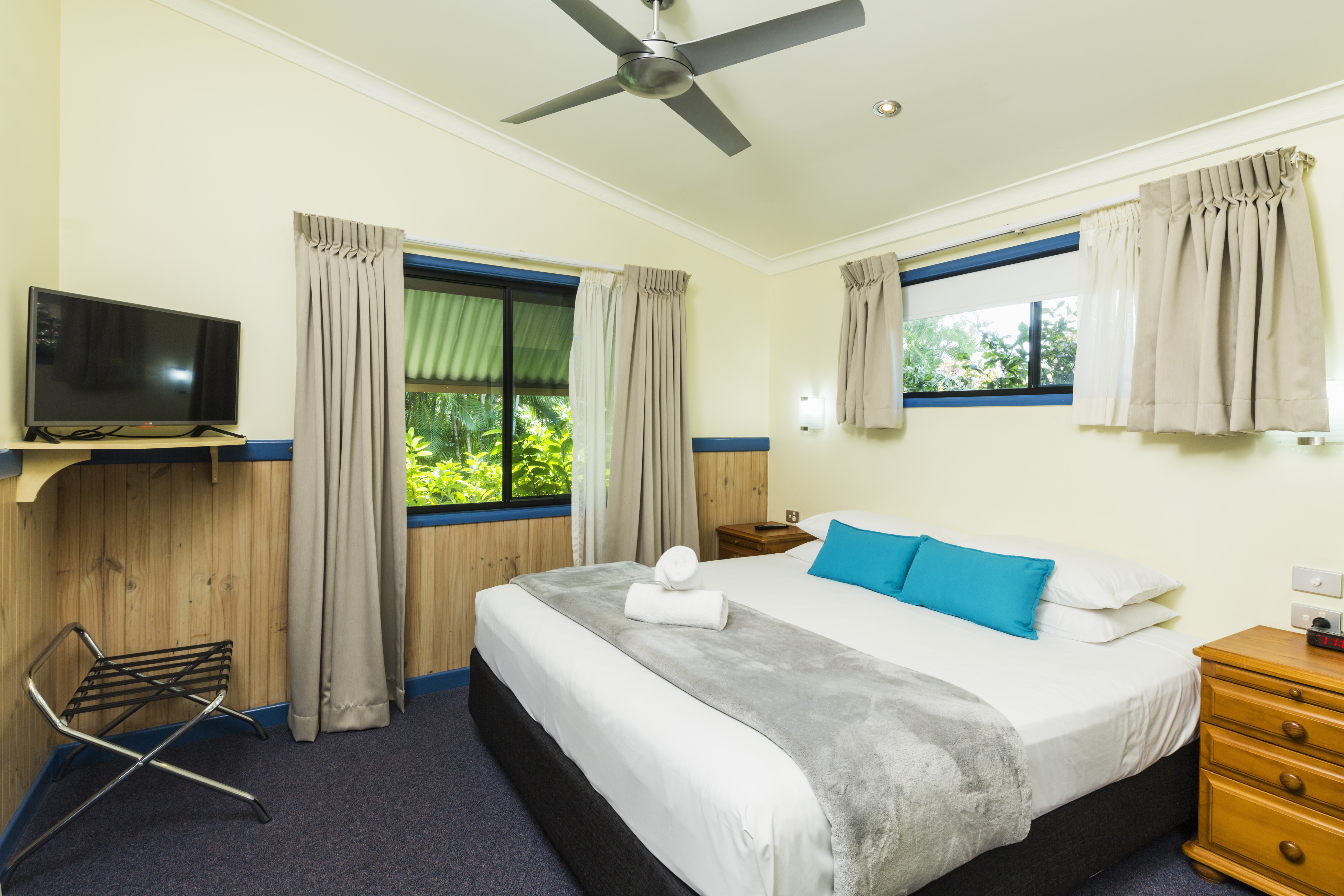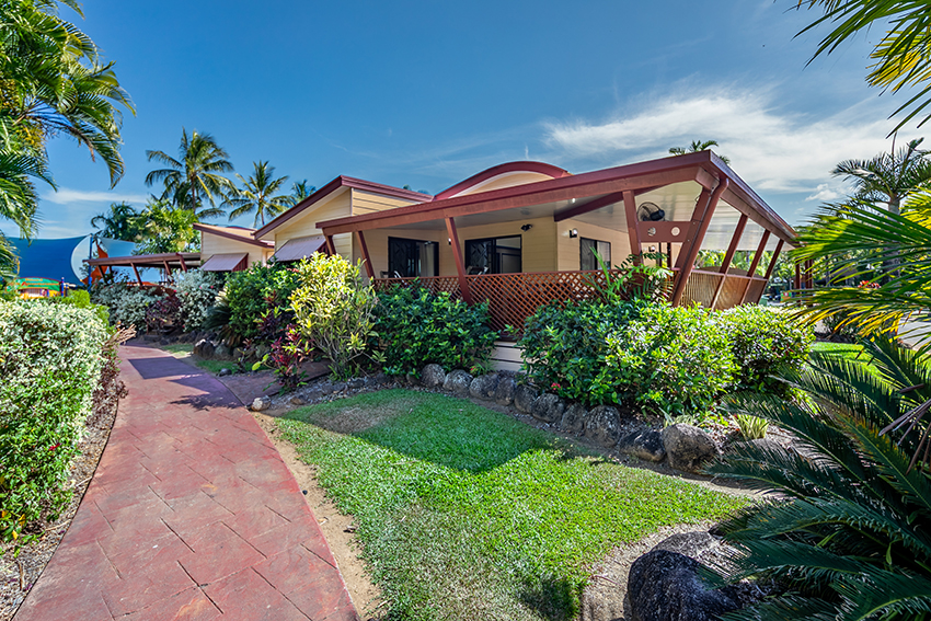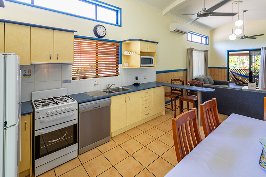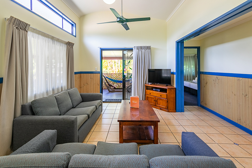 Our 3 Bedroom Coconut Villas sleep up to ten guests with a king bed and ensuite in the main bedroom which opens to a patio, a queen bed in the second bedroom and two bunks in the third bedroom, as well as a fold-out couch in the living area. They also feature a second bathroom, kitchen, internal laundry, and a private deck.